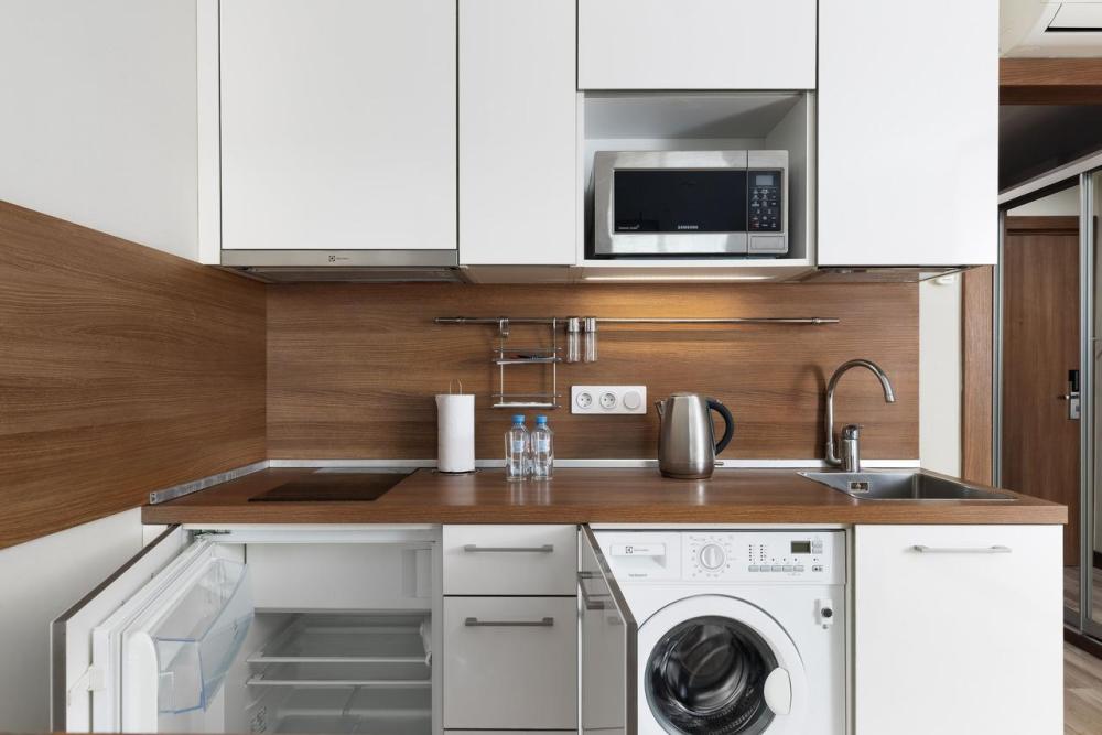 Апартаменты категории Standard идеально подойдут для проживания 1-2 человек. Интерьеры апартаментов выполнены в спокойных бежево-коричневых тонах. Кухня оснащена встроенной бытовой техникой от ведущих европейских производителей: микроволновая печь, холодильник, керамическая варочная панель, стиральная машина. В обеденной зоне располагается стол на несколько персон и комфортабельные смарт-стулья, которые легко подстраиваются под вас. В зоне гостиной располагается двуспальная кровать с ортопедическим матрасом и подъемным механизмом. Для работы оборудовано специальное место с рабочим столом и комфортабельным креслом.