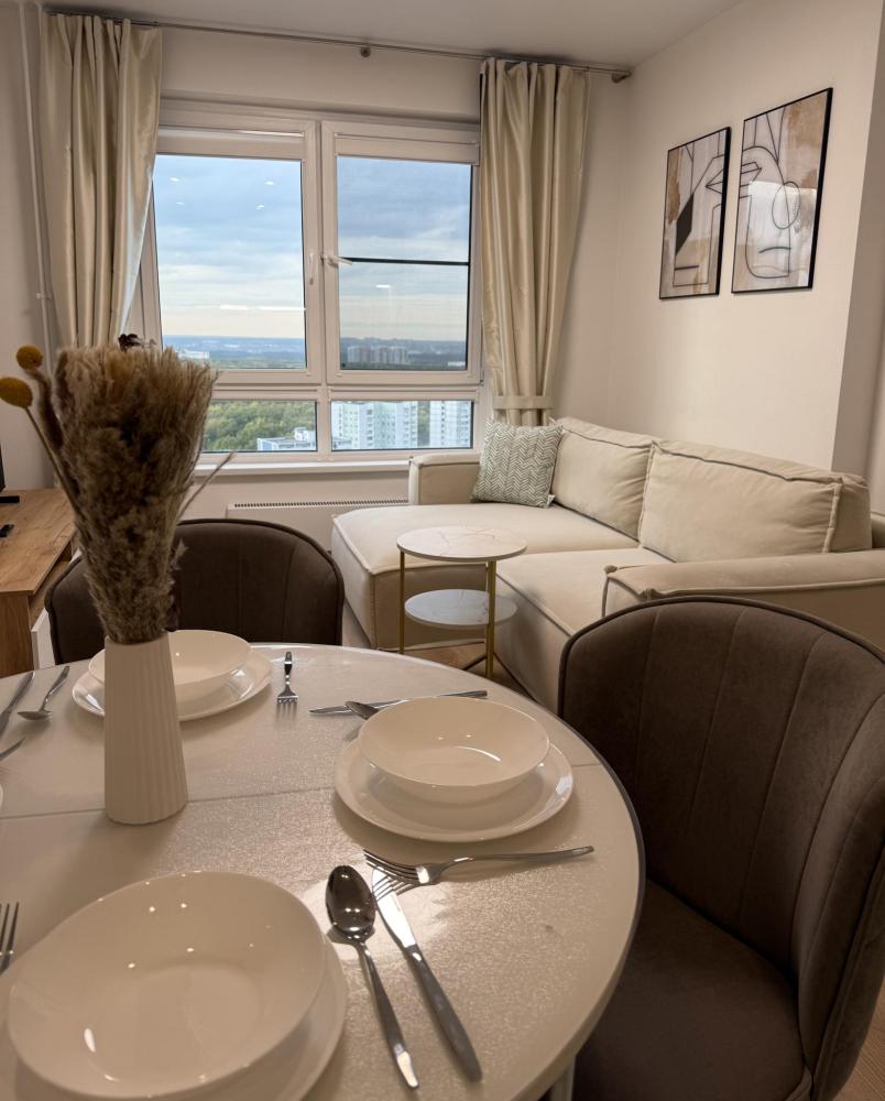 Однокомнатная квартира с вместимостью до 4 гостей. В квартире есть все, что нужно для комфортного проживания: двуспальная кровать, раскладной диван, WiFi, телевизор, стиральная машина, микроволновая печь, электрический чайник, полотенца, постельное белье, посуда, столовые...