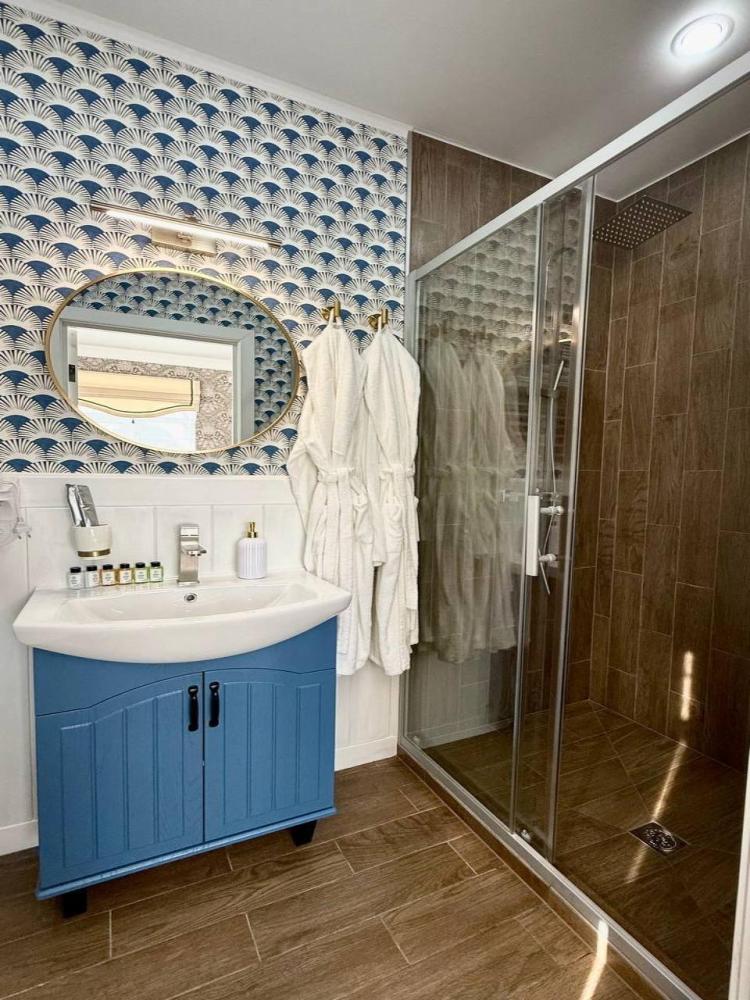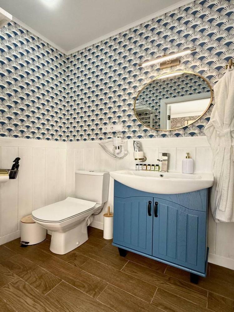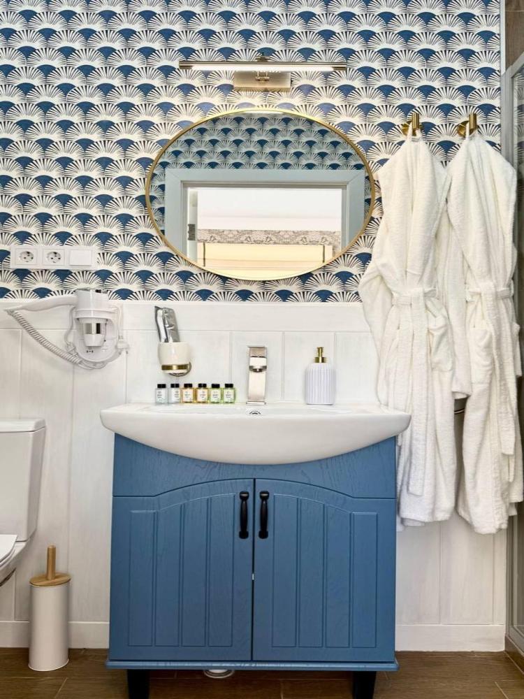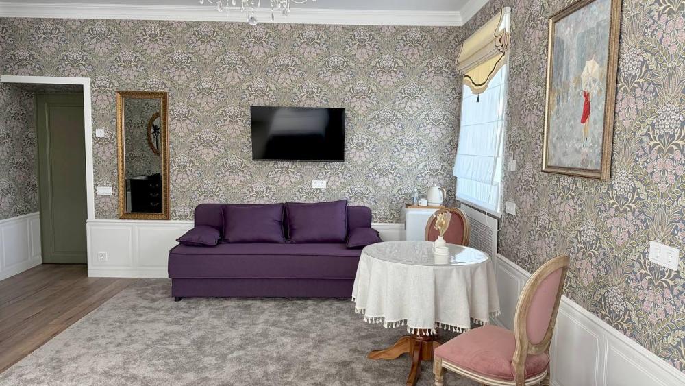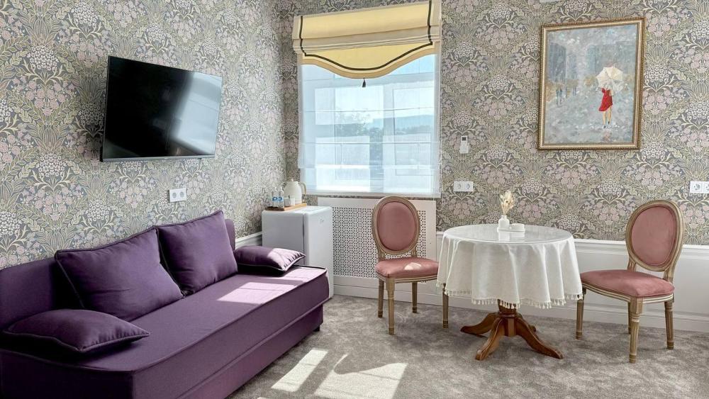 однокомнатный номер класса "Люкс", двуспальная кровать, размещение 2 основных места + 1-2 платное дополнительное место на большом раскладном диване, мини-холодильник, кондиционер, тёплый пол, шторы блэкаут, ванная комната с тропическим душем, фен, набор полотенец, шампунь/кондиционер для волос/гель для душа/мыло/зубной набор, тапочки, халат