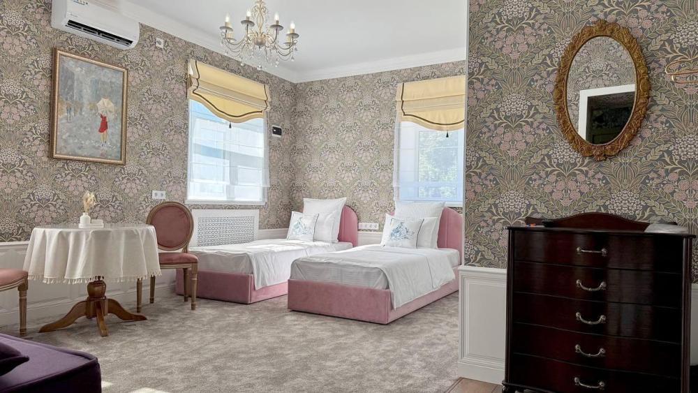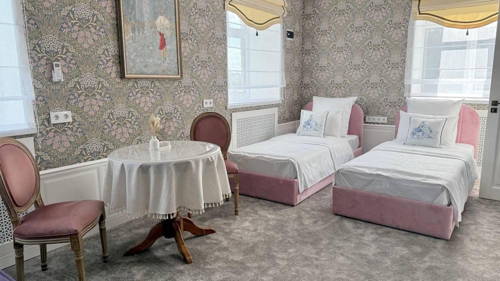 Дизайнерский номер категории "Полулюкс". Две односпальные кровати, размещение 2 основных места + 1 платное дополнительное место на диване, мини-холодильник, кондиционер, тёплый пол, ванная комната с тропическим душем, фен, набор полотенец, шампунь/кондиционер для волос/гель для душа/мыло/зубной набор,тапочки, халат