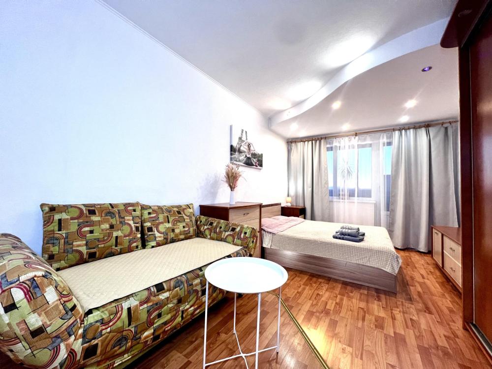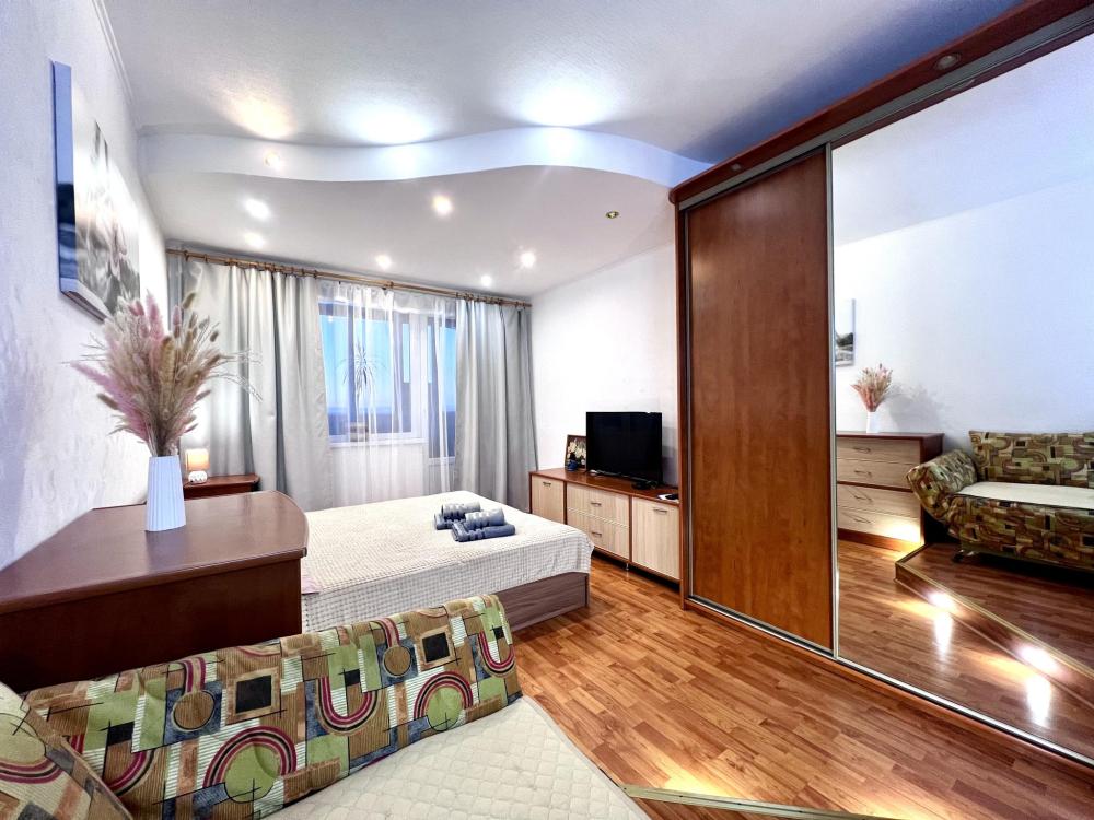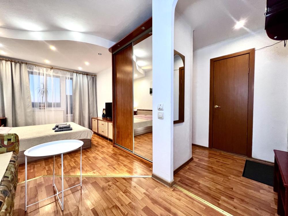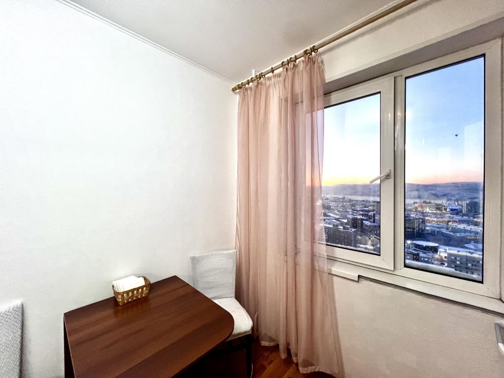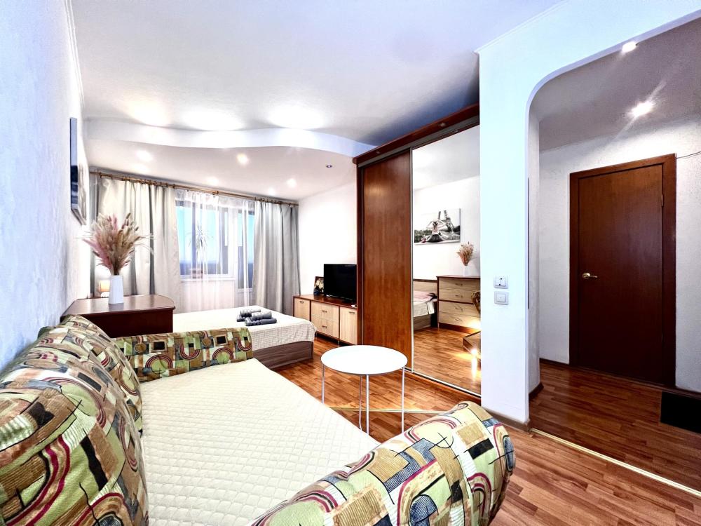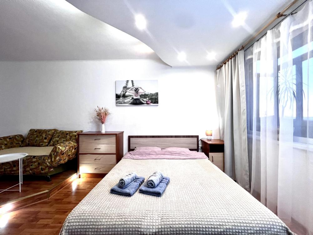 Однокомнатная квартира c видом на город. Спальных мест 3, двуспальная кровать и диван. В стоимость проживания входит: безлимитный wi-fi интернет, кабельное телевидение, полные комплекты постельного белья из высококачественного сатина и комплекты полотенец, полностью оборудованная посудой и техникой кухня, чай, сахар, соль, в ванной комнате стиральная машина, фен, гигиенические принадлежности (жидкое мыло для рук, стиральный порошок, туалетная бумага, средства для мытья посуды), гладильная доска, утюг и другие приятные мелочи.