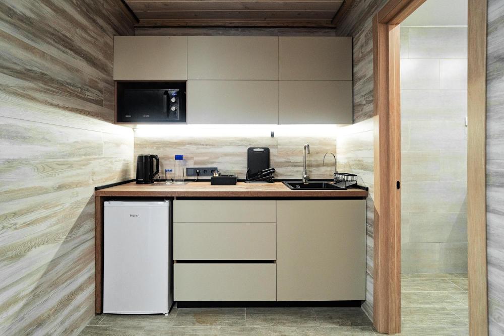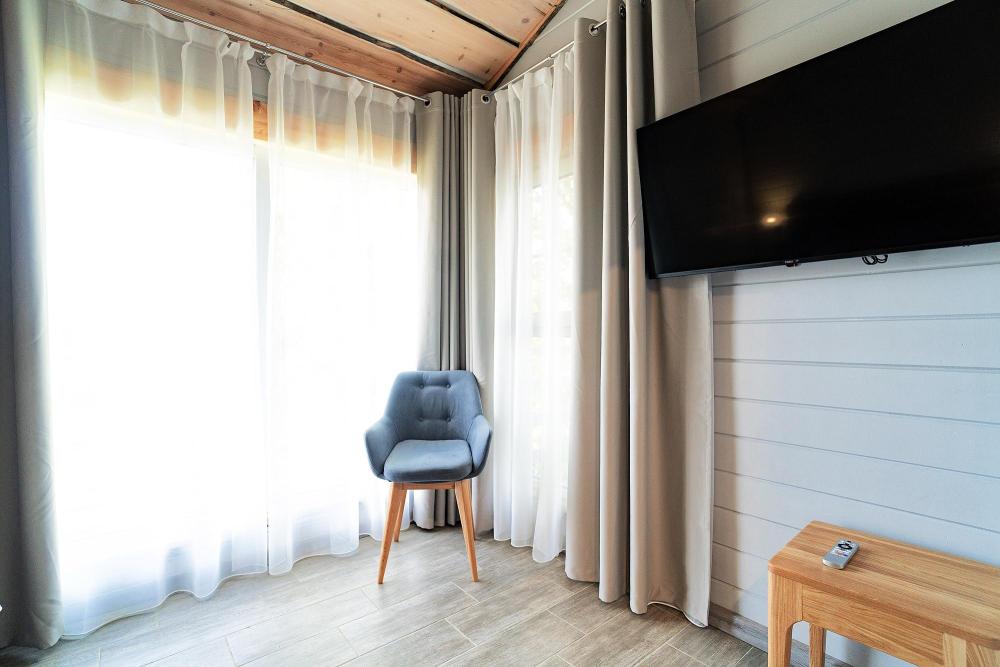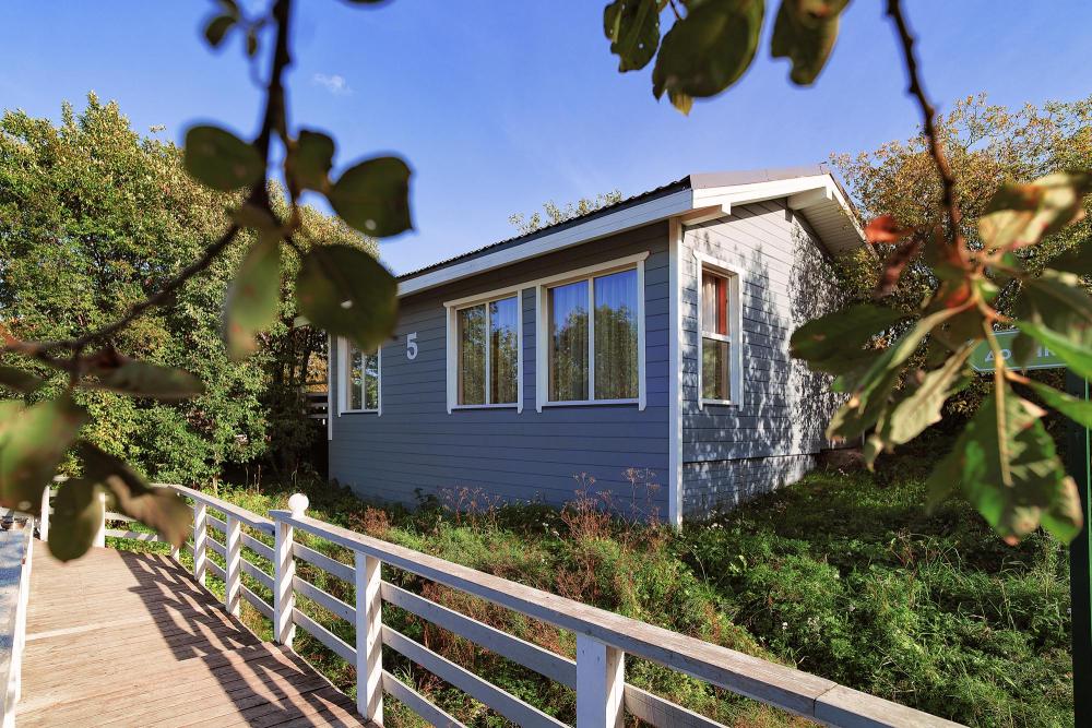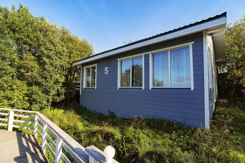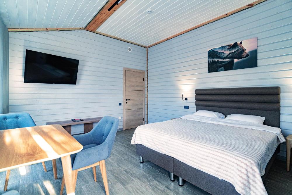 Коттедж общей площадью 25 кв.м. для размещения до 2-х гостей, также имеется дополнительное место для третьего гостя. Для комфортного проживания гостей дом оснащен всем необходимым: одна двуспальная кровать, шкаф-купе, кресло, стол, ЖК - телевизор, сейф, обогрев номера круглый год, ванная комната, душ, фен, набор полотенец, туалетно-гигиенические принадлежности.