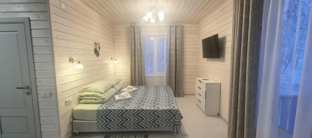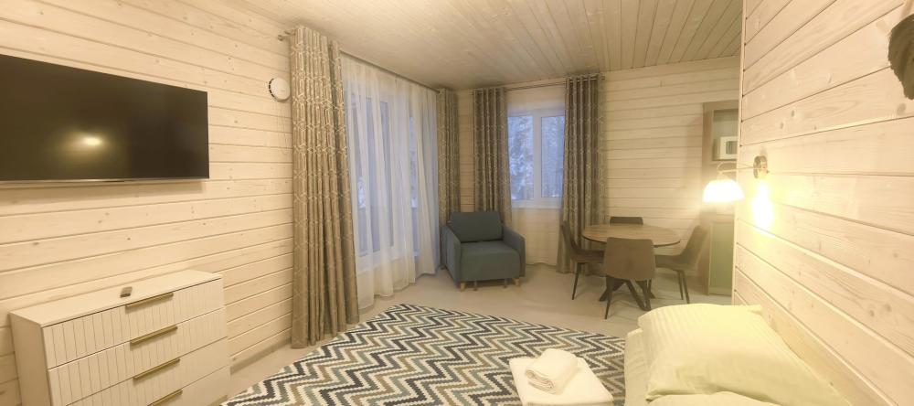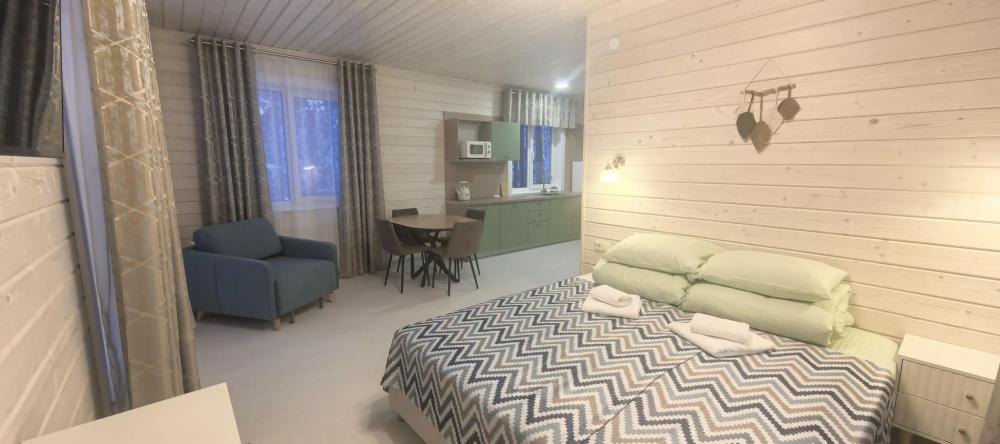 Уютный коттедж с индивидуальной системой отопления и сауной, оборудован небольшой террасой. Коттедж построен из экологически чистого материала, хорошо отапливается, есть горячее водоснабжение. В доме есть ванная комната с душем, сауной и бесплатными туалетно-косметическими принадлежностями. Площадь 42 м2, рассчитан на комфортное размещение до 3 человек. Коттедж оборудован: - двуспальной кроватью-трансформером (при желании их можно превратить в две односпальные кровати); - креслом-кроватью; - журнальным столиком; - комодом; - миникухней (включает холодильник, чайник, микроволновую печь, посуду, настенные шкафчики); - ванной комнатой (включает душевую кабину, санузел, раковину, фен, полотенца); - сауной с принадлежностями; - открытой террасой со столиком и стульями. Рядом с коттеджем находится мангальная зона, где есть мангал и стол со скамейками.