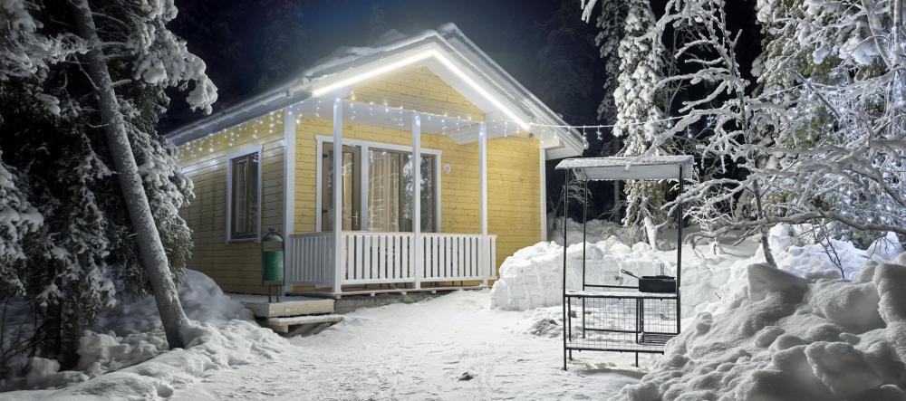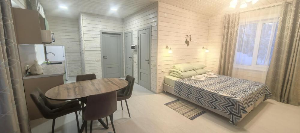 Уютный одноэтажный коттедж с индивидуальной системой отопления, оборудованный собственной небольшой террасой и уличной мангальной зоной. Коттедж построен из экологически чистых материалов, хорошо отапливается, есть горячее водоснабжение. В коттедже есть ванная комната с душем и бесплатными туалетно-косметическими принадлежностями. Площадь 36 м2, рассчитан на комфортное размещение до 4 человек. Коттедж оборудован: - двуспальной кроватью-трансформером (при желании их можно превратить в две односпальные кровати); - двумя односпальными креслами-кроватями; - журнальным столиком; - комодом; - миникухней (включает холодильник, чайник, микроволновую печь, посуду, настенные шкафчики); - ванной комнатой (включает душевую кабину, санузел, раковину, фен, полотенца); - открытой террасой со столиком и стульями. Рядом с коттеджем находится мангальная зона, где есть мангал и стол со скамейками.