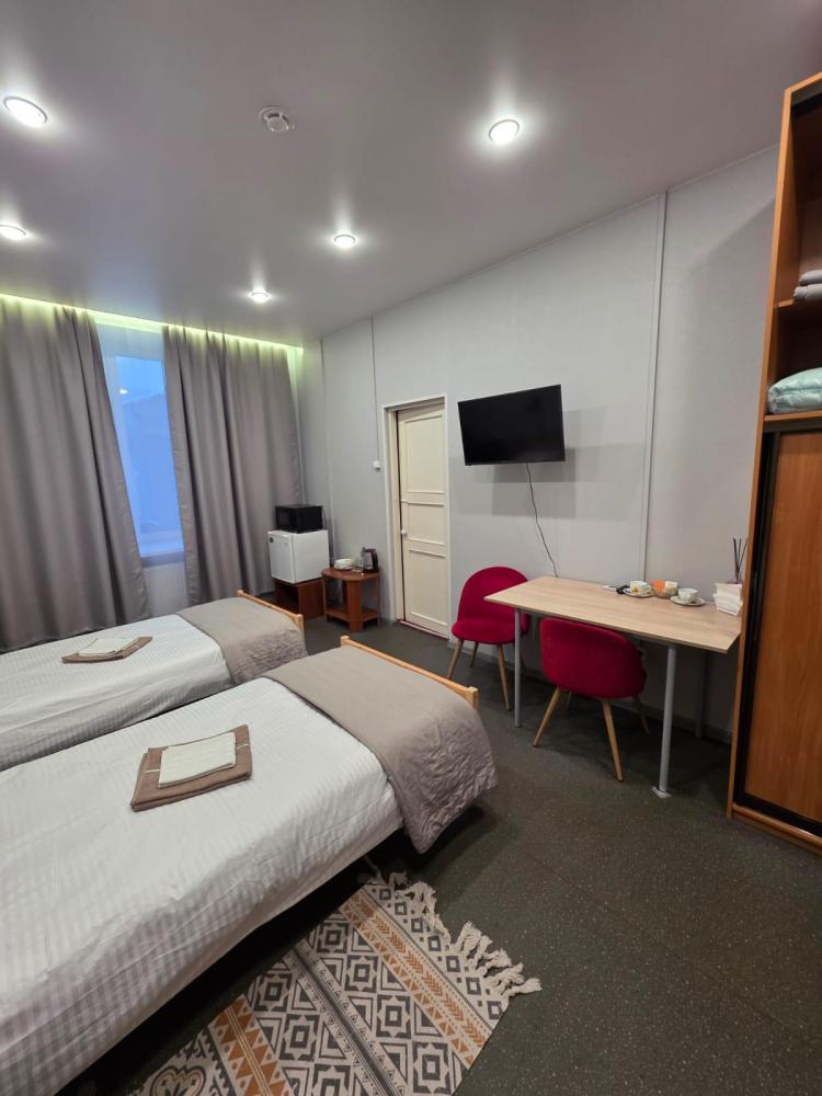 Стандартный улучшенный номер. Вместимость до 2х человек. В номере: две односпальные кровати; прикроватные тумбочки; шкаф для одежды; телевизор; микроволновая печь; мини холодильник. Душевая; санузел находятся на этаже