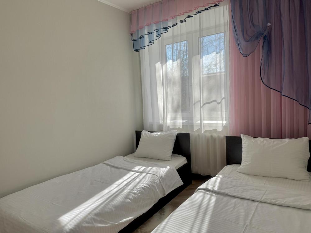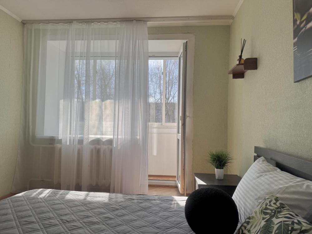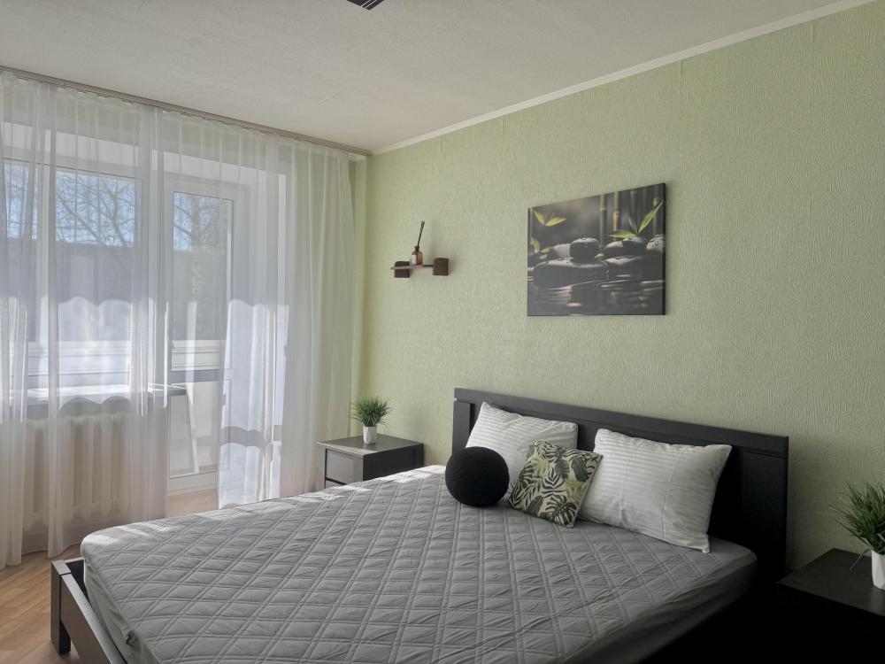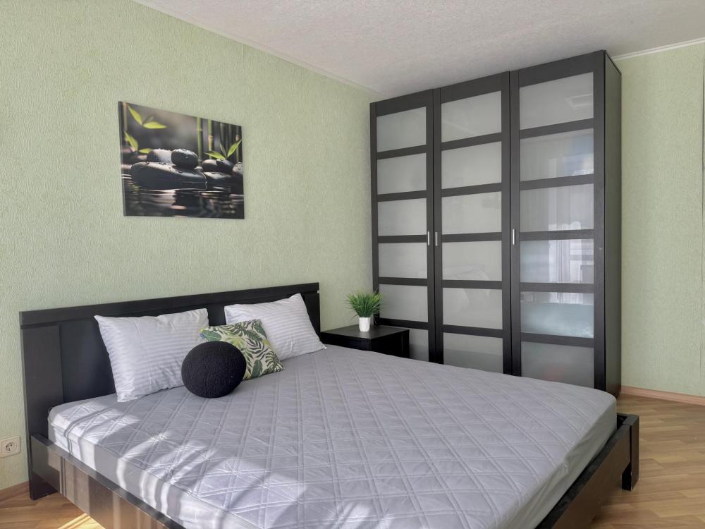Приветствуем в квартире сети "Саквояж". Расположена в центре города, рядом с достопримечательностями, магазинами и транспортной развязкой. Вмещает до 7 человек. Спальные места: * Первая спальня: двуспальная кровать 180x200, телевизор. * Вторая спальня: две односпальные кровати 90x200. * Гостиная: двуспальный и односпальный диваны, телевизор, кондиционер. Оснащение: СВЧ, стиральная машина, холодильник, утюг, кондиционер.
