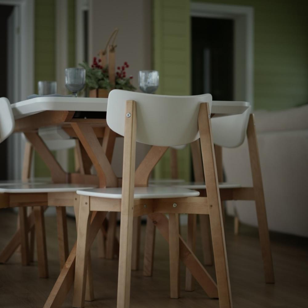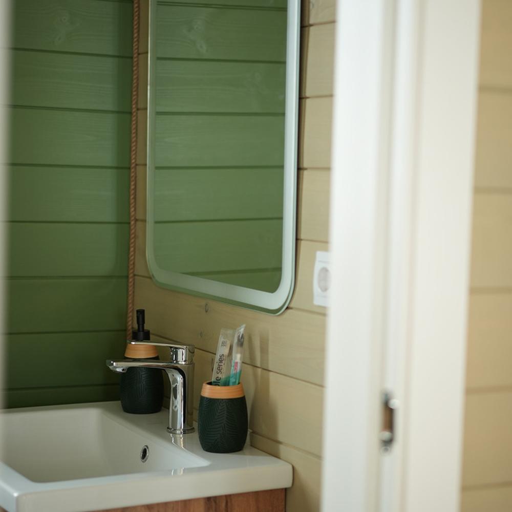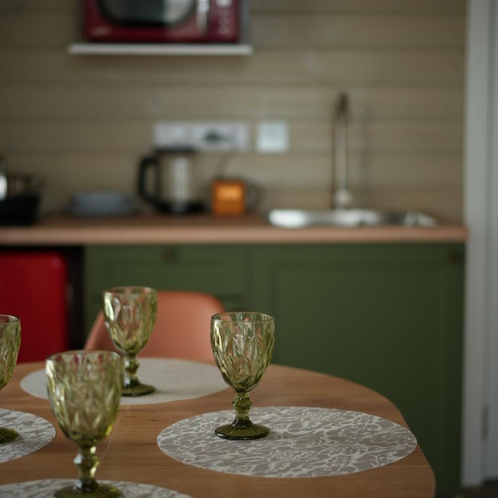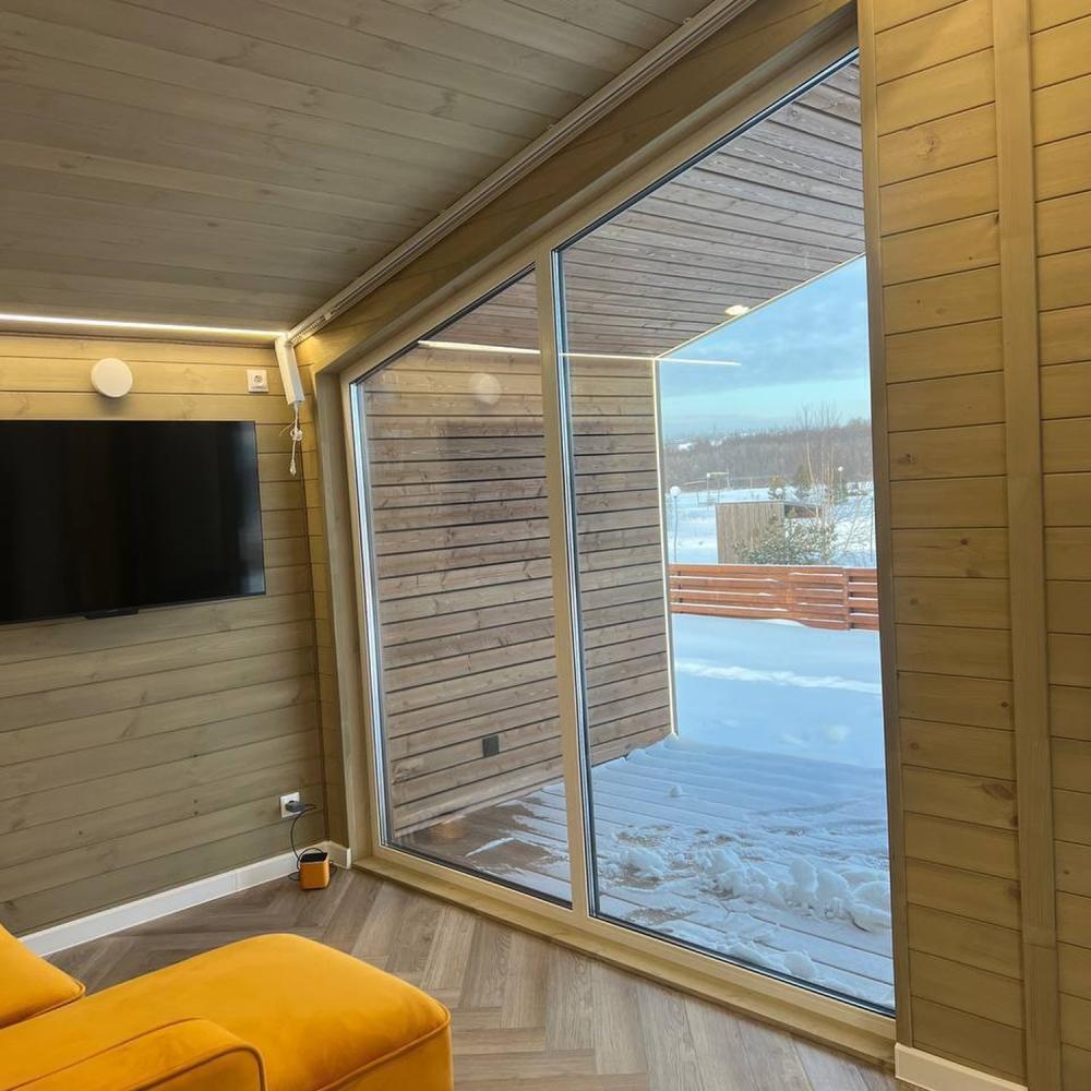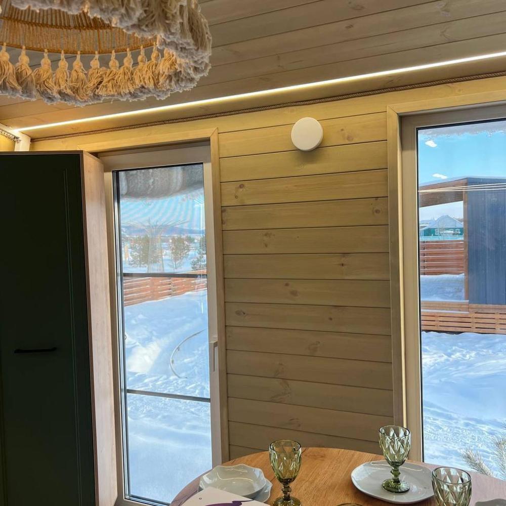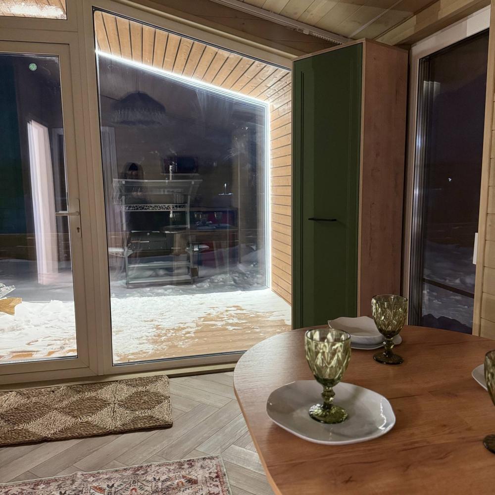 Самый “семейный” и самый “праздничный” домик. Тут классно собираться большой компанией: в гостиной - большой стол, много места, тёплая атмосфера, где хочется устраивать длинные ужины и встречи без спешки. Что внутри: 3 отдельные спальни с кроватями просторная гостиная раскладной диван (доп. спальное место)раскладной стол на 6-10 человек кухня со всей техникой и посудой2 ТВ Яндекс, Алиса с экраном. Лучший выбор для больших семей, нескольких пар или компаний, которые любят собираться вместе. Баня и чаны — отдельная причина приехать. После прогулок и свежего воздуха особенно приятно: прогреться в бане ,а потом расслабиться в чанах — это тот самый формат отдыха, после которого спишь крепко-крепко.