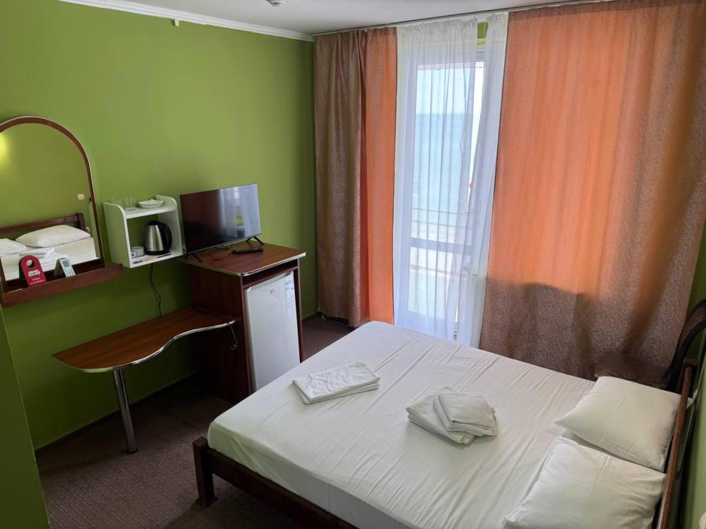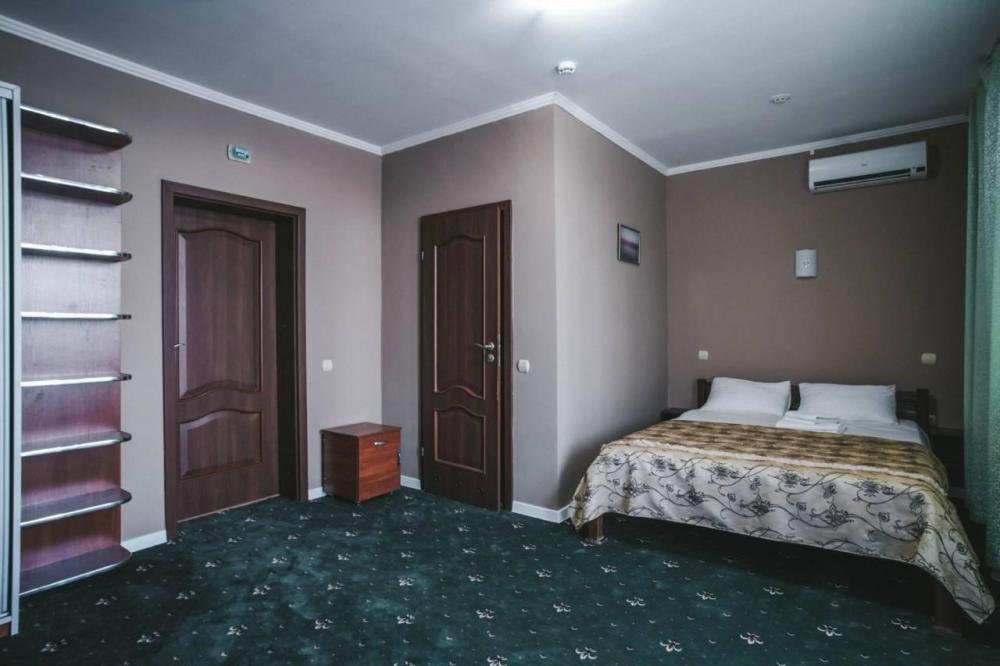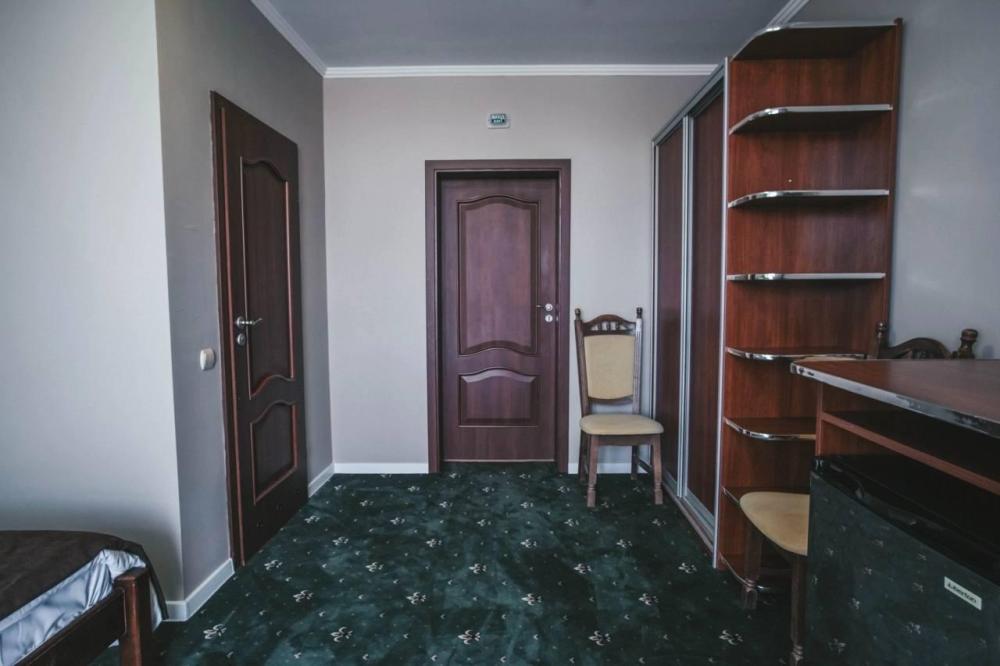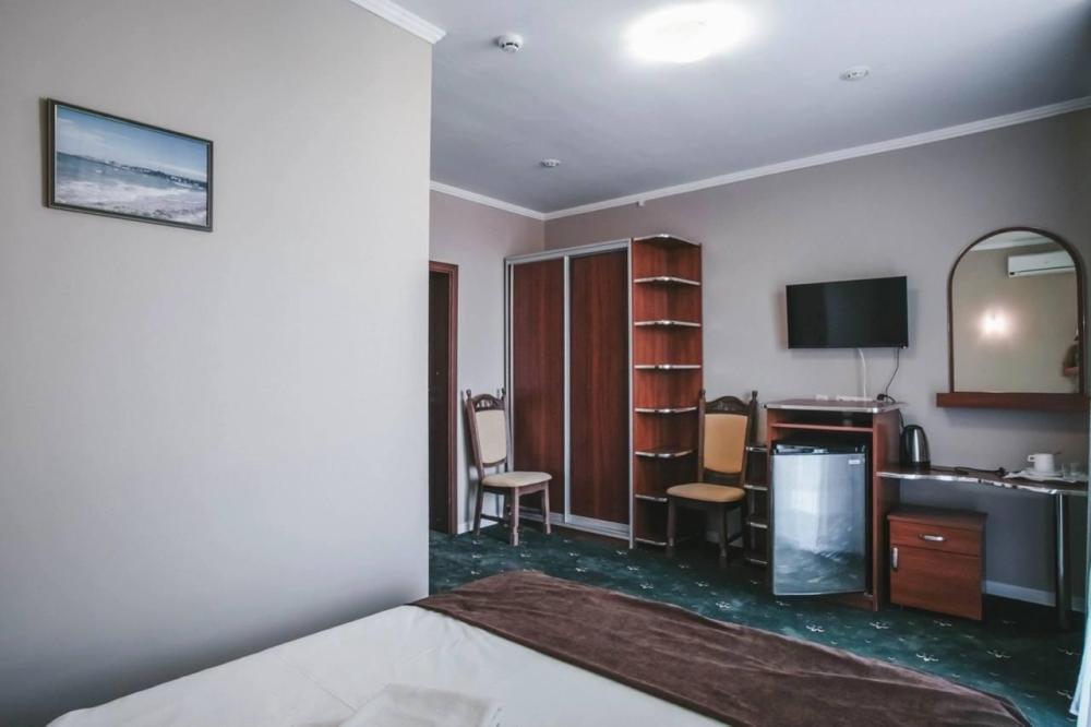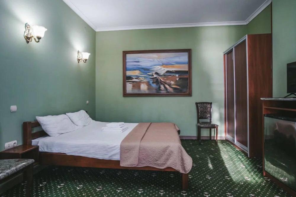 Просторный однокомнатный номер, оформленный в светлых тонах, что создает атмосферу спокойствия и расслабления. В номере есть все необходимое для проживания: удобная кровать с мягкими подушками и теплым одеялом, шкаф для одежды, телевизор с плоским экраном, холодильник, кондиционер и бесплатный Wi-Fi.