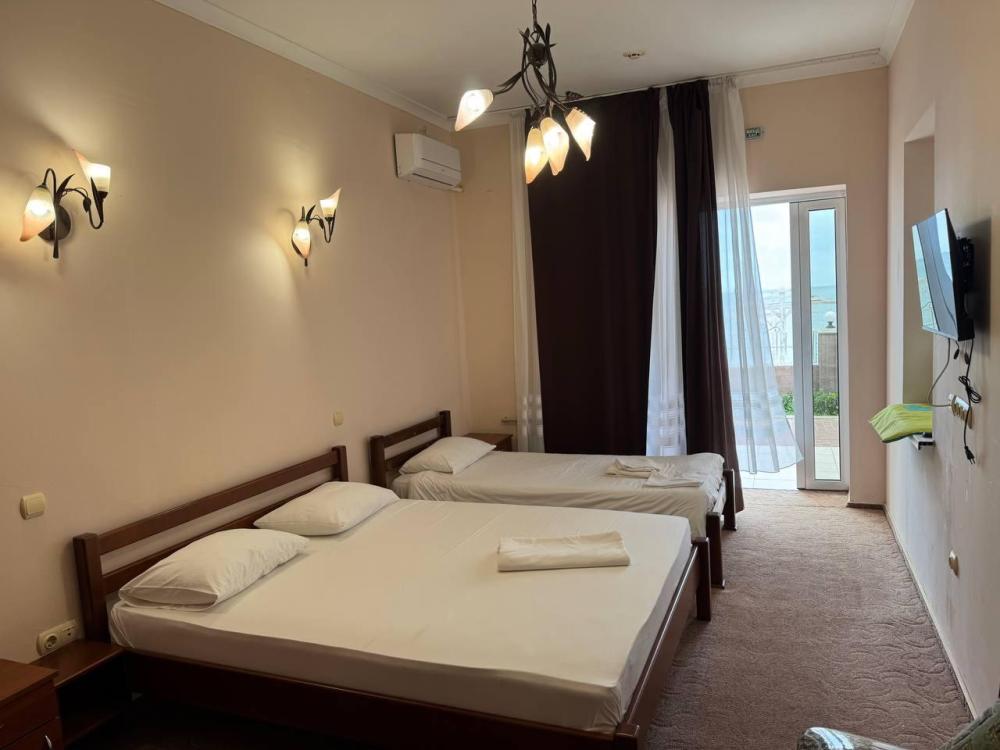 Номер класса «люкс» с видом на море. Номера расположены на 1 (№1-4) и 2 (№12-15) этажах, двухэтажного здания. с балконом или террасой. Максимальная вместительность номера до 4 человека. В номере 2-х спальная кровать, дополнительно - односпальная кровать, и диван. Удобства: плазменный телевизор, холодильник, утюг, шкаф, кондиционер, ванная.