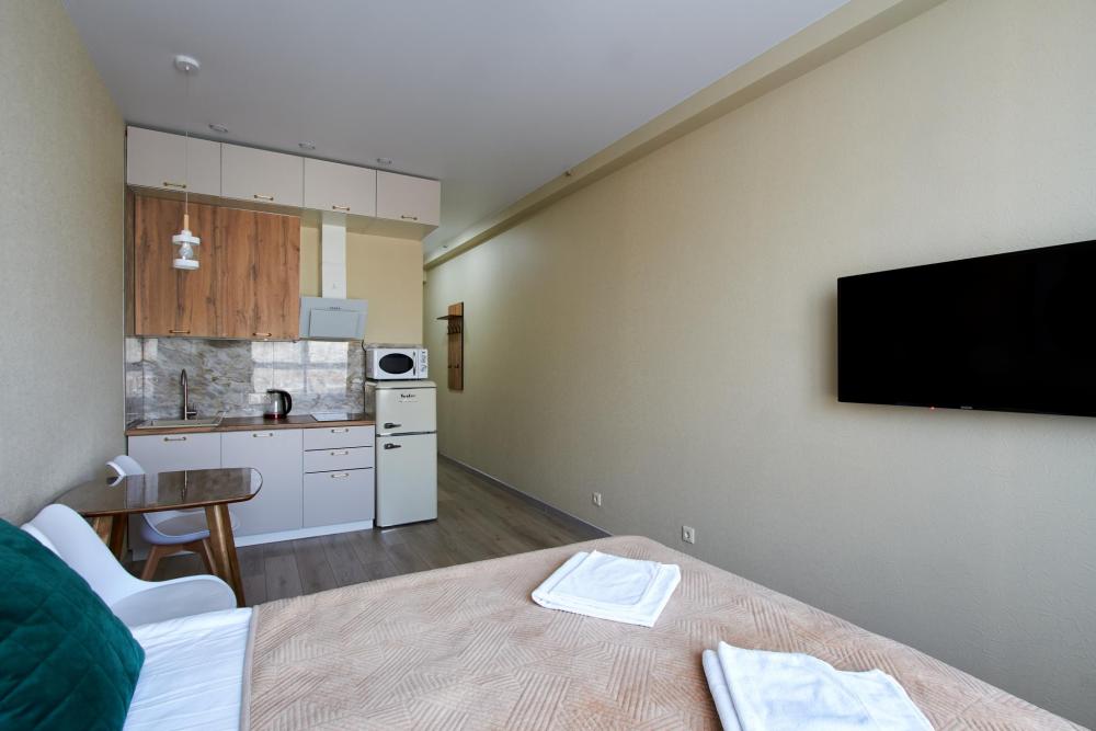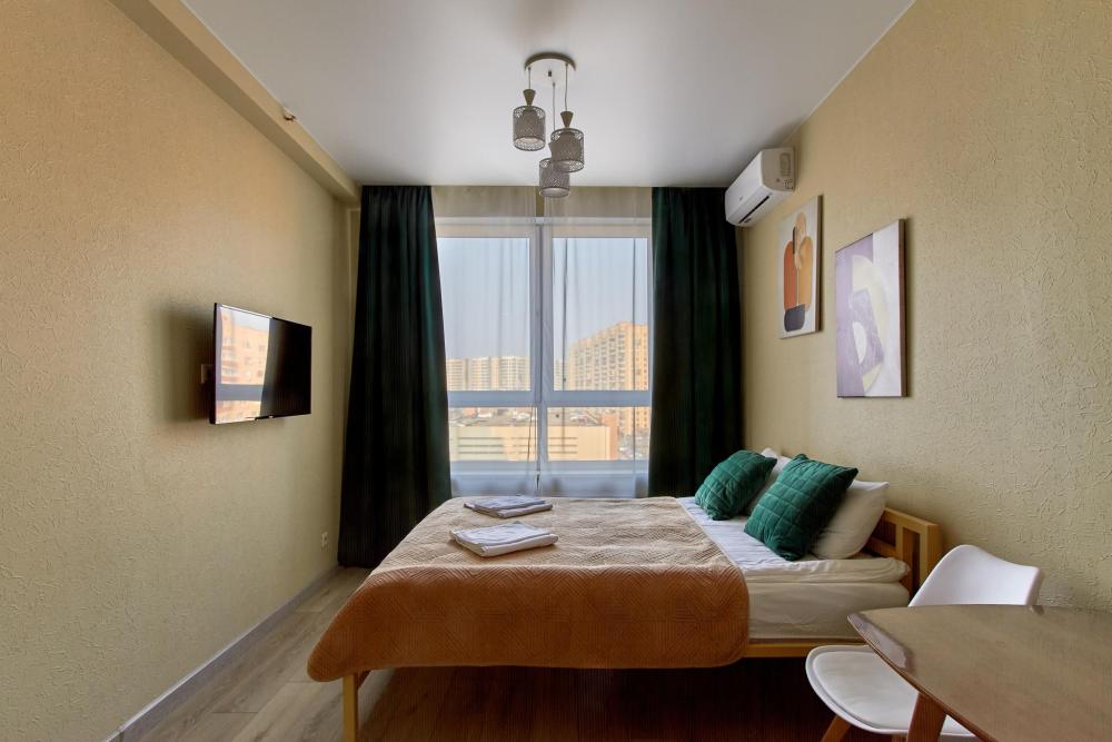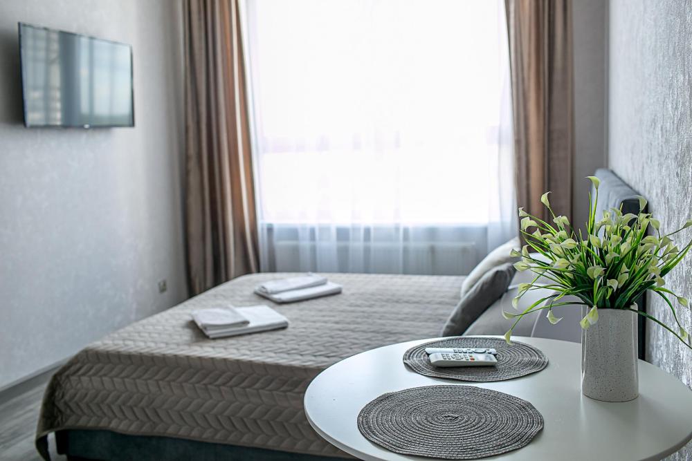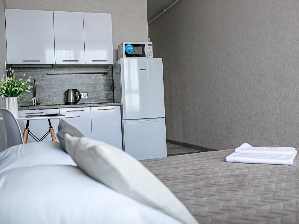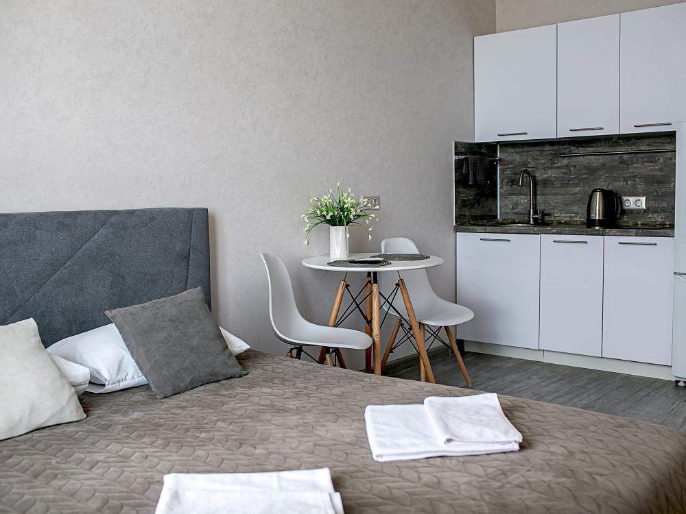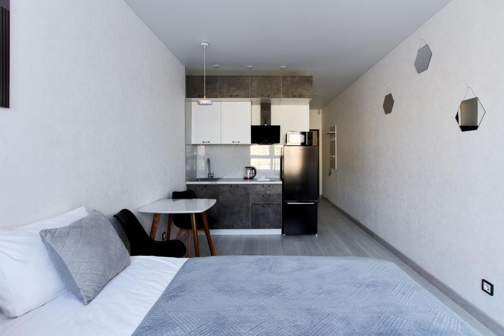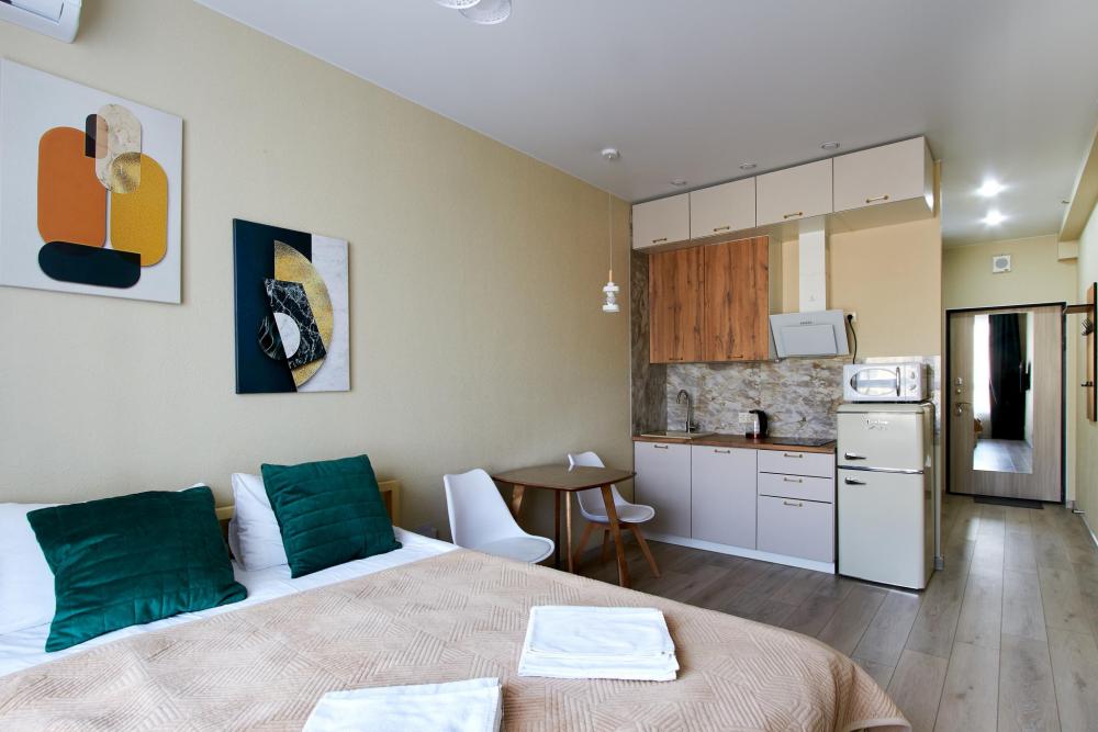 Апартаменты-студия подойдут для размещения 2 человек. Спальные места: двуспальная кровать. В квартире есть все необходимое для комфортного проживания: утюг, гладильная доска, стиральная машина, фен, Wi-Fi и Smаrt ТV. На кухне: электроплита, холодильник, микроволновая печь, чайник. Постельное белье, полотенца и средства личной гигиены предоставляются.
