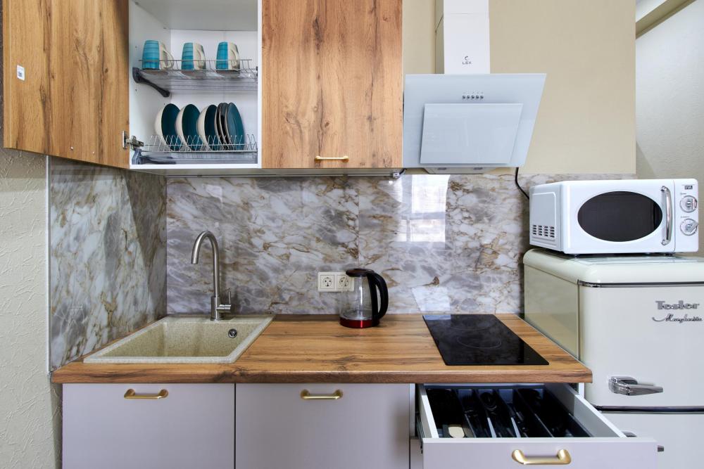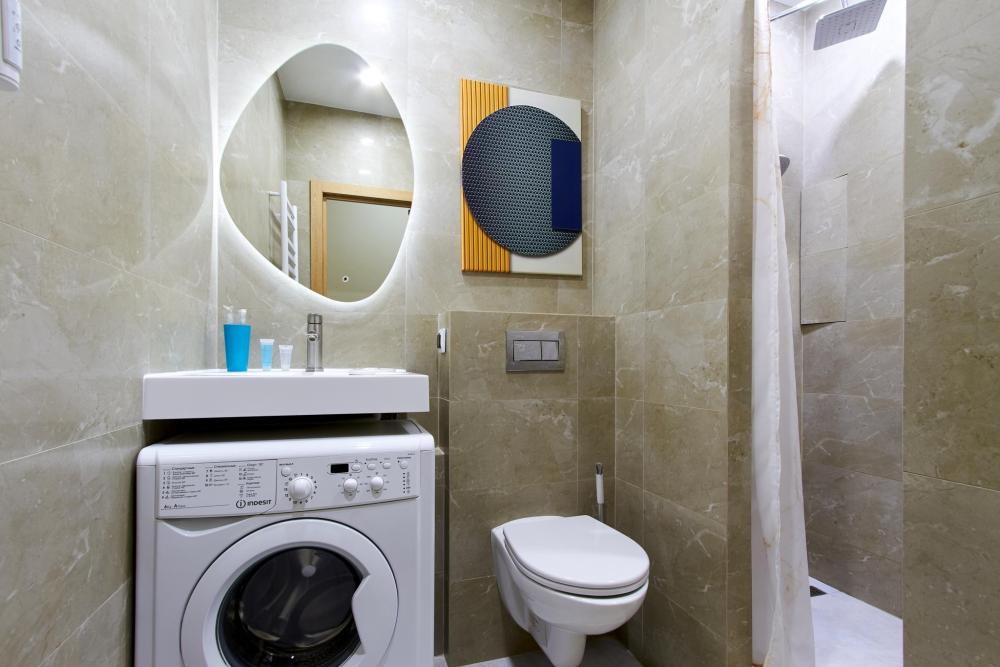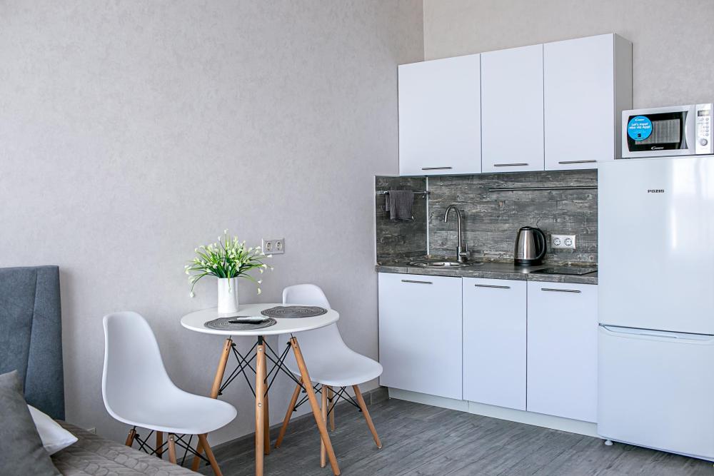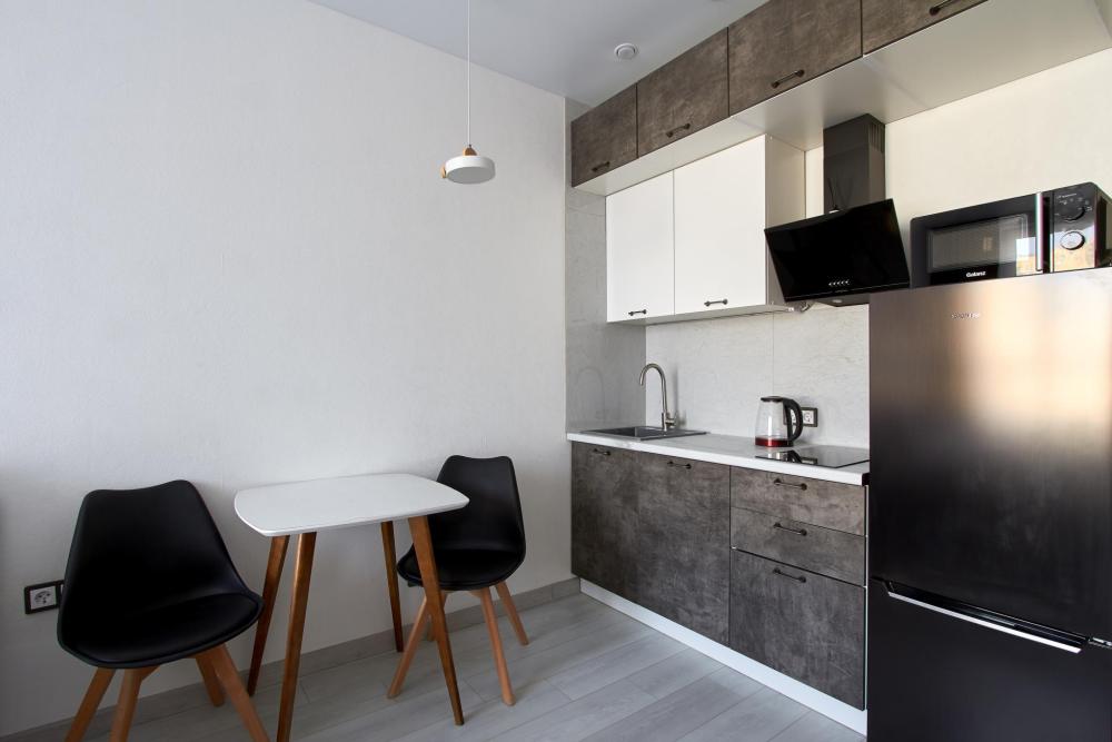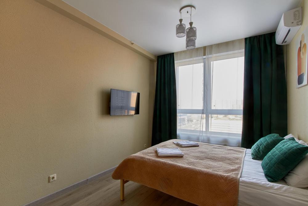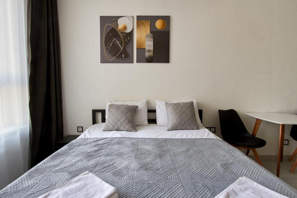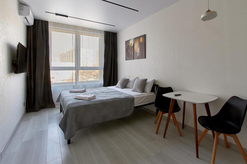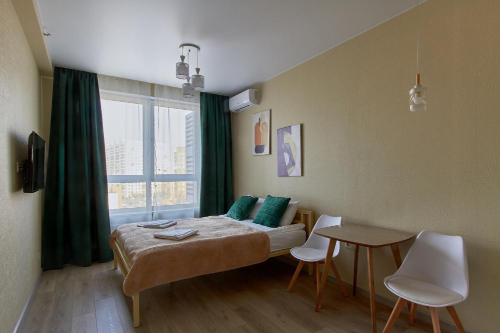 Апартаменты-студия подойдут для размещения 2 человек. Спальные места: двуспальная кровать. В квартире есть все необходимое для комфортного проживания: утюг, гладильная доска, стиральная машина, фен, Wi-Fi и Smаrt ТV. На кухне: электроплита, холодильник, микроволновая печь, чайник. Постельное белье, полотенца и средства личной гигиены предоставляются.