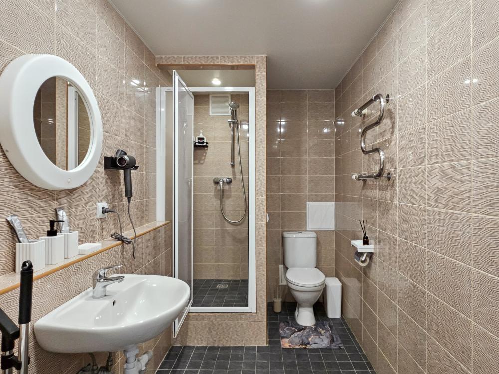 Ванная: Чистая, опрятная, есть шампунь, гель для душа, зубные наборы.