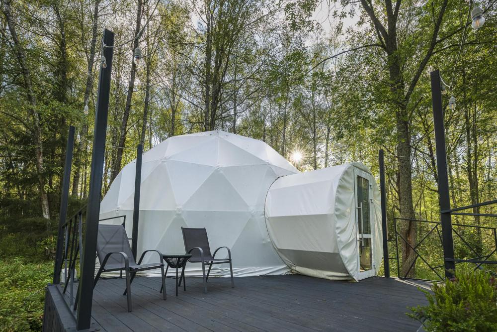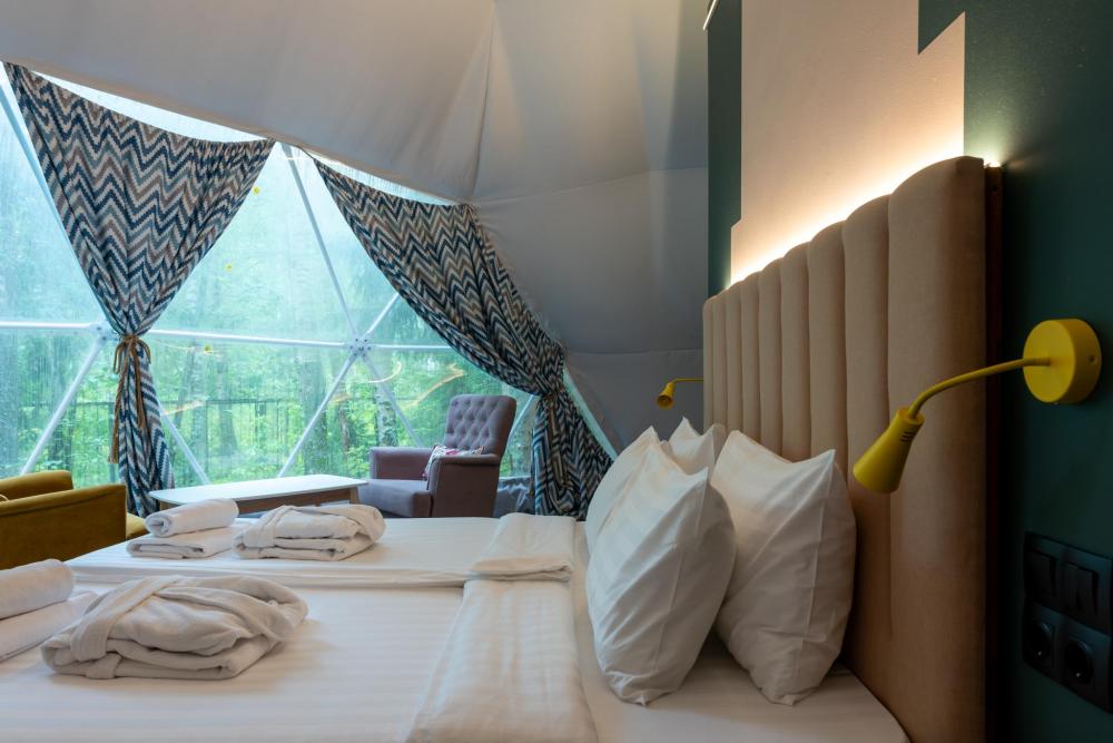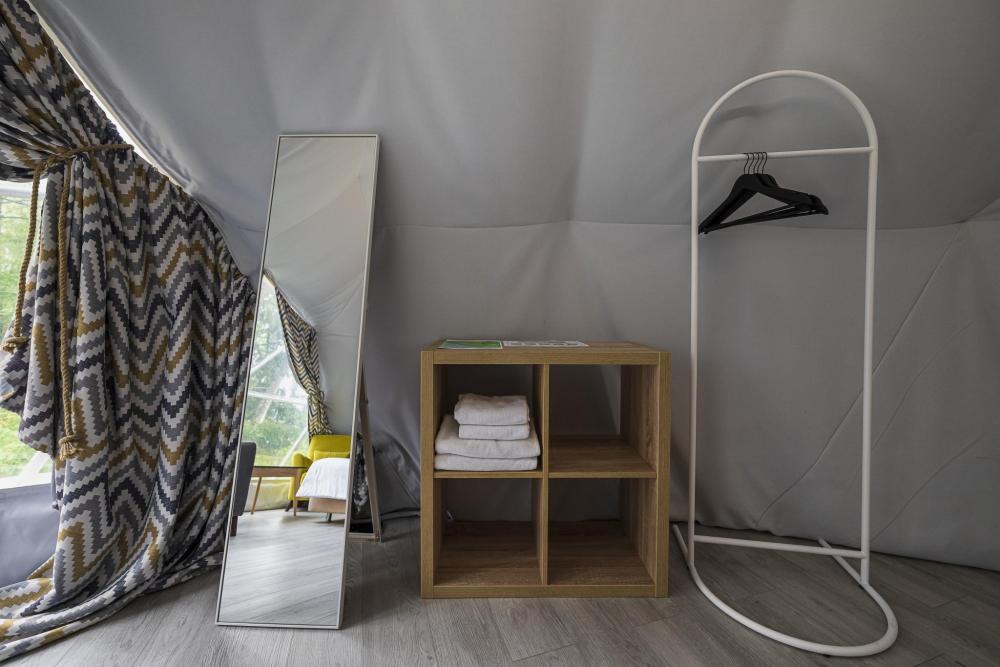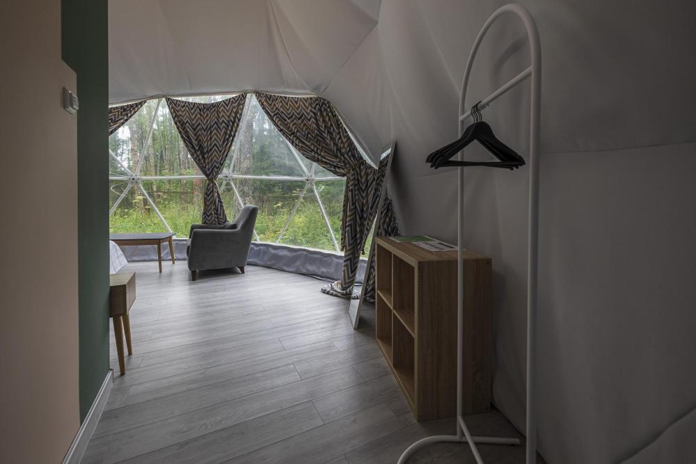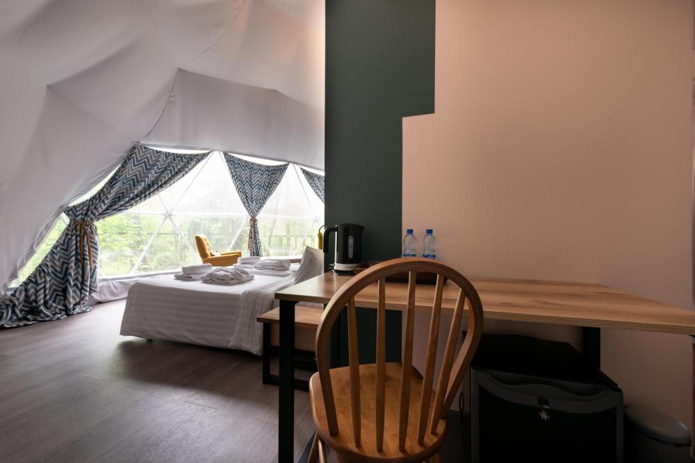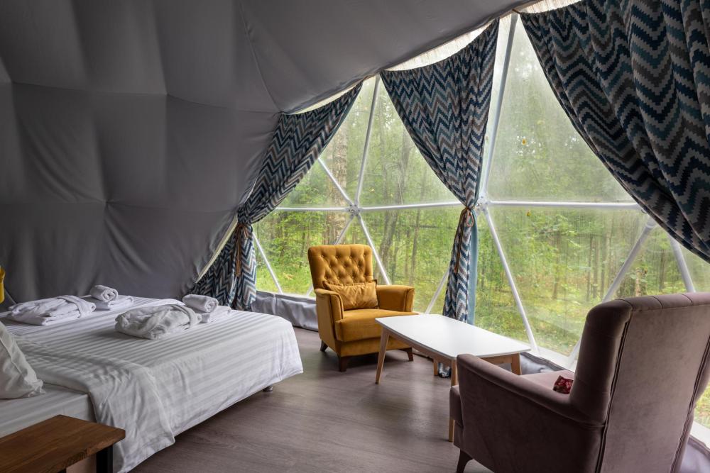Отдельно стоящий купол площадью 38 кв. м. с панорамными окнами и современными удобствами в атмосфере уединенности и приватного отдыха. Максимальная вместимость 4 гостя, которые смогу разместиться на двуспальной кровати с удобным ортопедическим матрацем и двух дополнительных спальных местах. Купол, расположенный в окружении леса у благоустроенного водоема, имеет или свою террасу, или же индивидуальную лужайку для отдыха с гамаком и мангальной зоной. Каждый глэмп оборудован рабочей зоной и зоной отдыха у панорамного окна, мини холодильником, электрическим чайником. Мы заботимся о вашем комфорте, в домиках есть управление освещением, теплый пол и кондиционер. В ванной комнате - полный набор средств гигиены, фен, полотенца, халаты, тапочки.