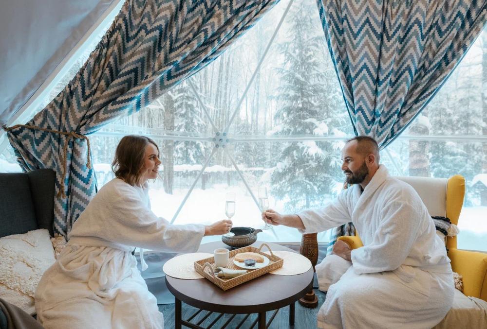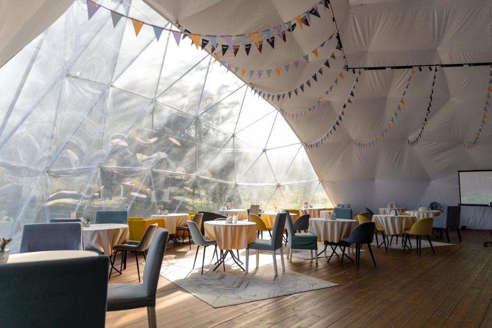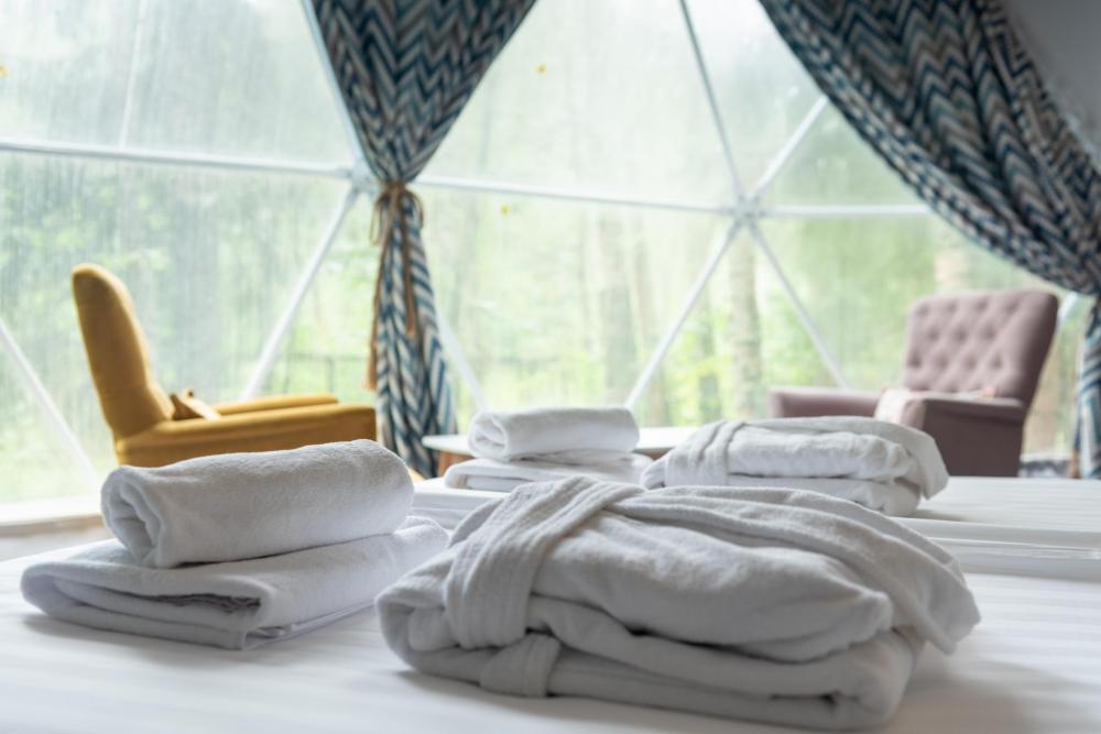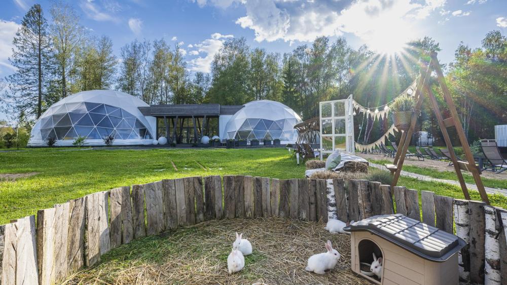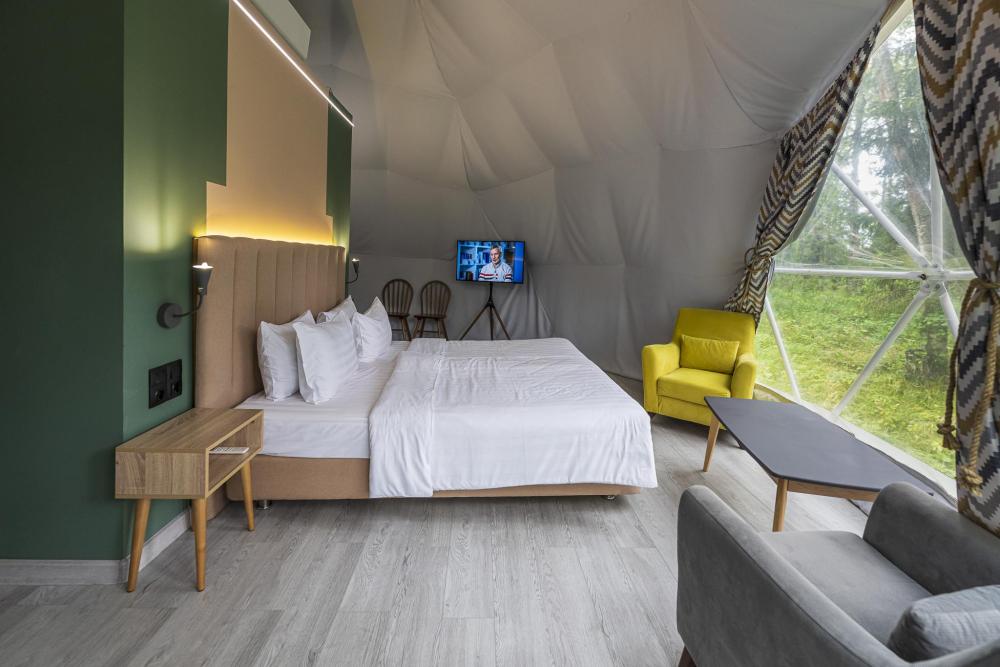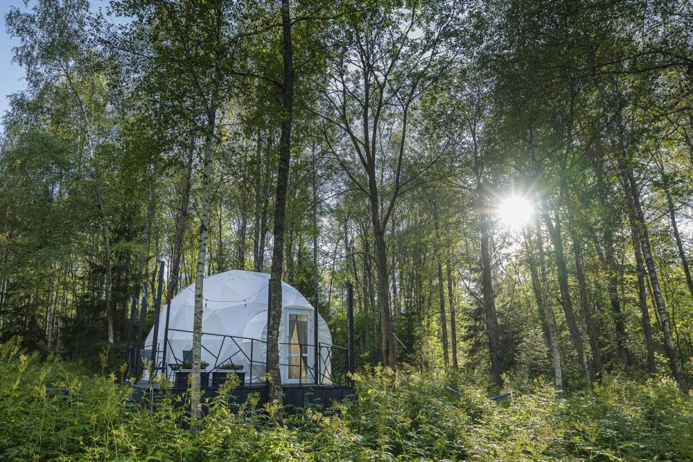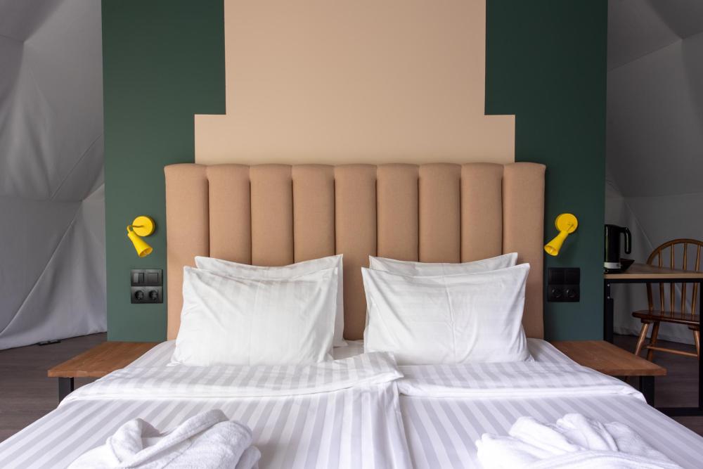 Отдельно стоящий купол площадью 38 кв. м. с панорамными окнами и современными удобствами в атмосфере уединенности и приватного отдыха. Максимальная вместимость 4 гостя, которые смогу разместиться на двуспальной кровати с удобным ортопедическим матрацем и двух дополнительных спальных местах. Купол, расположенный в окружении леса у благоустроенного водоема, имеет или свою террасу, или же индивидуальную лужайку для отдыха с гамаком и мангальной зоной. Каждый глэмп оборудован рабочей зоной и зоной отдыха у панорамного окна, мини холодильником, электрическим чайником. Мы заботимся о вашем комфорте, в домиках есть управление освещением, теплый пол и кондиционер. В ванной комнате - полный набор средств гигиены, фен, полотенца, халаты, тапочки.
