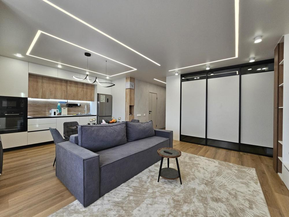•Гостиная с большим диваном, который раскладывается в удобное дополнительное двуспальное место и стильной подсветкой плавно перетекает в полностью укомплектованную кухню, оснащённую всей современной техникой.