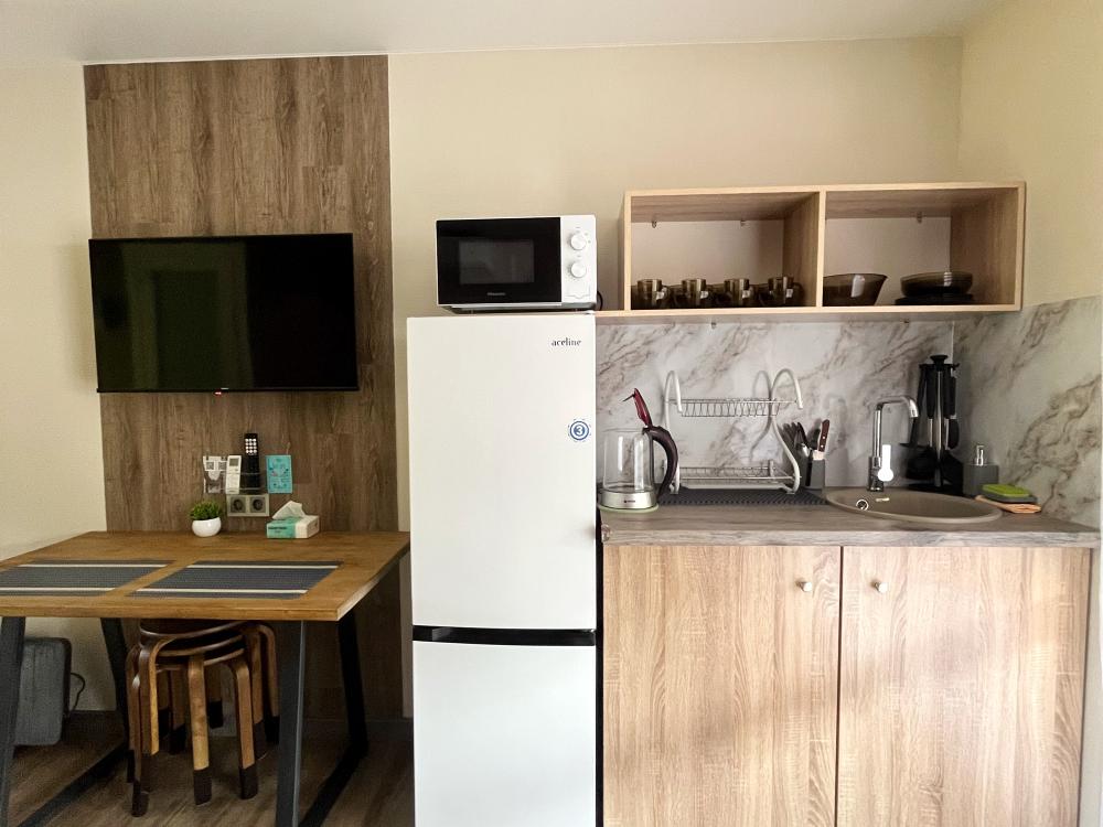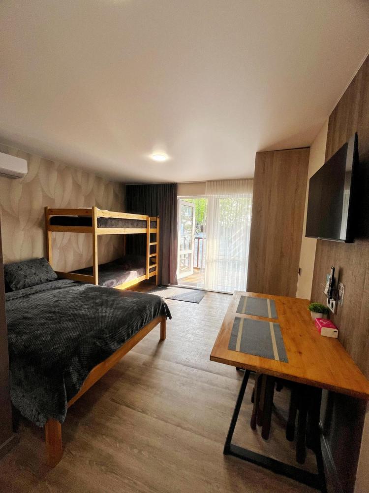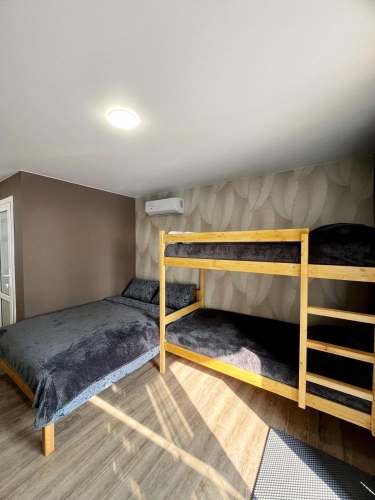 Комната для семьи из 2-ух взрослых и 2-ух детей, со всеми удобствами. Находятся на 1 этаже, где есть терраса, для вашего удобства там есть стол и стулья. В комнате находится: двуспальная кровать, двухъярусная кровать, стол и стулья 3 шт, холодильник, чайник, кондиционер, теплый пол, телевизор, микроволновая печь, сейф, фен, сушка для белья шкаф для хранения личных вещей, мини-кухня с раковиной, посудой и кухонными принадлежности. Сан узел ( раковина, туалет, душ), полотенца, постельное бельё.