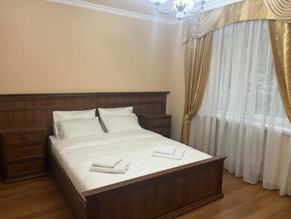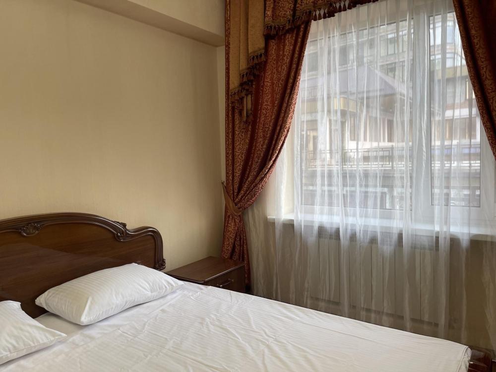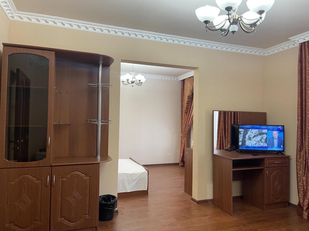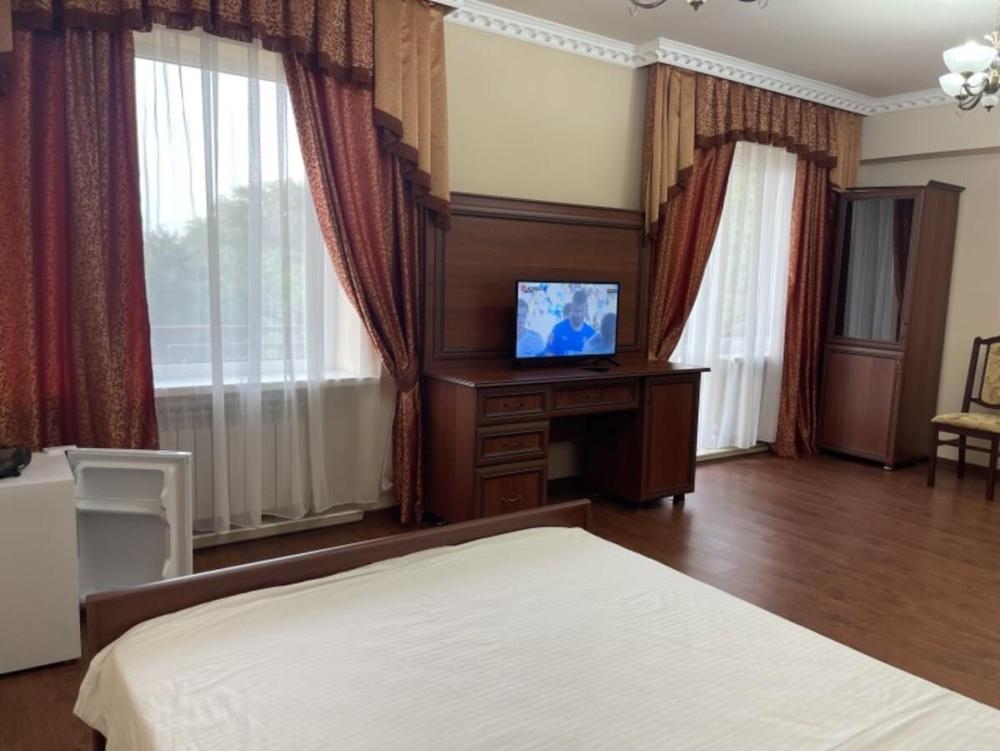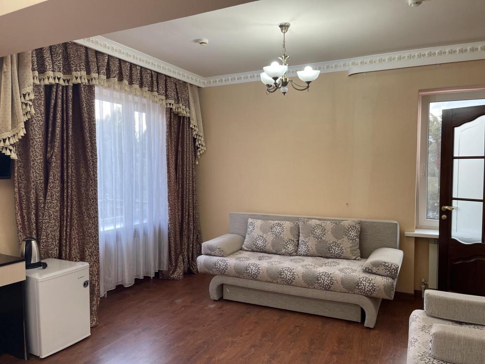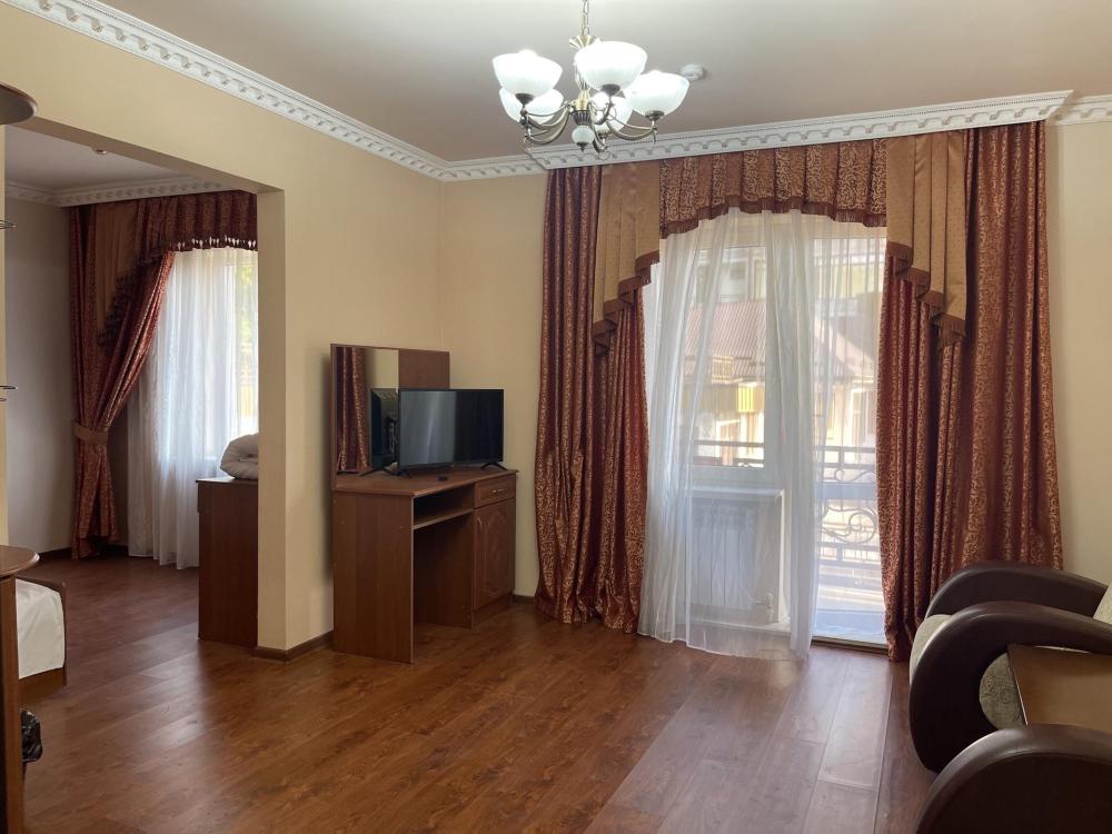 Просторный двухкомнатный номер с одной двуспальной кроватью, двухместным раскладным диваном, двумя креслами и балконом.