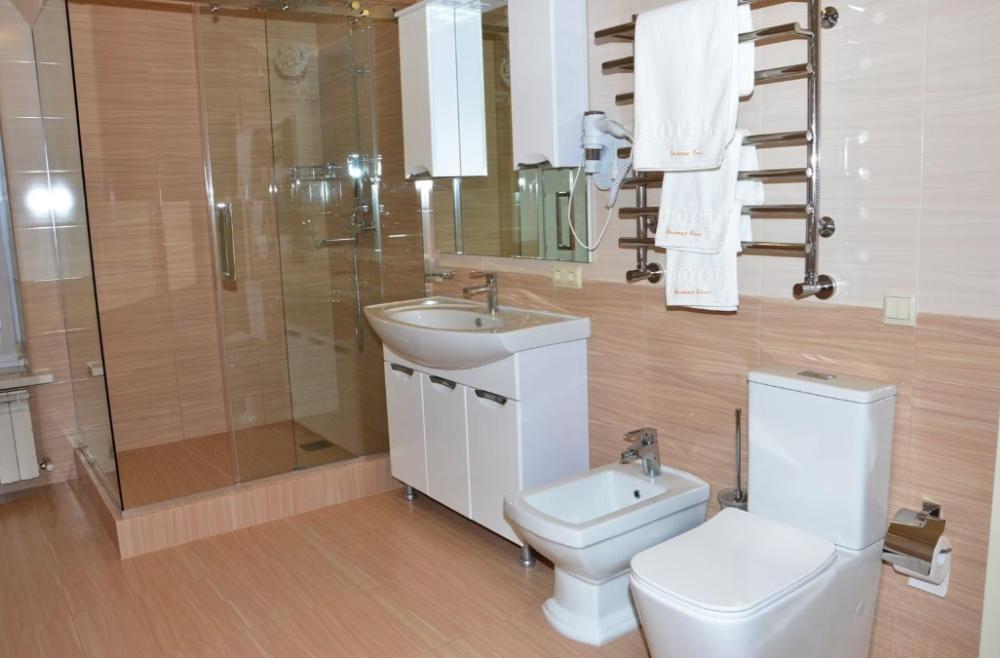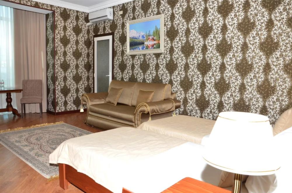 Уютный, светлый номер. В номере: две раздельные кровати, диван, Wi-Fi, кондиционер, телефон, фен, спутниковое телевидение, светильник, холодильник, вешалки, обеденный стол, письменный стол, стулья, шкаф для одежды, ковер. В ванной комнате: ванная комната, душевая кабина, гигиенические средства, туалет, раковина, тапочки, халаты.