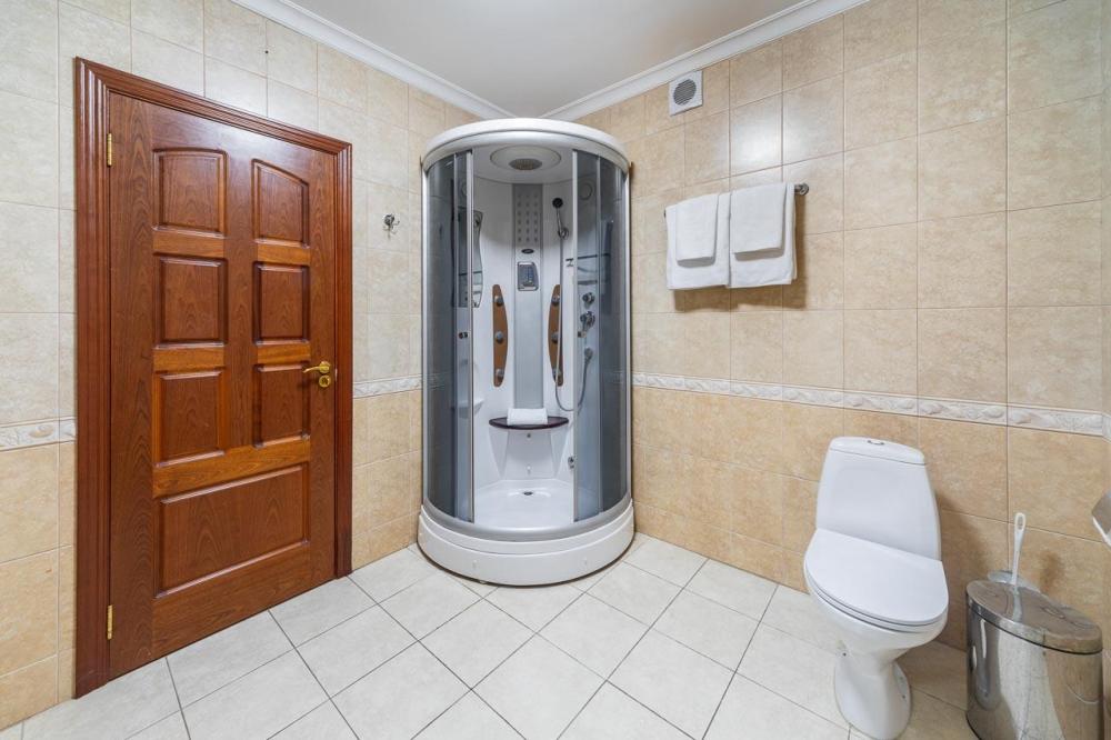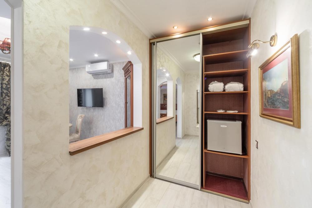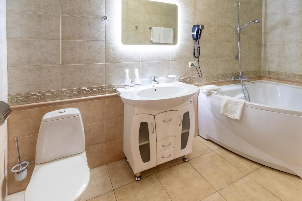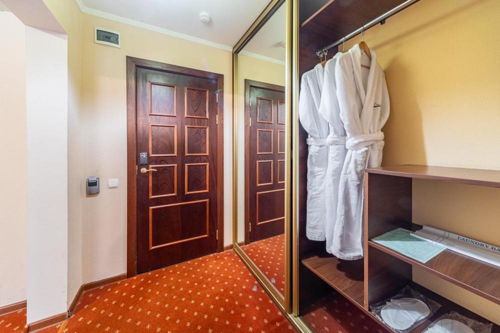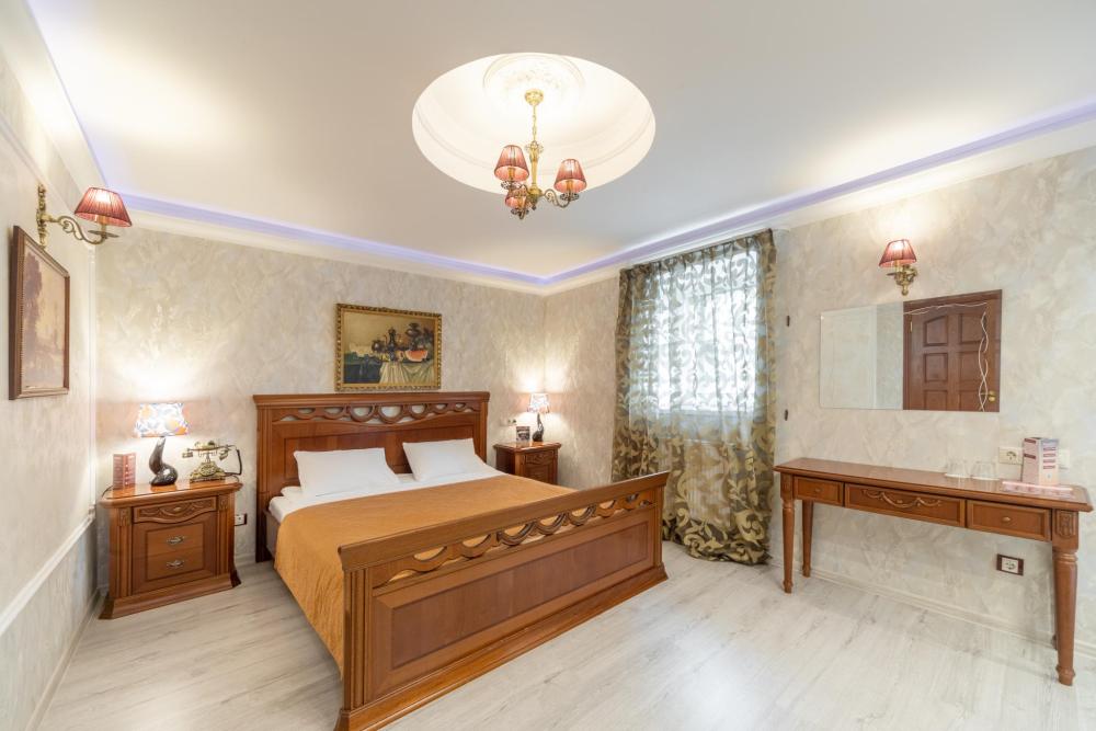 Элегантный люкс общей площадью 50 м2 разделенный на просторную гостиную и уютную спальню с большой кроватью, номер оформлен в индивидуальном стилистике и оснащен всем необходимым для проживания. Внутреннее пространство номера разделено на гостиную зону, кабинет, спальню, ванную комнату с большой ванной, а так же туалет для гостей. В каждом номере есть телефон, ЖК-телевизор, беспроводной интернет (WIFI), туалетный столик. В ваннах комнатах – стационарные фены, современная сантехника и необходимые туалетные принадлежности, а также халаты и тапочки.