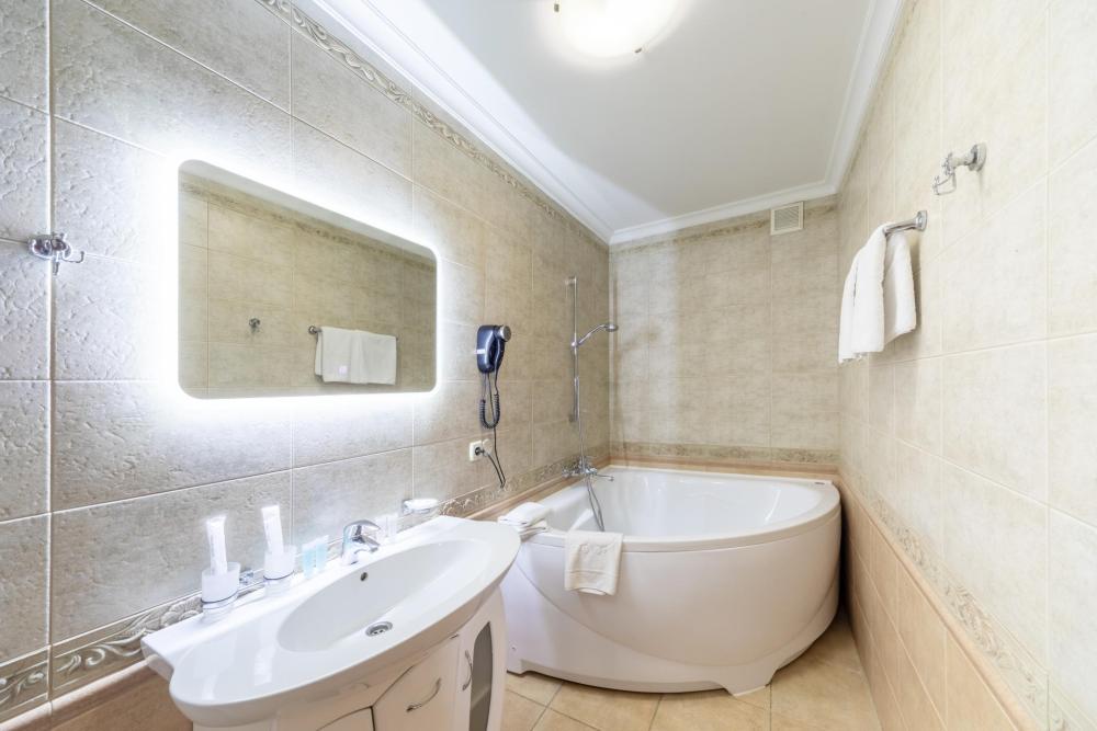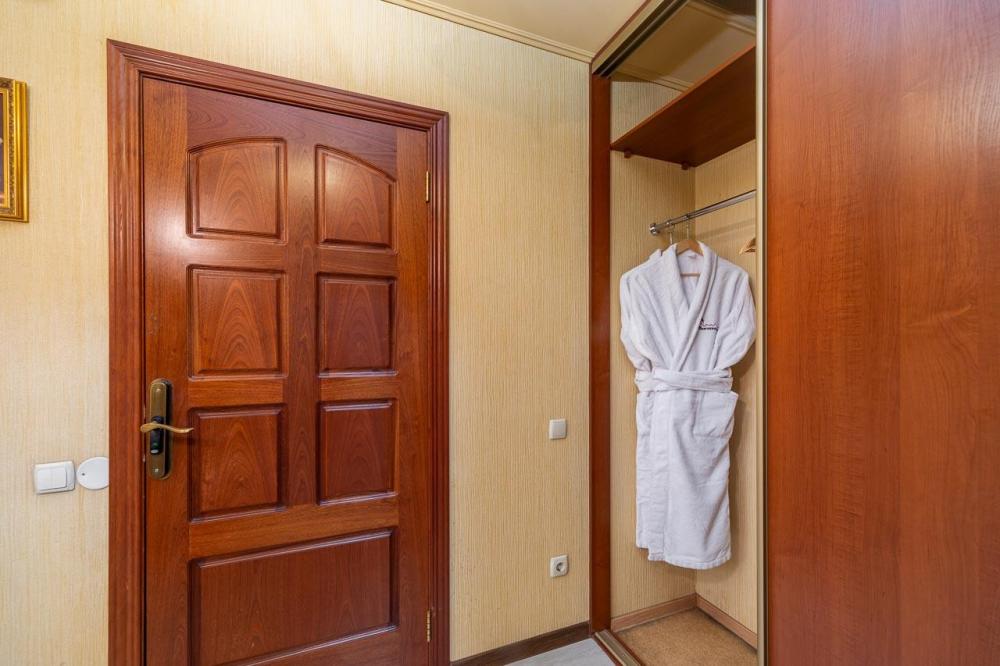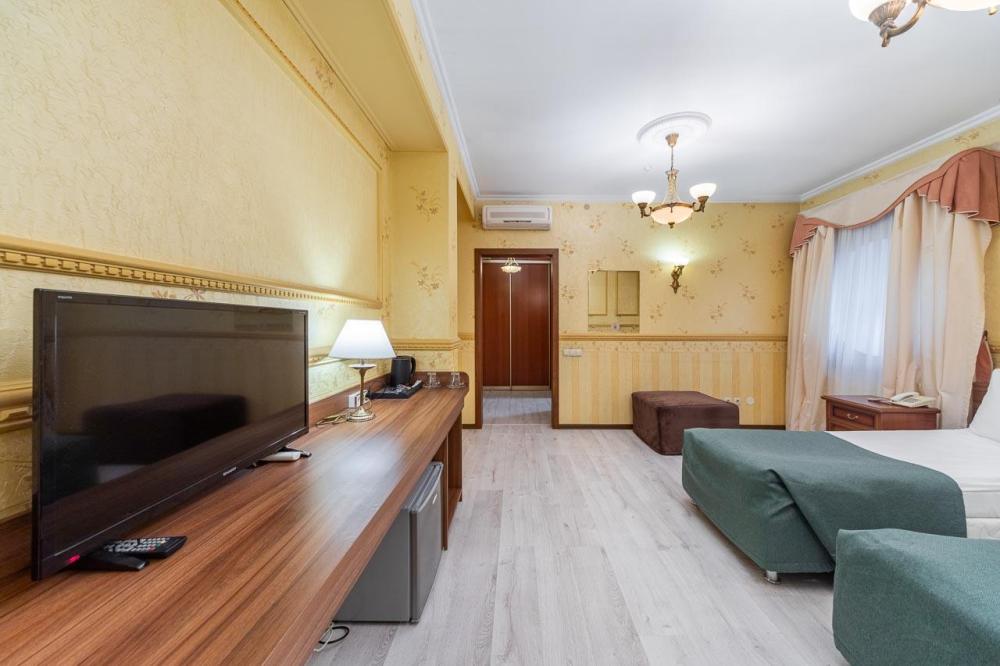 Номер выполнен в классическом стиле, внутренне пространство номера разделено на гостиную зону и спальню с двуспальной кроватью. Все номера оснащены всем необходимым для комфортного проживания: двухспальная кровать, ванная комната с душевой кабиной и гигиенические принадлежности для всех утренних процедур, халаты и тапочки, а также кондиционер, мини-холодильник, чайная станция, телевизор и фен