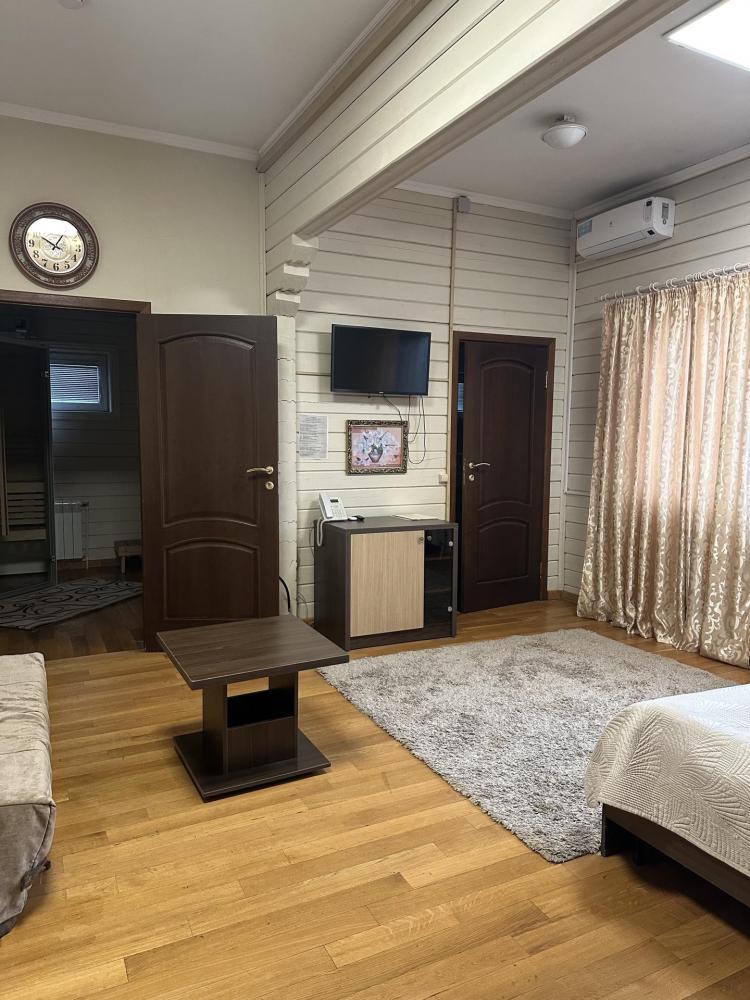 Просторный двухкомнатный номер. В номере: двуспальная кровать, диван, холодильник, телевизор, просторная туалетная комната. Мы дарим 1 час сауны при бронировании номера. Отдыхайте с пользой! Сауна позволит Вам: вывести шлаки и токсины, очистить кожу, снизить напряжение в мышцах.