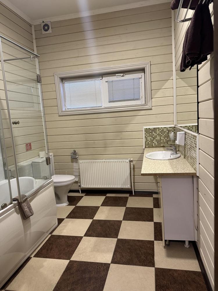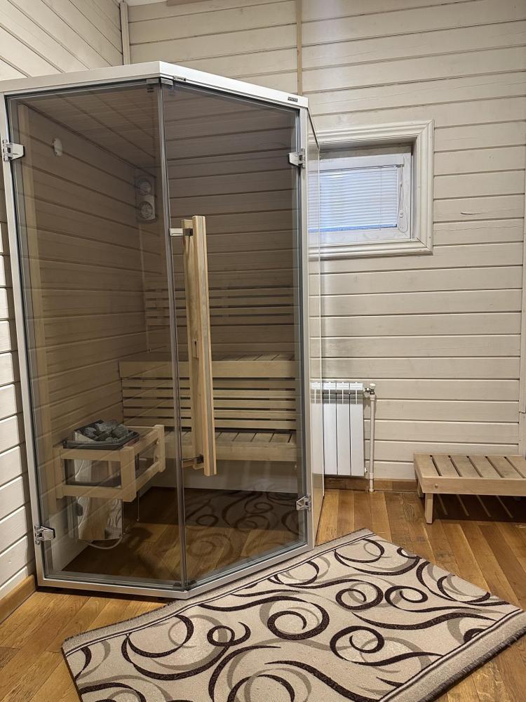 Двухэтажный дом: на 1-ом этаже гостиная, угловой диван, телевизор, холодильник, чайник, стол и сауна с просторной душевой. На 2-ом этаже уютная спальня, рядом со спальней комната с раскладным диваном, для детей также можно предоставить детскую кроватку. При желании можно воспользоваться сауной - 1500 руб. / час до 16:00, после 16:00 2000 руб./ час - минимальный заказ 3 часа.