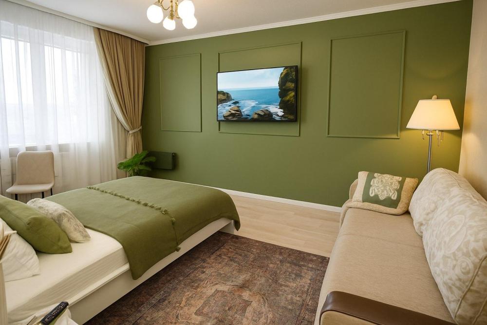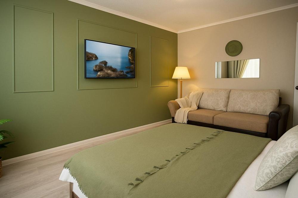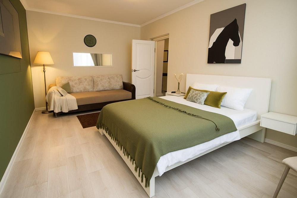 К услугам гсоетй двуспальная кровать с ортопедическим матрасом, две односпальные кровати, диван-кровать — для друзей или детей, 55"Smаrt ТV», рабочая зона с эргономичным столом.