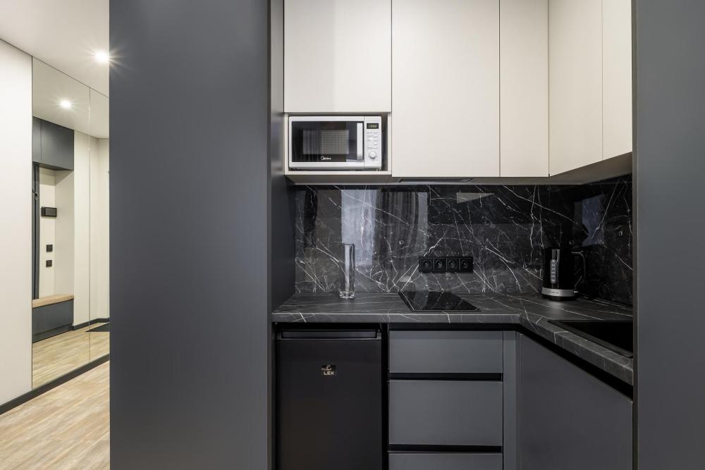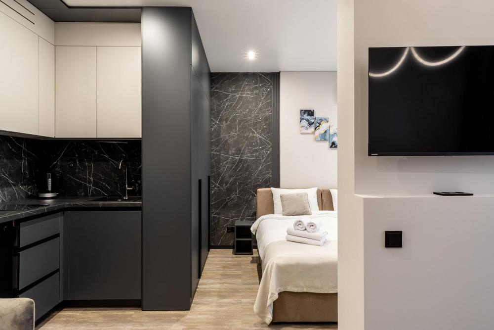 Студия №535 площадью 24 м2 - красивый дизайн и утонченный стиль. Каждая деталь продумана для комфорта: две раздельные кровати, постельное белье, телевизор,Wi-Fi, полноценная кухня, обеденная зона, с полным набором посуды, кондиционер. Санузел оборудован: душевая кабина, стиральная машина, порошок, фен, набор полотенец, тапочки, ванные принадлежности, зубной набор, а также утюг/гладильная доска. К услугам: чайный сет, сладкий комплимент, питьевая вода, средство для мытья посуды. Студия расположена на 5 этаже.