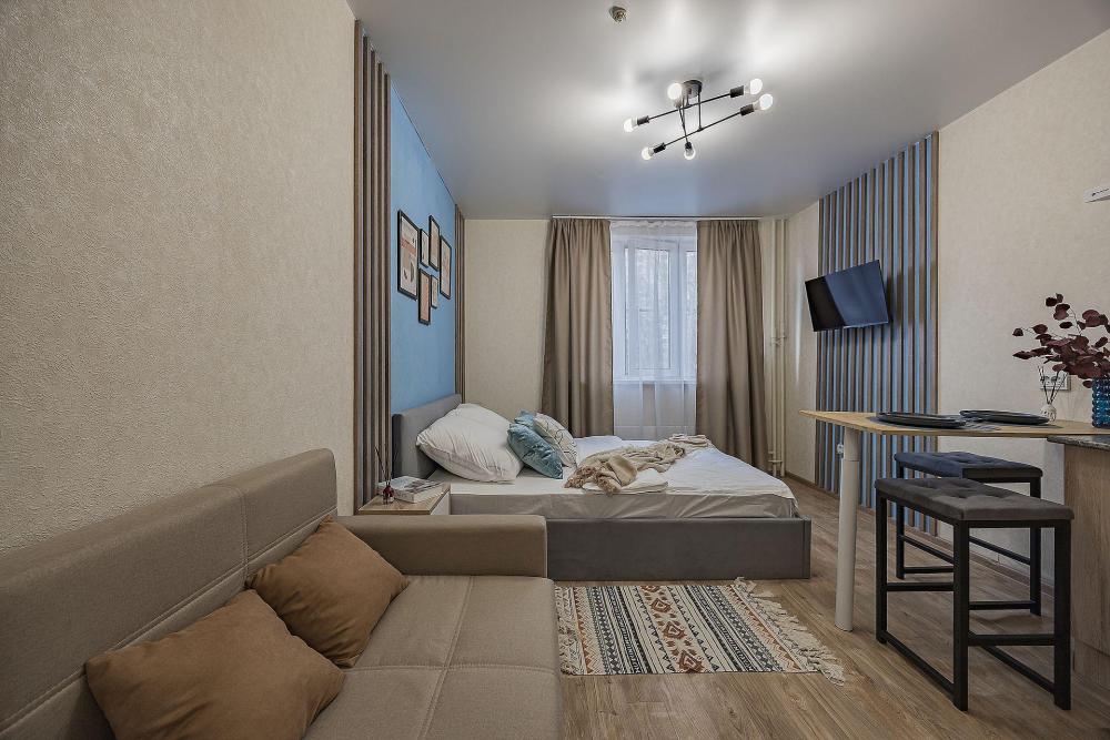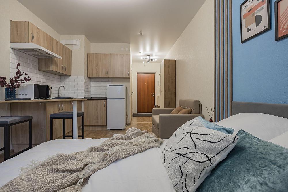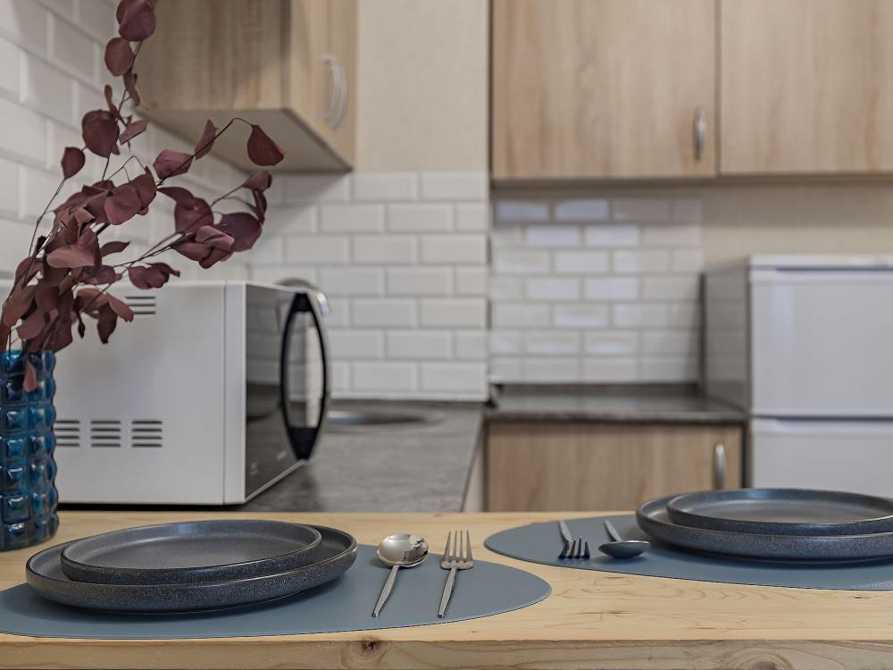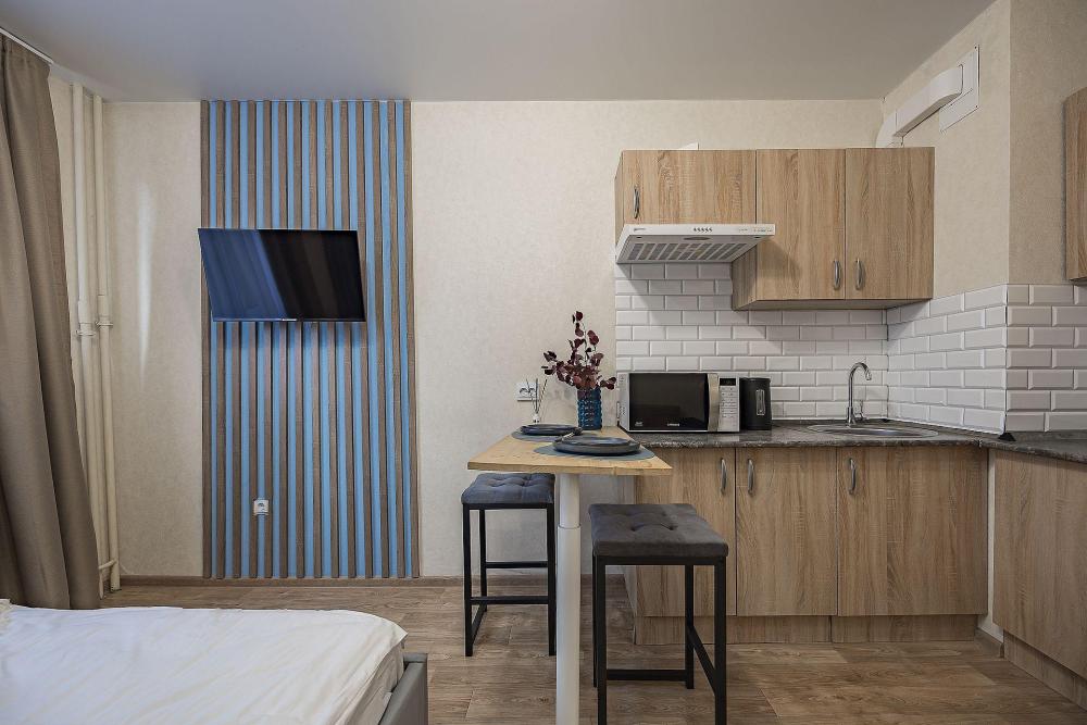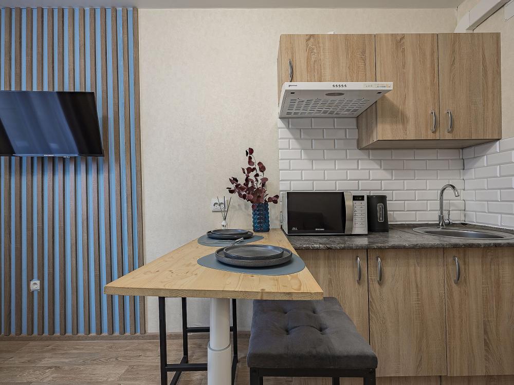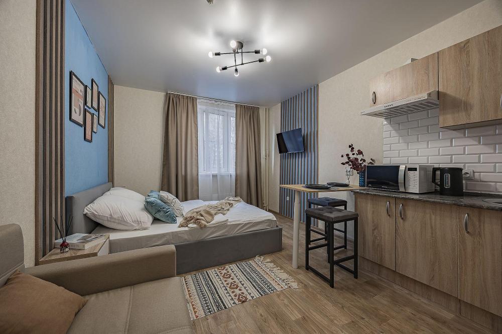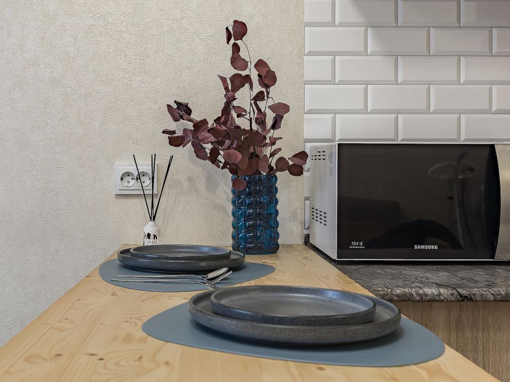 В апартаментах имеется все необходимое для комфортного проживания : кровать 160х200, широкое кресло-кровать, полноценно укомплектованная кухня: плита, чайник, микроволновая печь, духовка, холодильник, посуда и столовые приборы; стабильный wi-fi, стиральная машина, сушилка для белья, отпариватель, фен для волос, а также одноразовые тапочки и зубные наборы; Wеlсоmе-набор: чай, сахар, соль-перец, растительное масло.