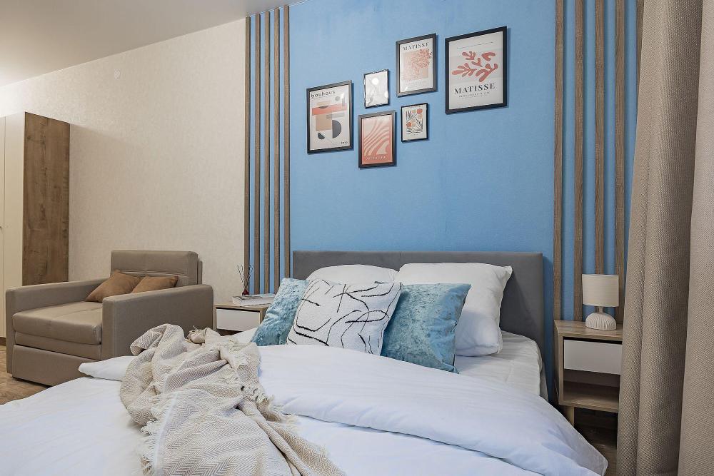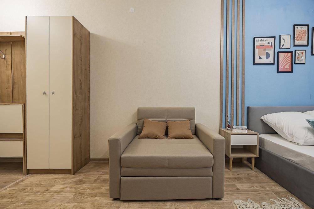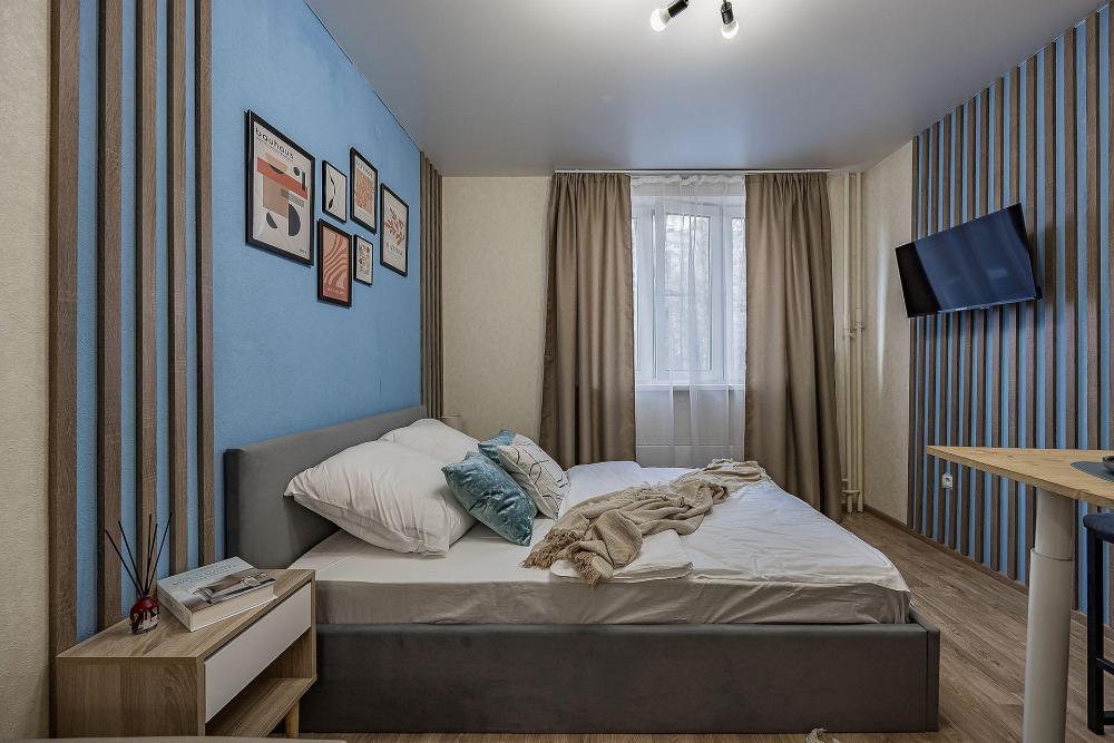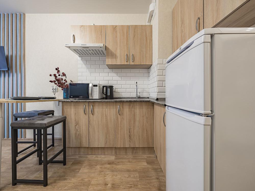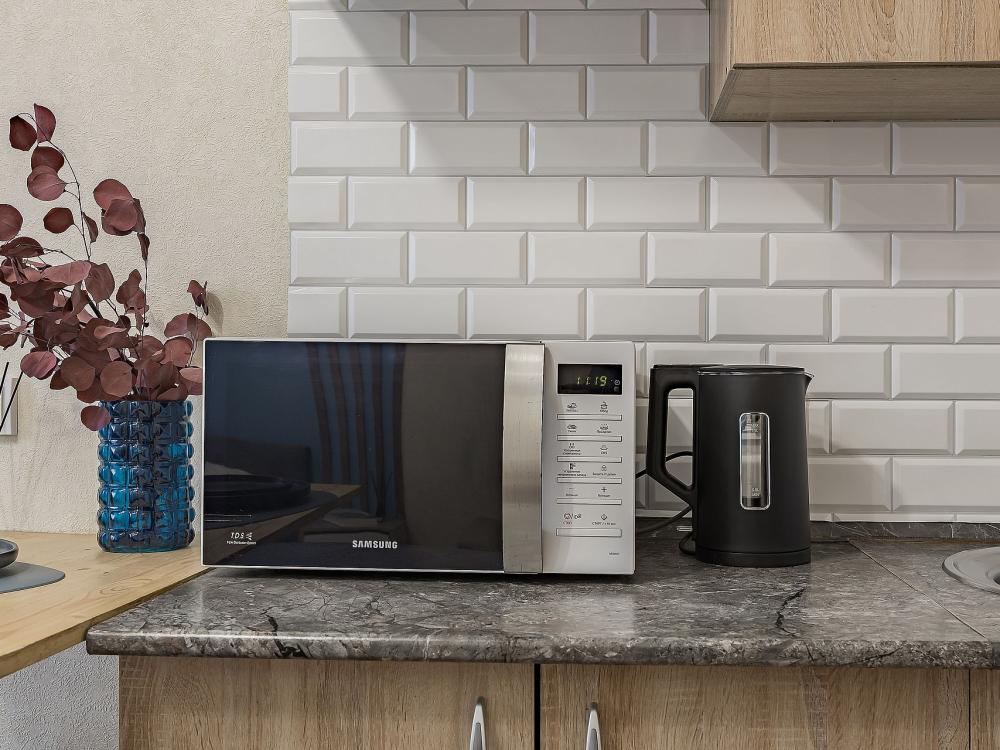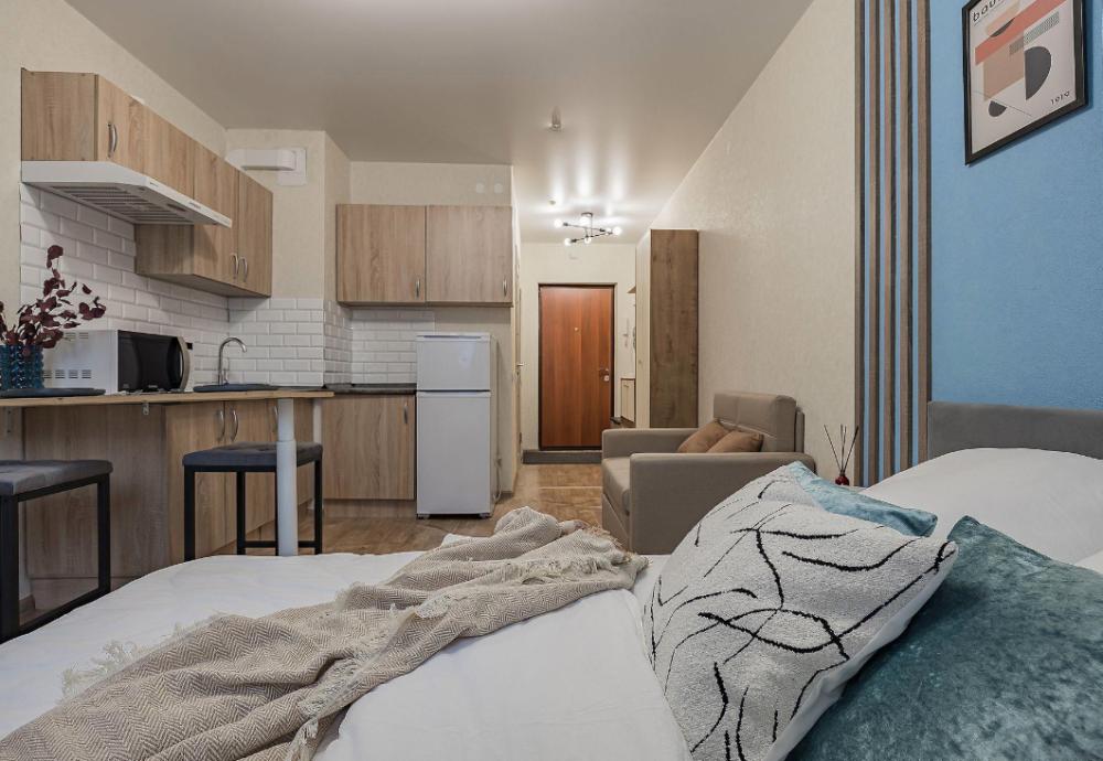 В апартаментах имеется все необходимое для комфортного проживания : кровать 160х200, широкое кресло-кровать, полноценно укомплектованная кухня: плита, чайник, микроволновая печь, духовка, холодильник, посуда и столовые приборы; стабильный wi-fi, стиральная машина, сушилка для белья, отпариватель, фен для волос, а также одноразовые тапочки и зубные наборы; Wеlсоmе-набор: чай, сахар, соль-перец, растительное масло.