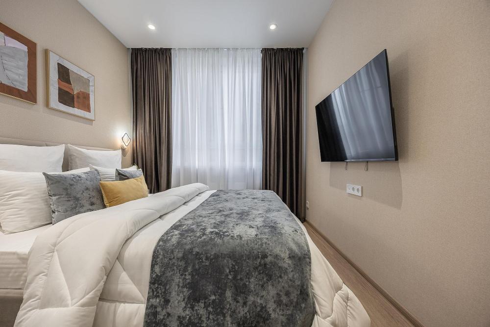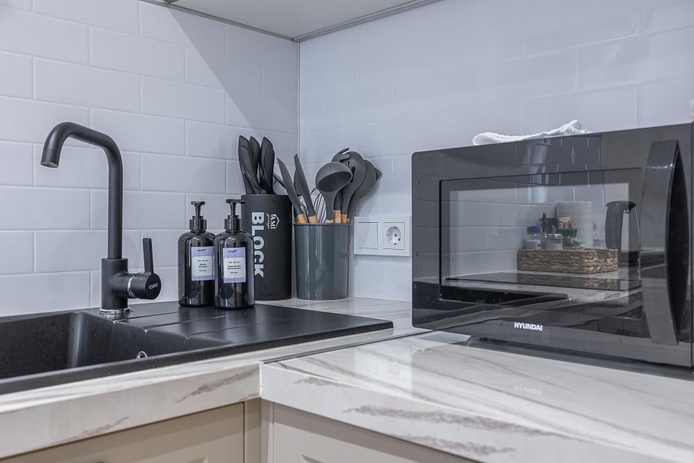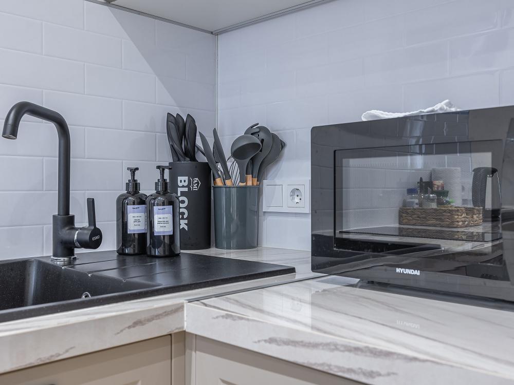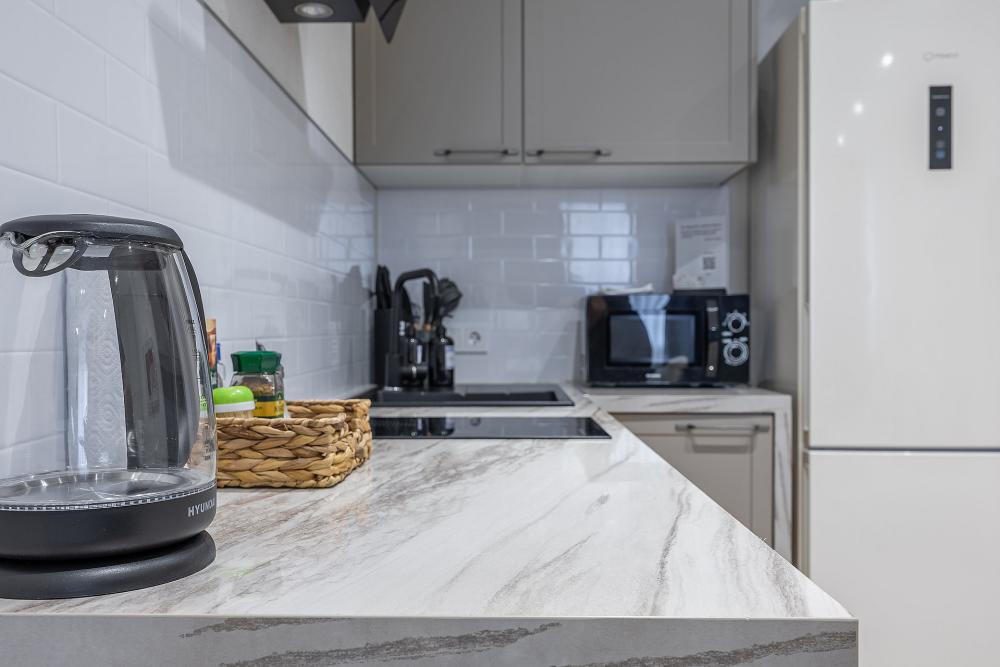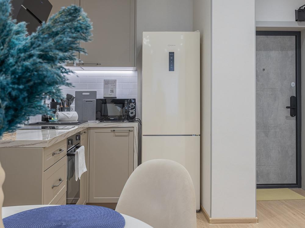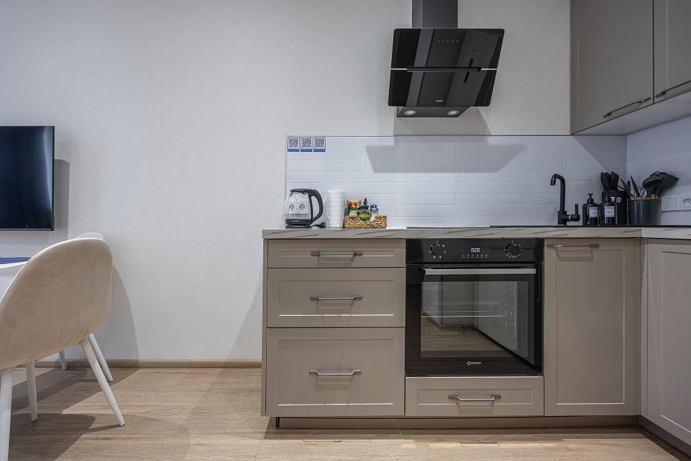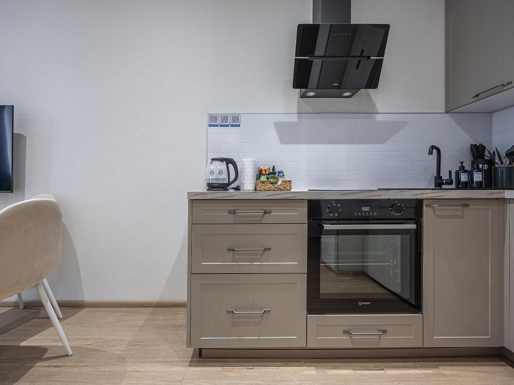 — Полностью оборудованная кухня (холодильник, плита, СВЧ-печь, чайник, набор посуды);