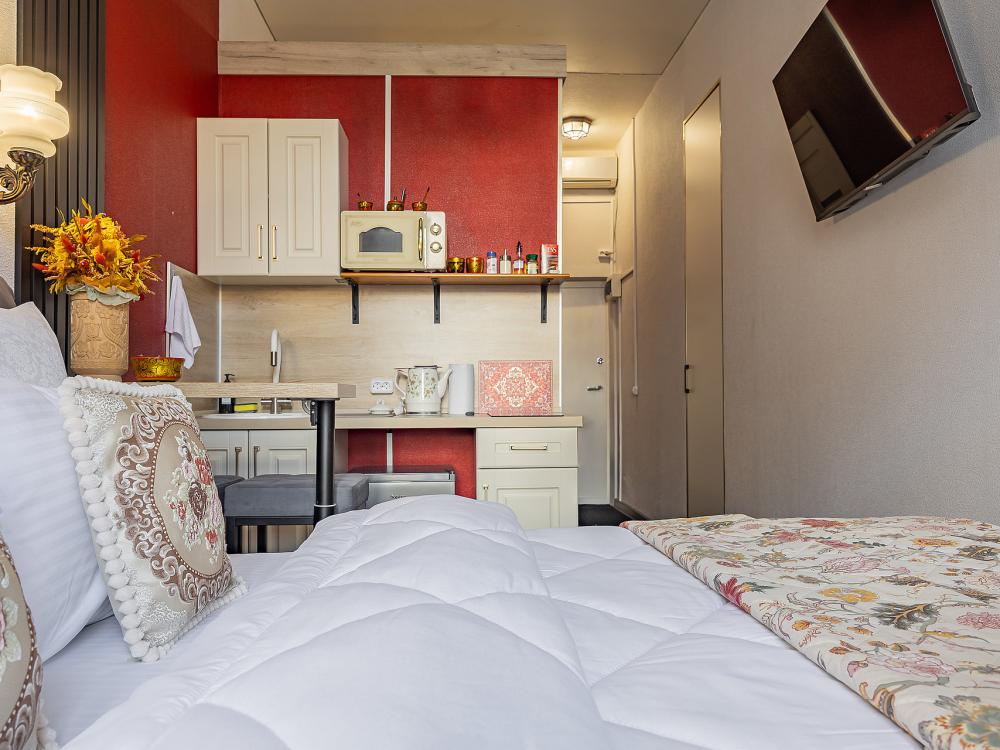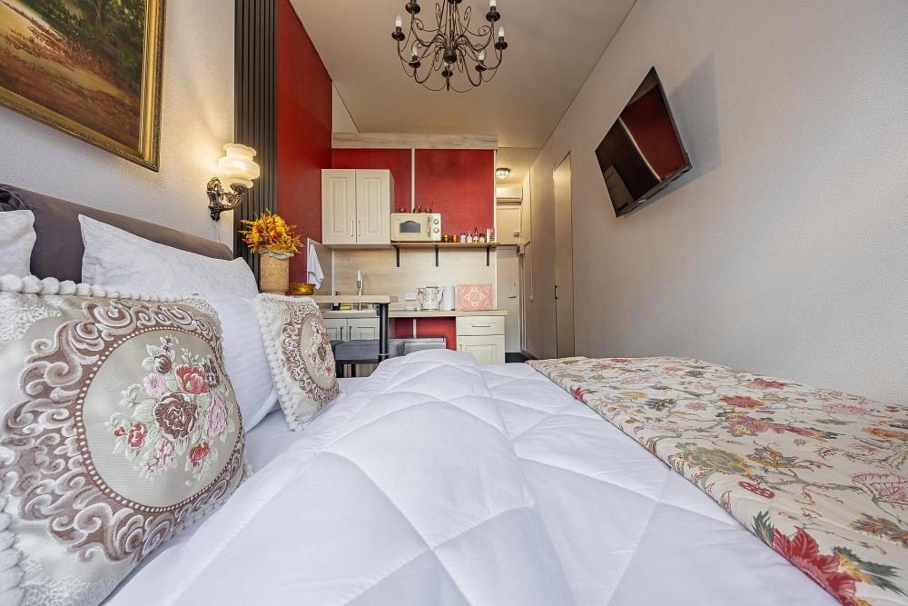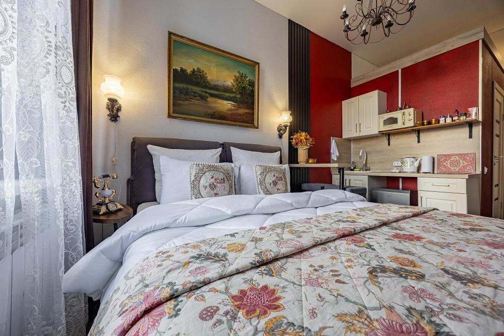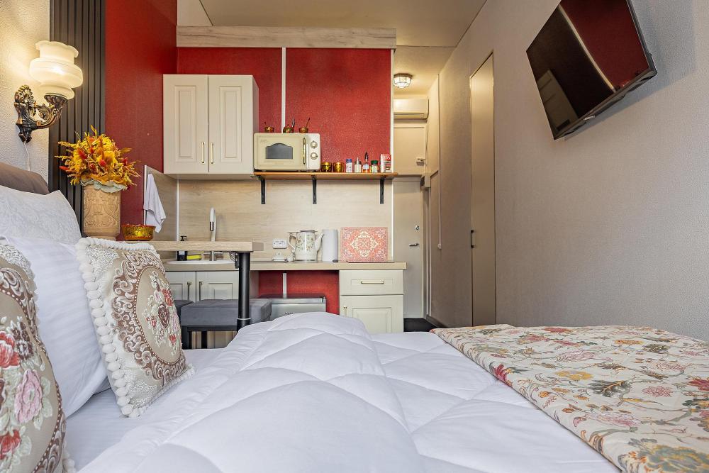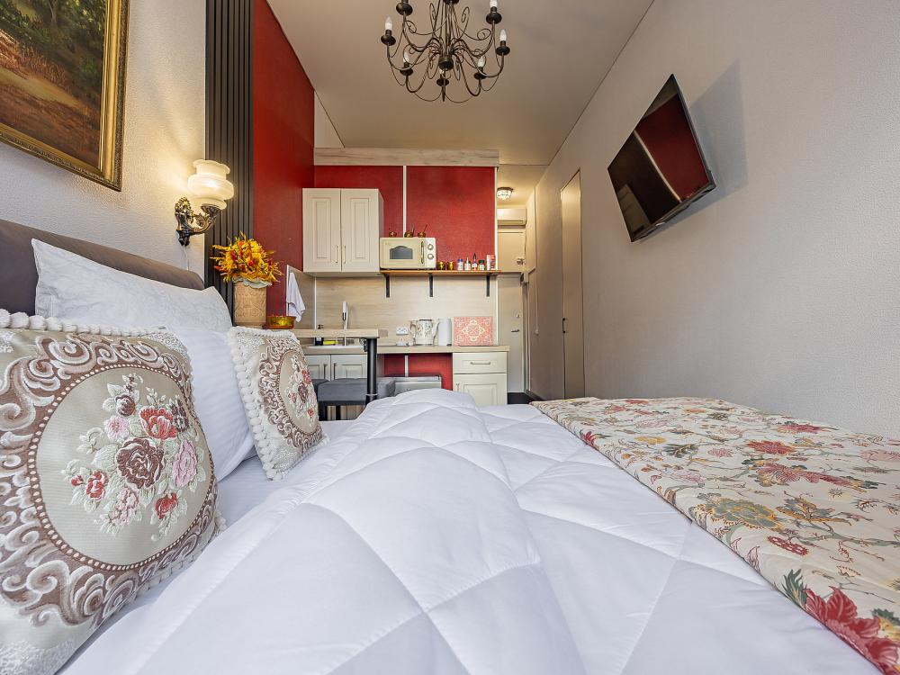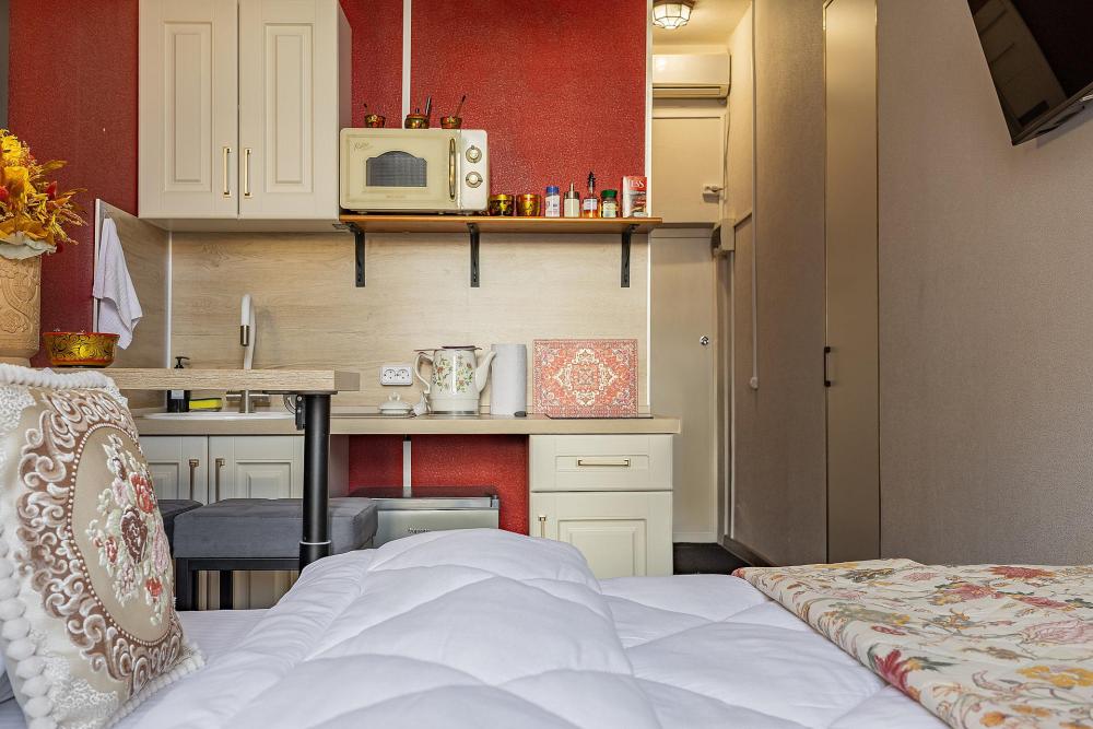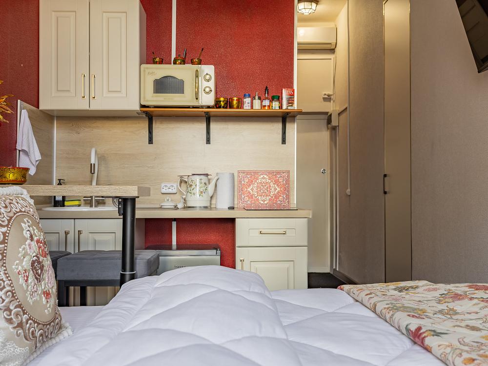 Уютная квартира-студия площадью 20 м² на 2 этаже. Идеально подходит для семьи из 2 человек, командированных или туристов. Спальные места: двуспальная кровать (160×200 см, ортопедический матрас). Спальные комплекты: На кровать идет следующий комплект: 2 подушки; 2 наволочки; двуспальное одеяло; пододеяльник; простынь. Удобства: кондиционер обеспечит комфортом в летний период; парковка во дворе дома за шлагбаумом; скоростной Wi-Fi для работы и развлечений; полностью оборудованная кухня (холодильник, плита, СВЧ-печь, чайник, набор посуды); стиральная машина; просторная ванная комната с удобной ванной, комплектом мягких полотенец и феном; гигиенические наборы: мыло, шампунь, гель для душа, ватные палочки, ватные диски, прокладки, зубные щетки; комплимент для гостей: чай, кофе, соль, сахар, конфеты и подсолнечное масло; постельное бельё из натуральных тканей; дополнительно можем предоставить детский стульчик и раскладушку.