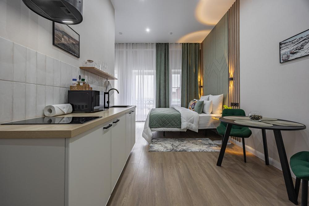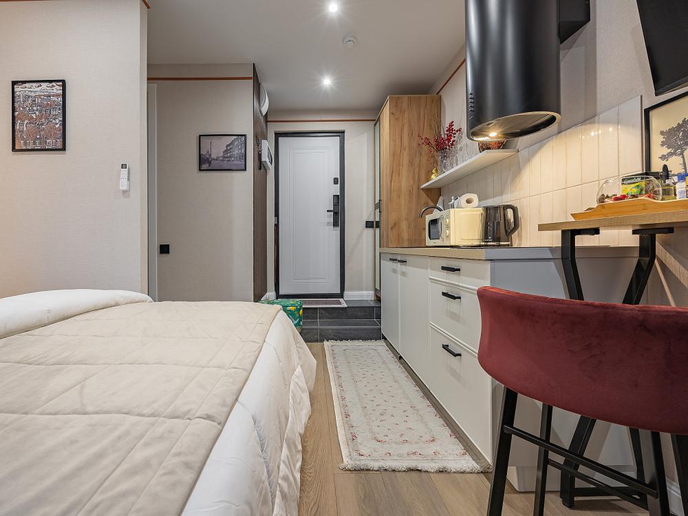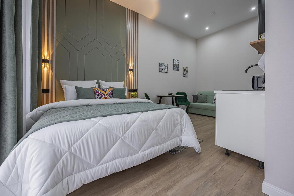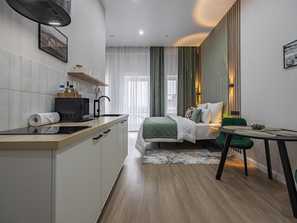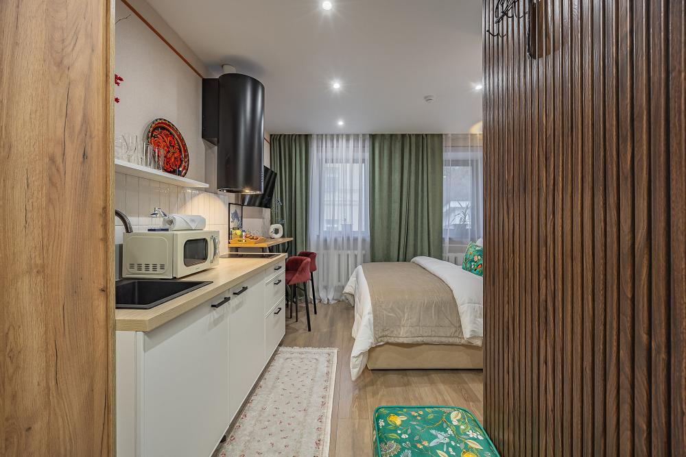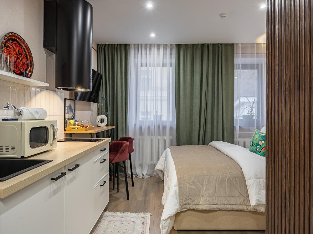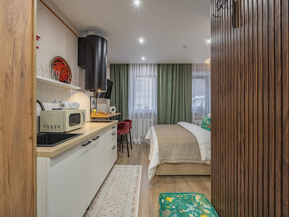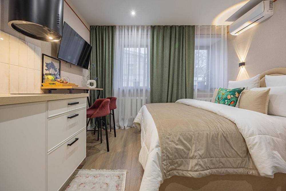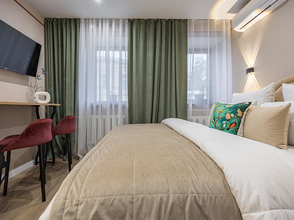 Уютная студия площадью 25 м² на 3 этаже. Идеально подходит для семьи из 3 человек, командированных или туристов, приехавших небольшой компанией, желающих насладиться комфортом. Спальные места: двуспальная кровать (160×200 см, ортопедический матрас), односпальный диван (120×200 см). Спальные комплекты: На каждую кровать и диван идет следующий комплект: 2 подушки; 2 наволочки; двуспальное одеяло; пододеяльник; простынь. Удобства: кондиционер, обеспечит вас комфортом в летний период; общественная парковка около дома; скоростной Wi-Fi для работы и развлечений; полностью оборудованная кухня (холодильник, плита, СВЧ-печь, чайник, набор посуды); стиральная машина; просторная ванная комната с душевой кабиной, мягкими полотенцами и феном; гигиенические наборы: мыло, шампунь, гель для душа, ватные палочки, ватные диски, прокладки, зубные щетки; комплимент для гостей: чай, кофе, соль, сахар, конфеты и подсолнечное масло; постельное бельё из натуральных тканей.