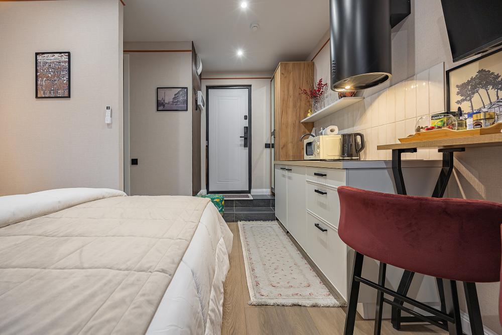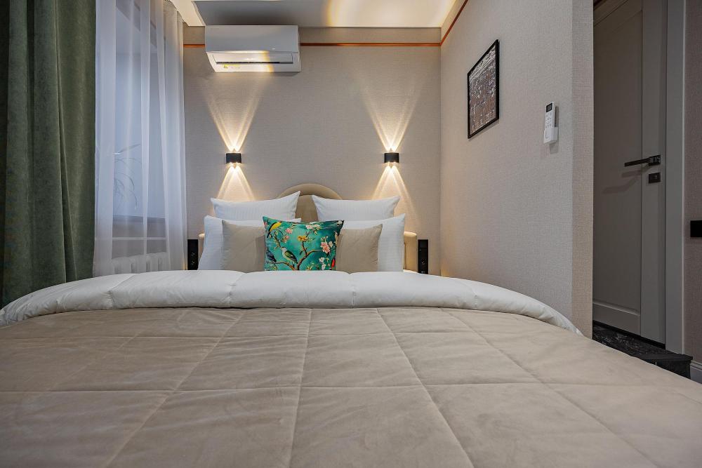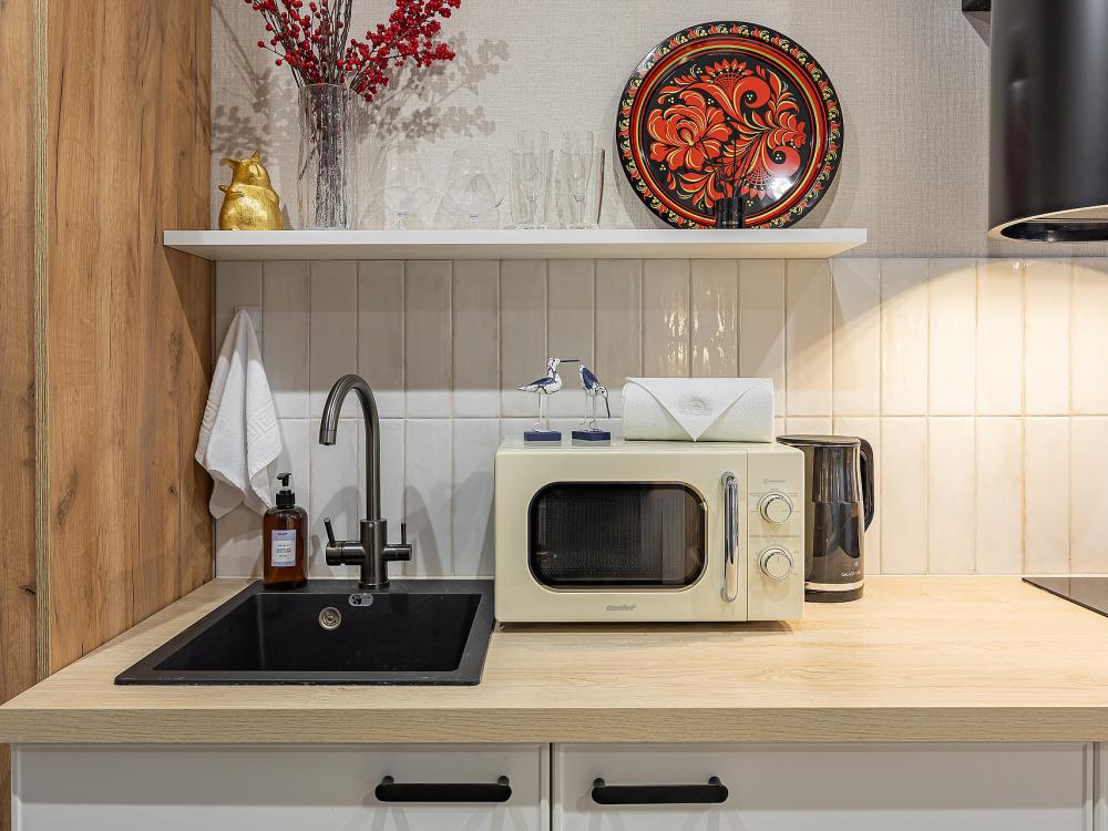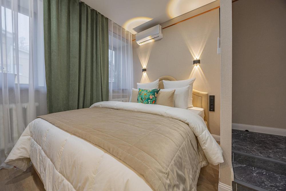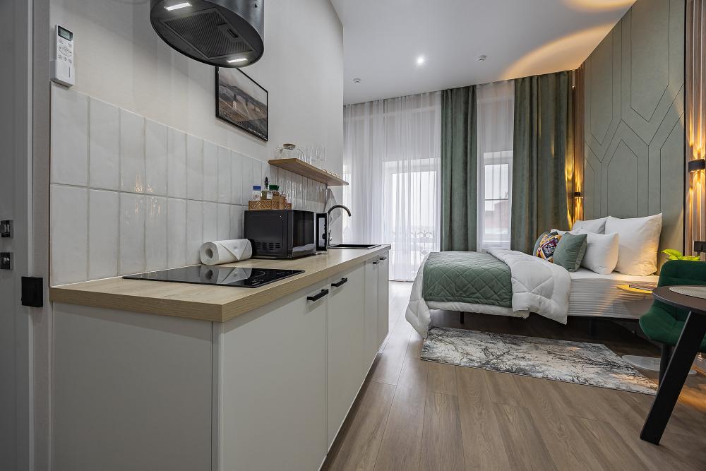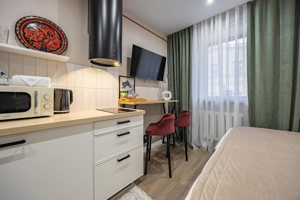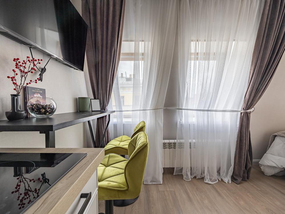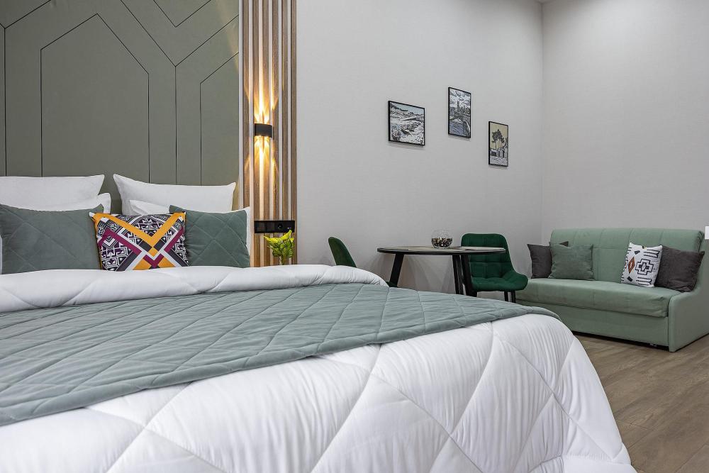 Уютная студия площадью 25 м² на 3 этаже. Идеально подходит для семьи из 3 человек, командированных или туристов, приехавших небольшой компанией, желающих насладиться комфортом. Спальные места: двуспальная кровать (160×200 см, ортопедический матрас), односпальный диван (120×200 см). Спальные комплекты: На каждую кровать и диван идет следующий комплект: 2 подушки; 2 наволочки; двуспальное одеяло; пододеяльник; простынь. Удобства: кондиционер, обеспечит вас комфортом в летний период; общественная парковка около дома; скоростной Wi-Fi для работы и развлечений; полностью оборудованная кухня (холодильник, плита, СВЧ-печь, чайник, набор посуды); стиральная машина; просторная ванная комната с душевой кабиной, мягкими полотенцами и феном; гигиенические наборы: мыло, шампунь, гель для душа, ватные палочки, ватные диски, прокладки, зубные щетки; комплимент для гостей: чай, кофе, соль, сахар, конфеты и подсолнечное масло; постельное бельё из натуральных тканей.
