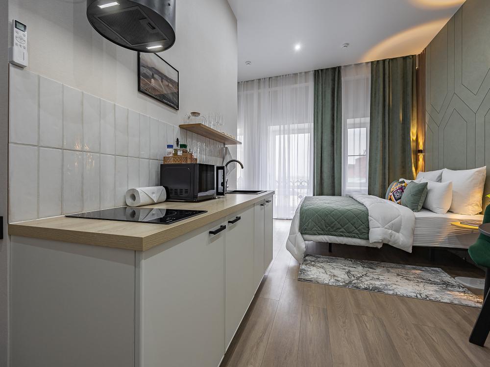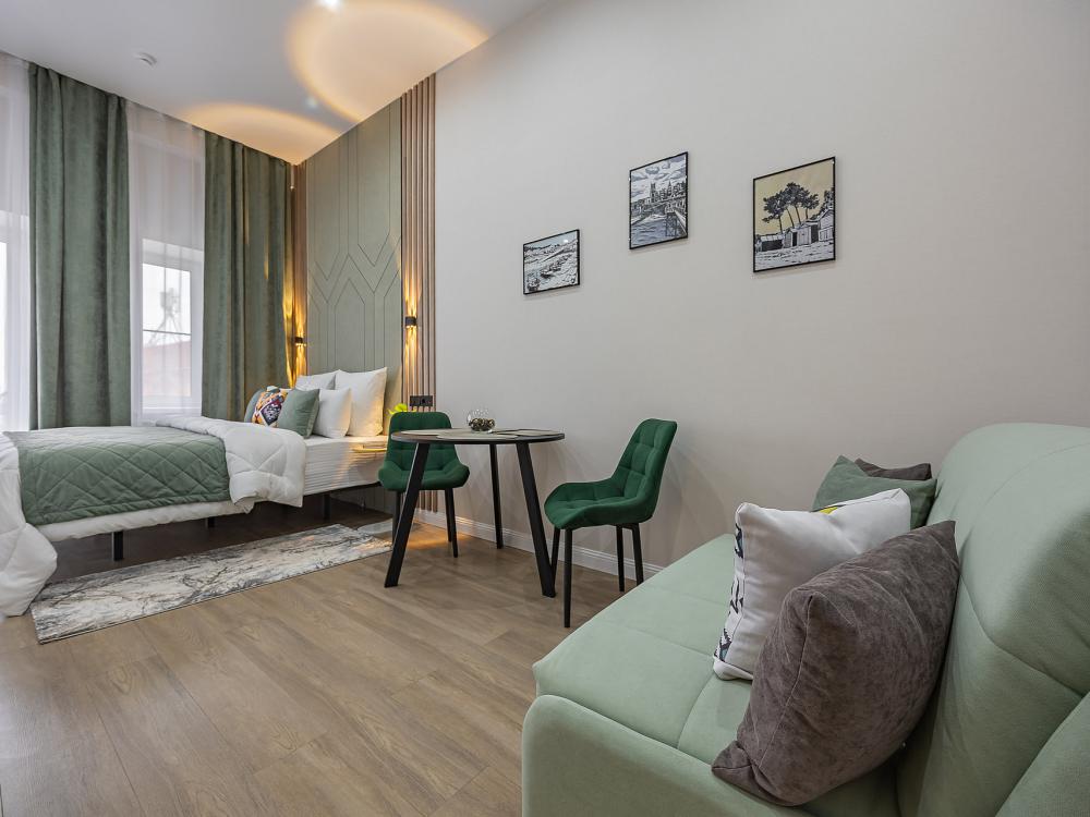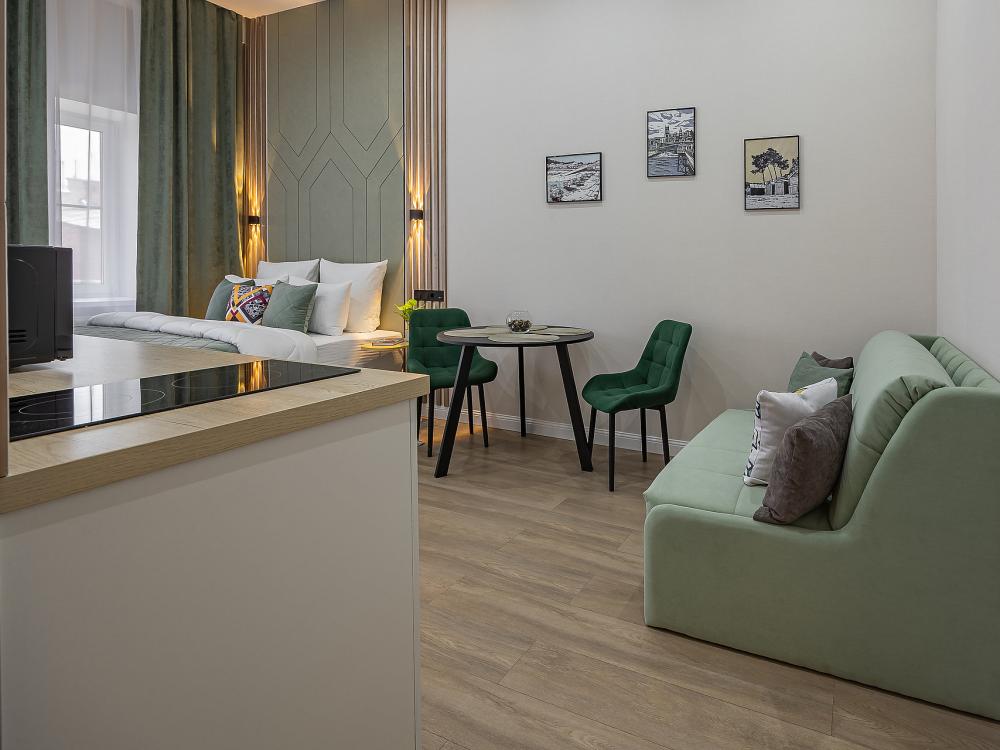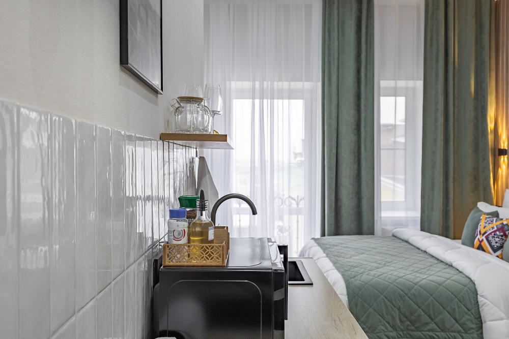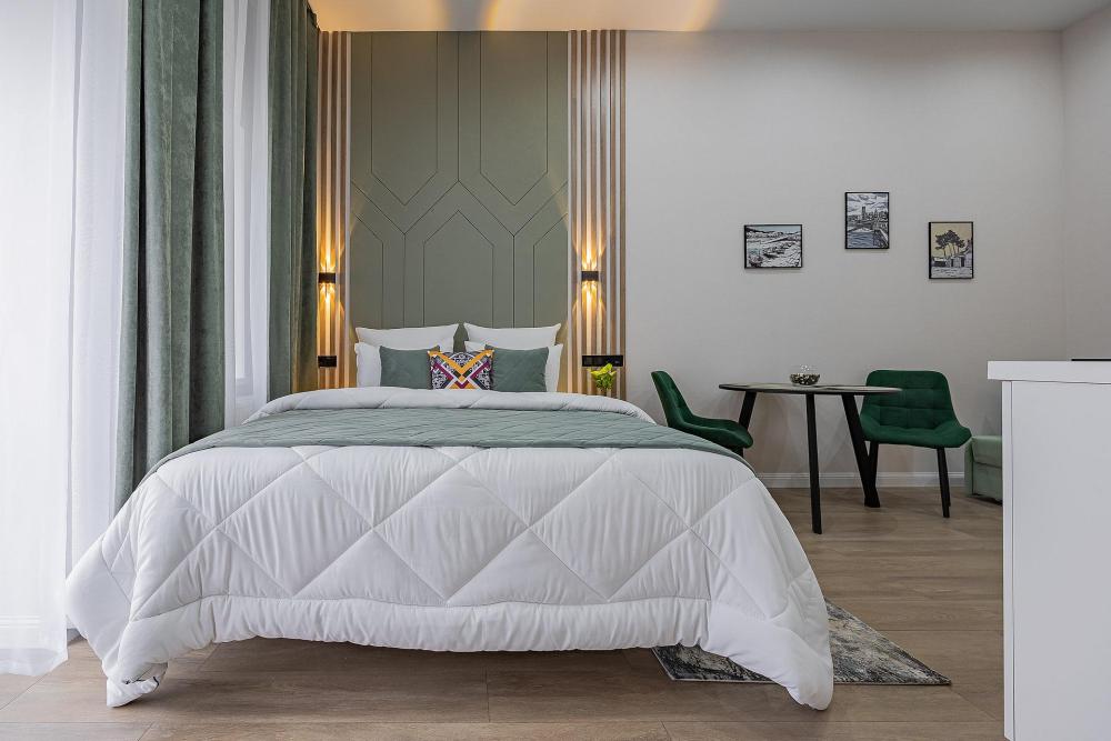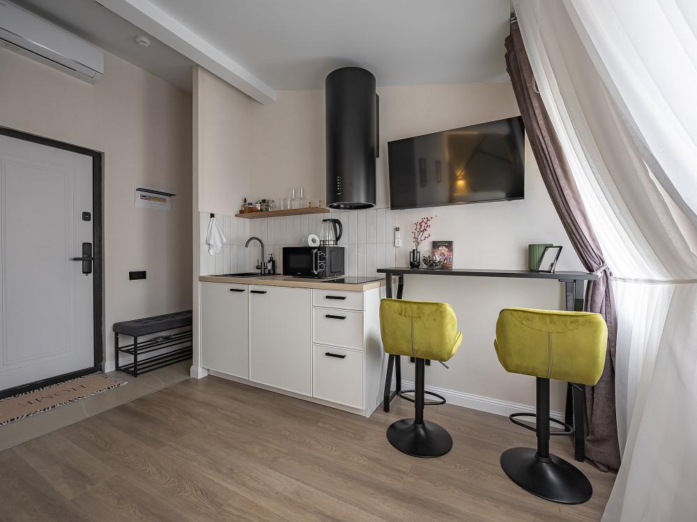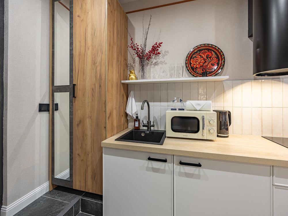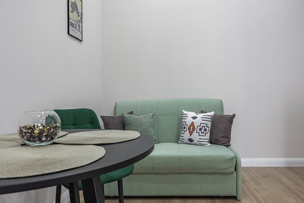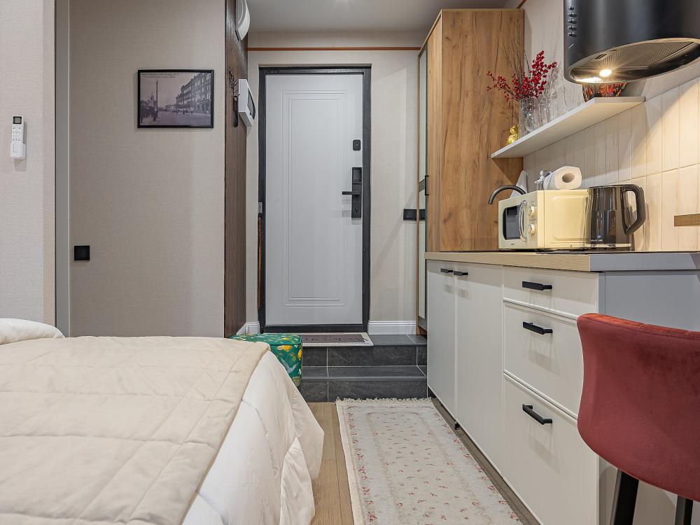 Уютная студия площадью 25 м² на 3 этаже. Идеально подходит для семьи из 3 человек, командированных или туристов, приехавших небольшой компанией, желающих насладиться комфортом. Спальные места: двуспальная кровать (160×200 см, ортопедический матрас), односпальный диван (120×200 см). Спальные комплекты: На каждую кровать и диван идет следующий комплект: 2 подушки; 2 наволочки; двуспальное одеяло; пододеяльник; простынь. Удобства: кондиционер, обеспечит вас комфортом в летний период; общественная парковка около дома; скоростной Wi-Fi для работы и развлечений; полностью оборудованная кухня (холодильник, плита, СВЧ-печь, чайник, набор посуды); стиральная машина; просторная ванная комната с душевой кабиной, мягкими полотенцами и феном; гигиенические наборы: мыло, шампунь, гель для душа, ватные палочки, ватные диски, прокладки, зубные щетки; комплимент для гостей: чай, кофе, соль, сахар, конфеты и подсолнечное масло; постельное бельё из натуральных тканей.