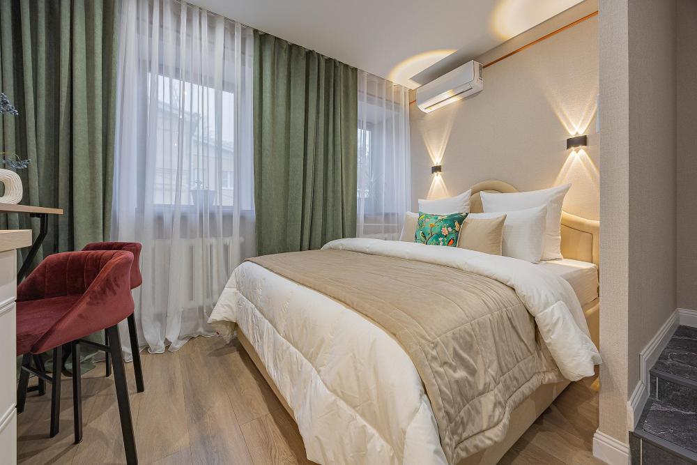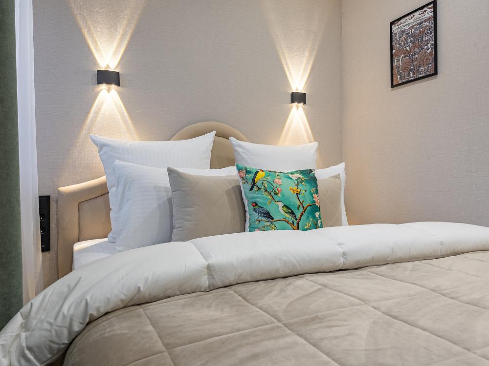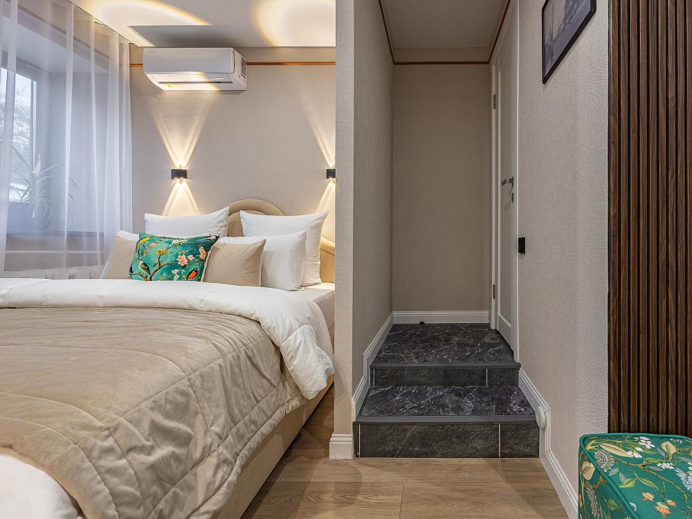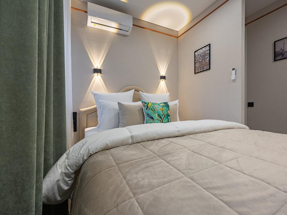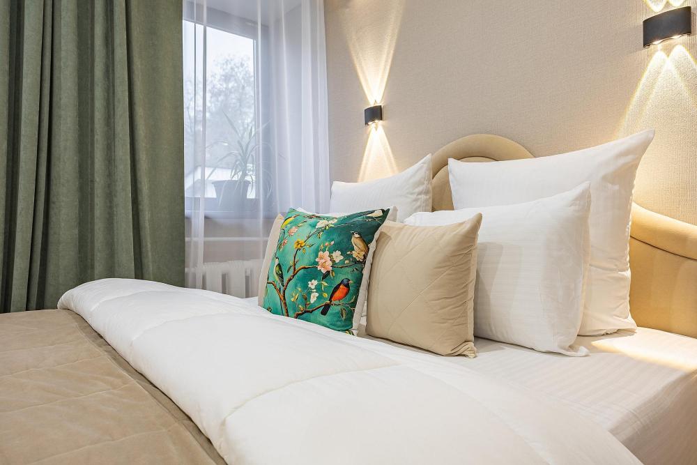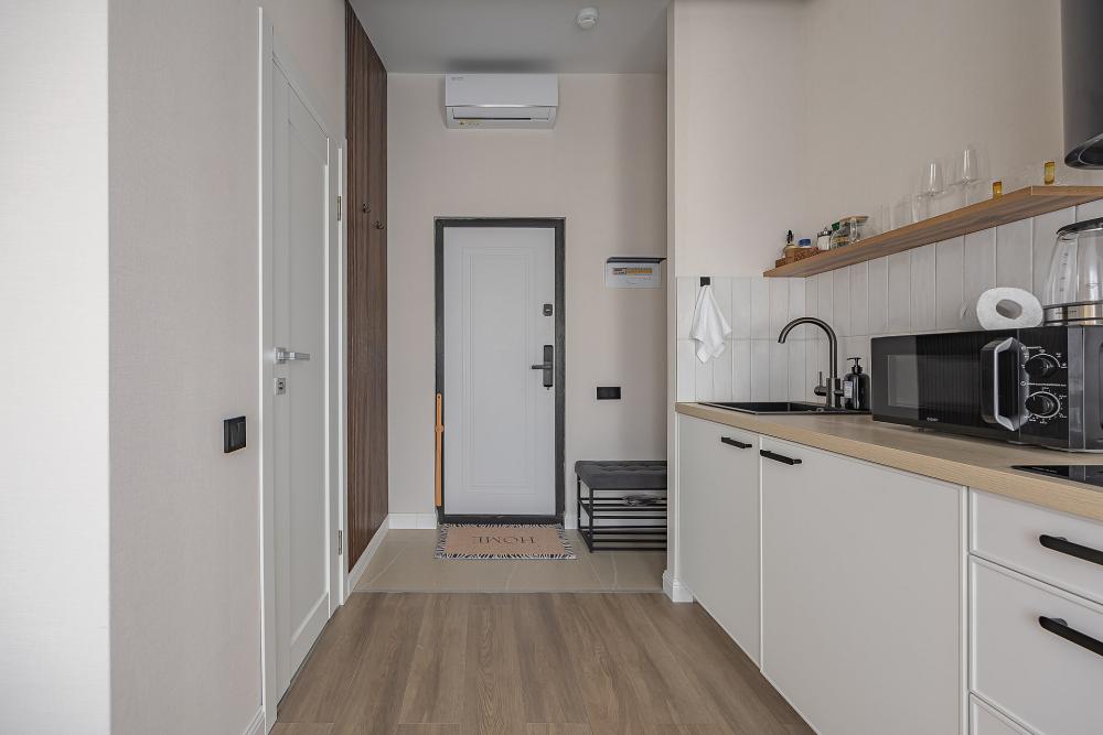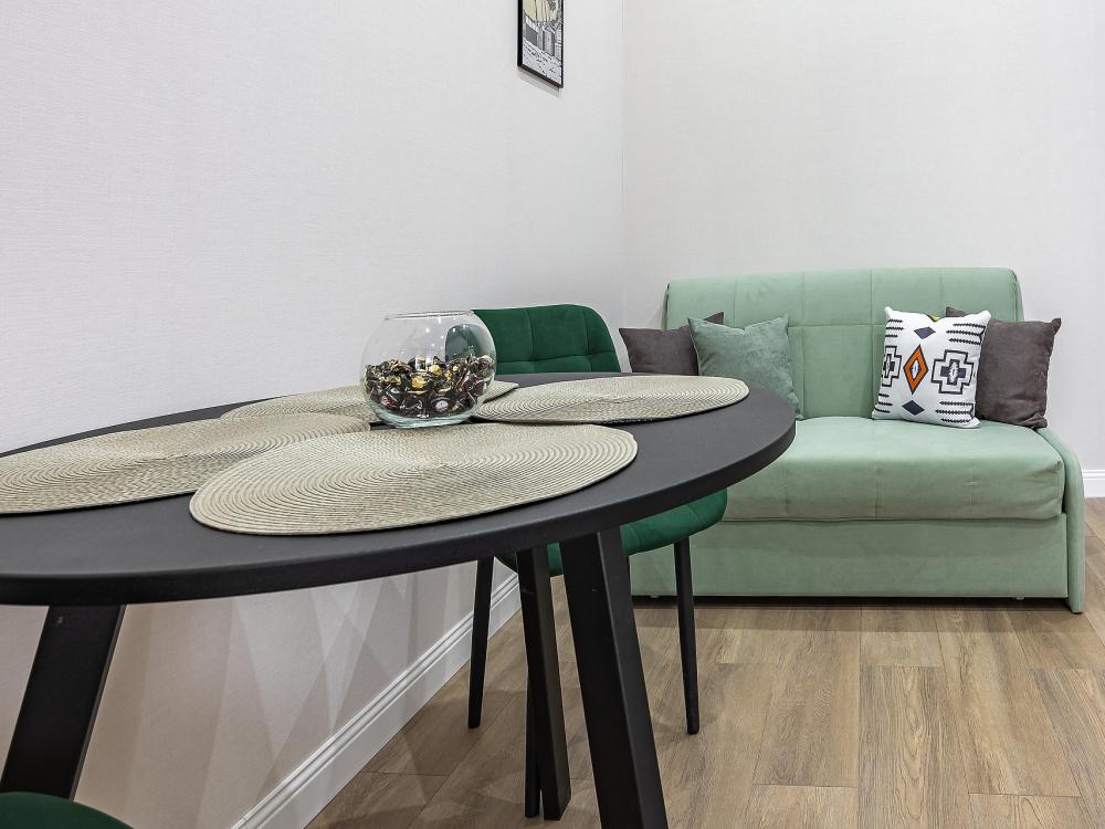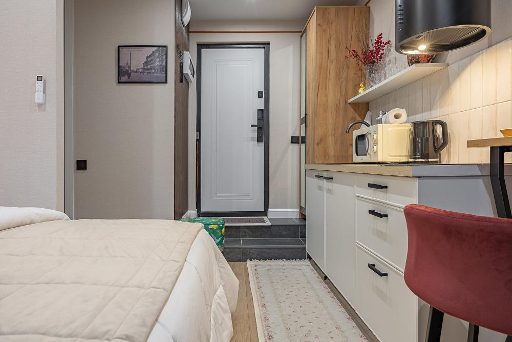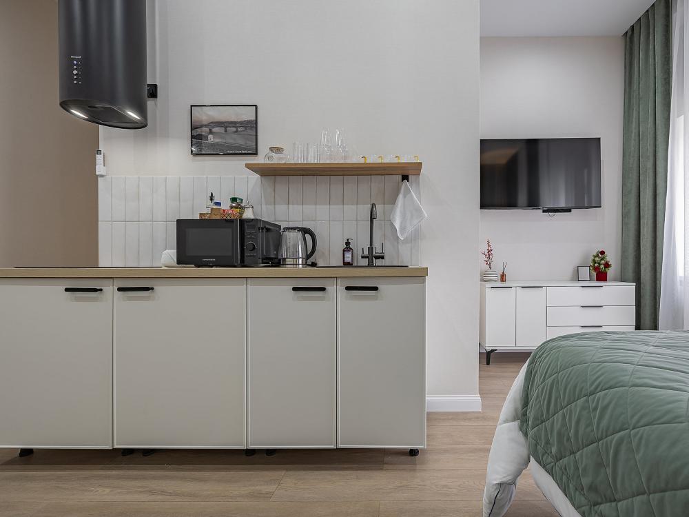 Уютная студия площадью 25 м² на 3 этаже. Идеально подходит для семьи из 3 человек, командированных или туристов, приехавших небольшой компанией, желающих насладиться комфортом. Спальные места: двуспальная кровать (160×200 см, ортопедический матрас), односпальный диван (120×200 см). Спальные комплекты: На каждую кровать и диван идет следующий комплект: 2 подушки; 2 наволочки; двуспальное одеяло; пододеяльник; простынь. Удобства: кондиционер, обеспечит вас комфортом в летний период; общественная парковка около дома; скоростной Wi-Fi для работы и развлечений; полностью оборудованная кухня (холодильник, плита, СВЧ-печь, чайник, набор посуды); стиральная машина; просторная ванная комната с душевой кабиной, мягкими полотенцами и феном; гигиенические наборы: мыло, шампунь, гель для душа, ватные палочки, ватные диски, прокладки, зубные щетки; комплимент для гостей: чай, кофе, соль, сахар, конфеты и подсолнечное масло; постельное бельё из натуральных тканей.