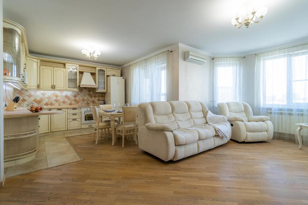 Просторная кухня гостиная с большим ТВ и мягким диваном и 2 креслами белого цвета