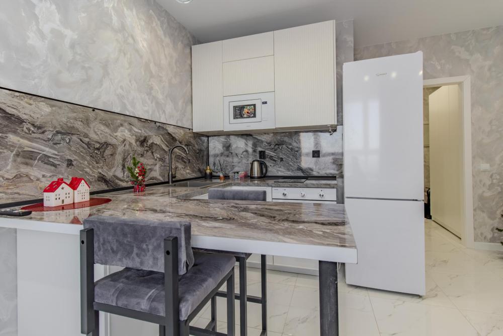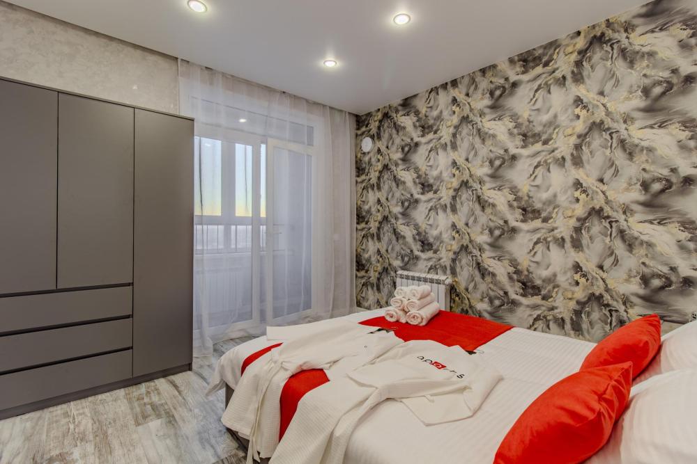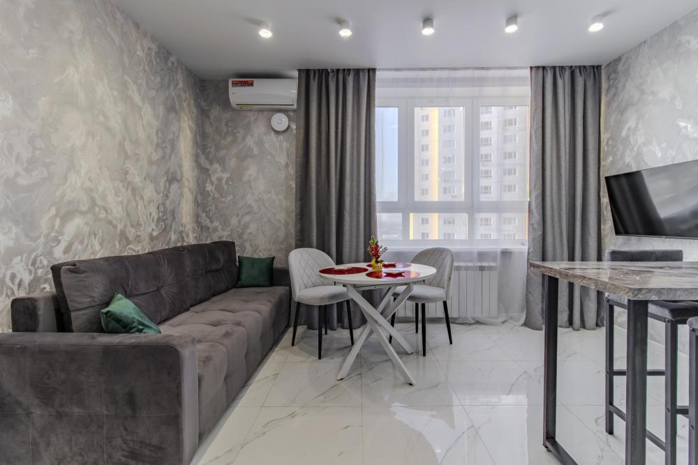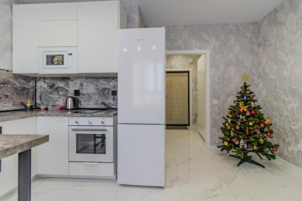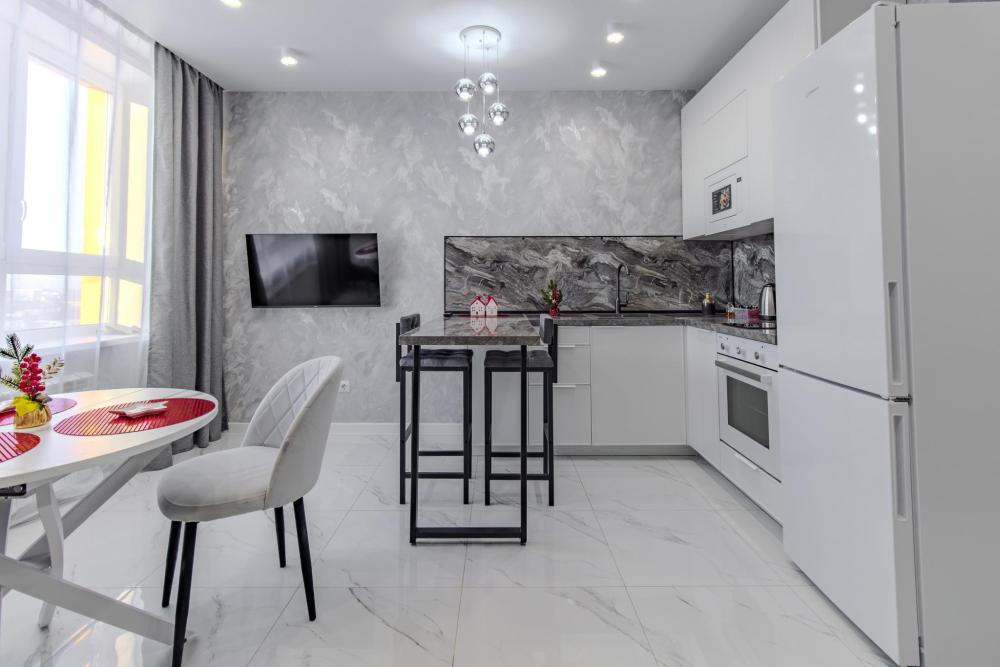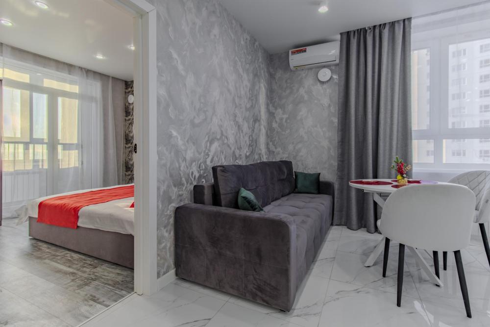 ЧТО ЕСТЬ В КВАРТИРЕ : • Вся необходимая бытовая техника (посуда, стиральная машинка, холодильник, телевизор, утюг, микроволновая печь, чайник, фен, кондиционер). • Удобная укомплектованная кухня с обеденной зоной. • Широкая двуспальная кровать с чистым белым постельным бельем для крепкого сна. • Комфортный двуспальный диван. • Опрятная и просторная ванная комната + свежие полотенца и халаты, средства гигиены.