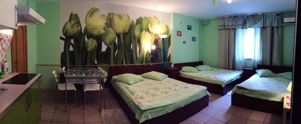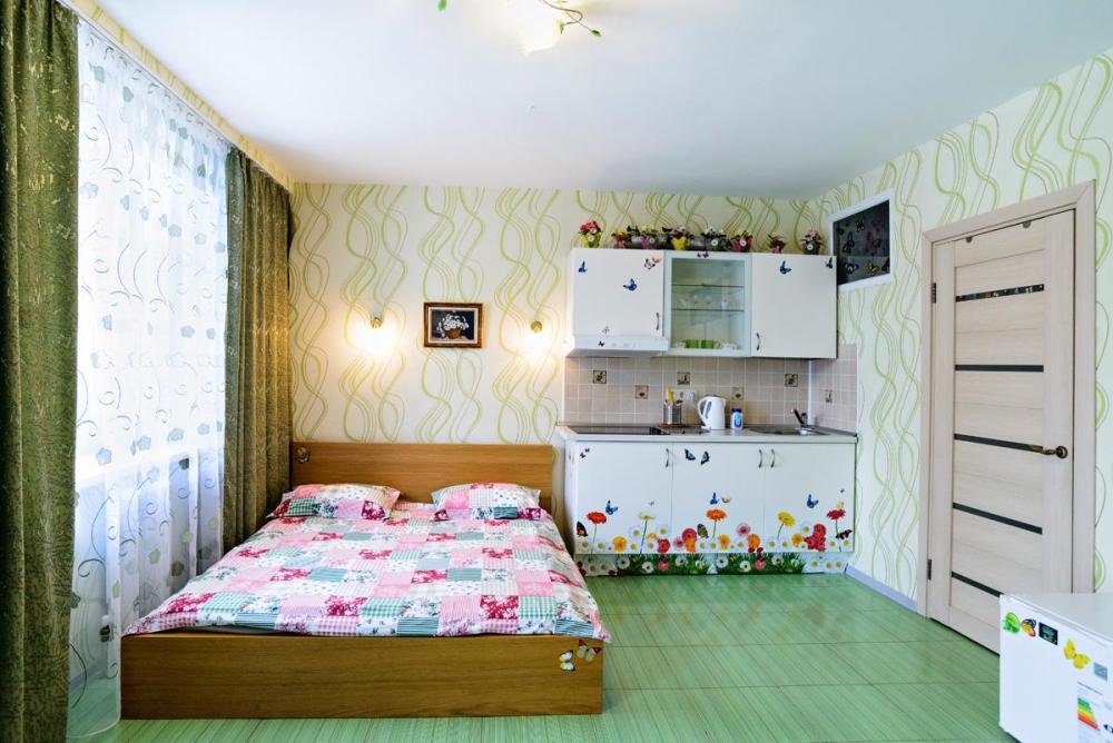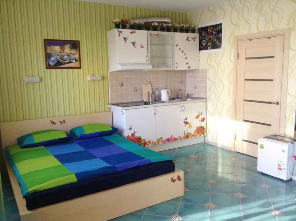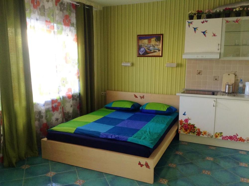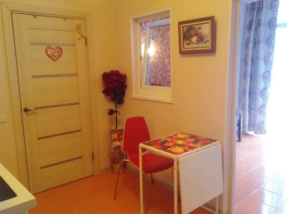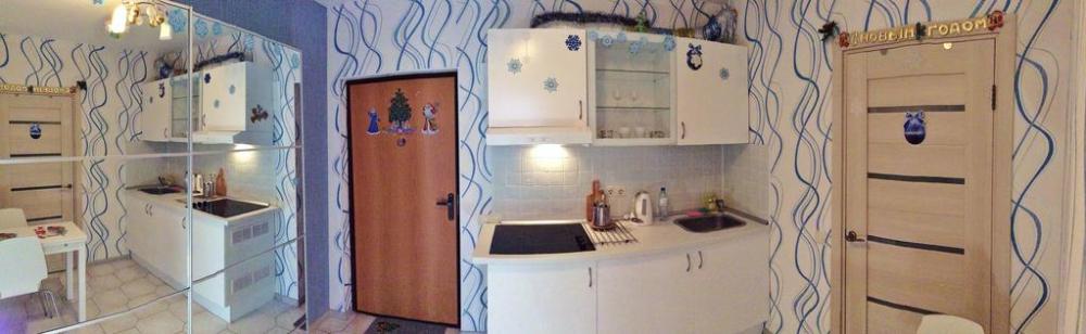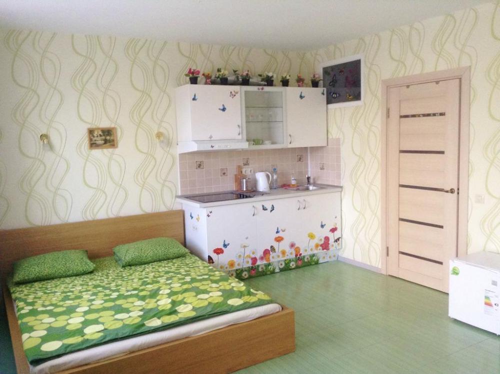 Комната с кухней, балконом, туалетом и душевой кабиной. В комнате: теплые полы, одна двуспальная кровать, просторный гардероб, универсальный стол, кондиционер (сплит-система), холодильник, ЖК телевизор, TV(67 каналов), Wi-Fi, фен, большое зеркало, косметическое зеркало, посуда.