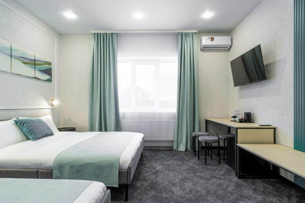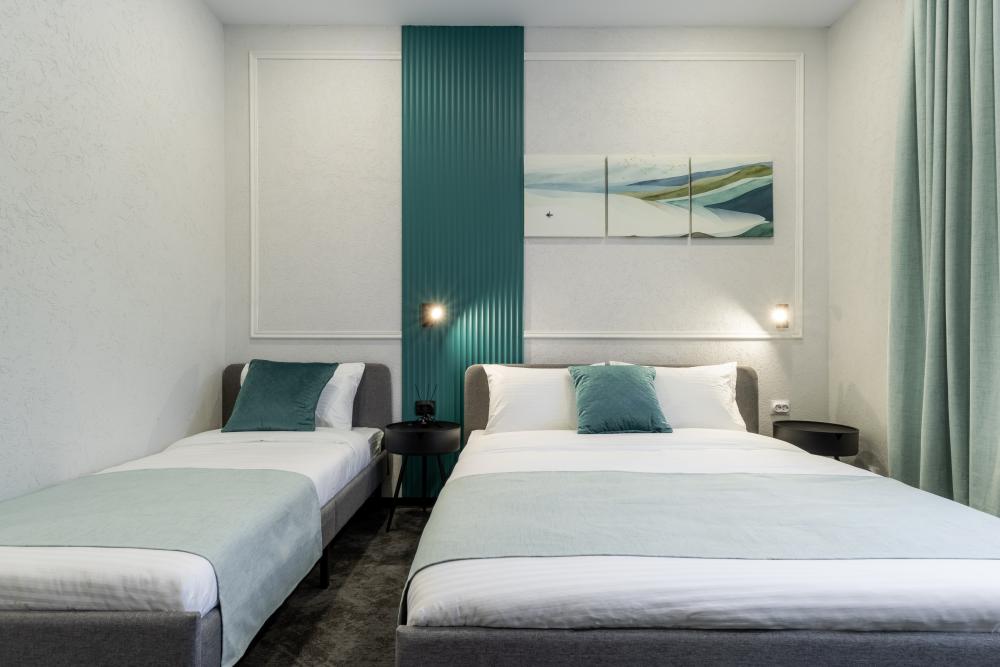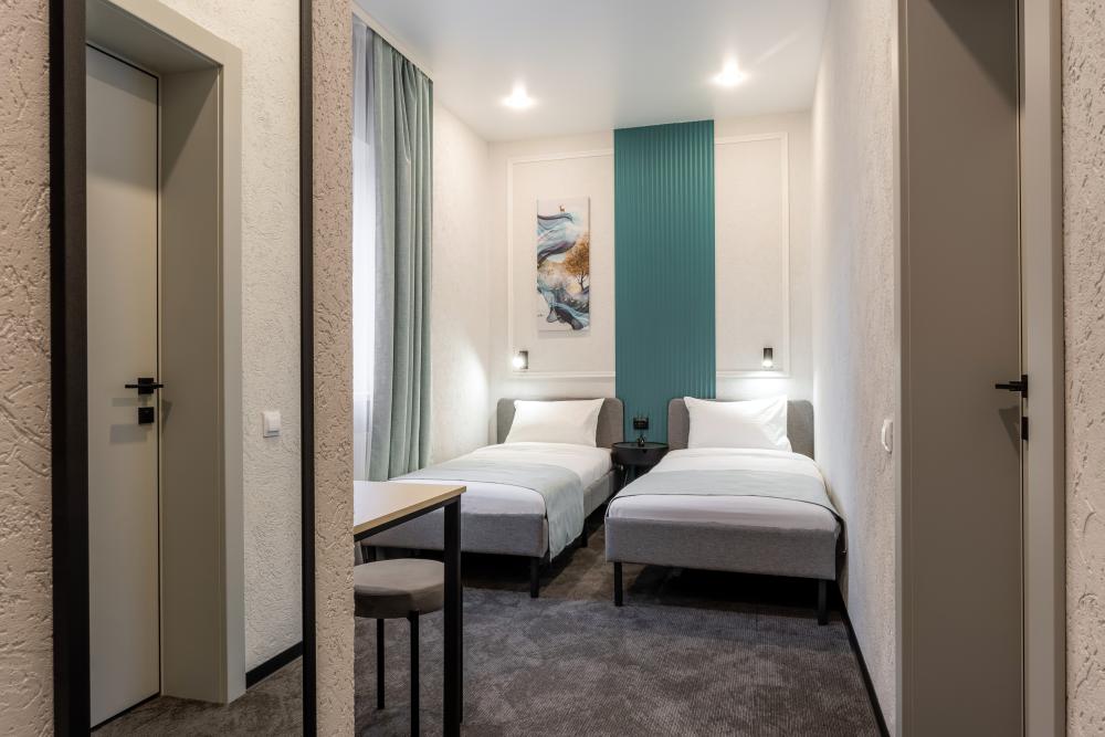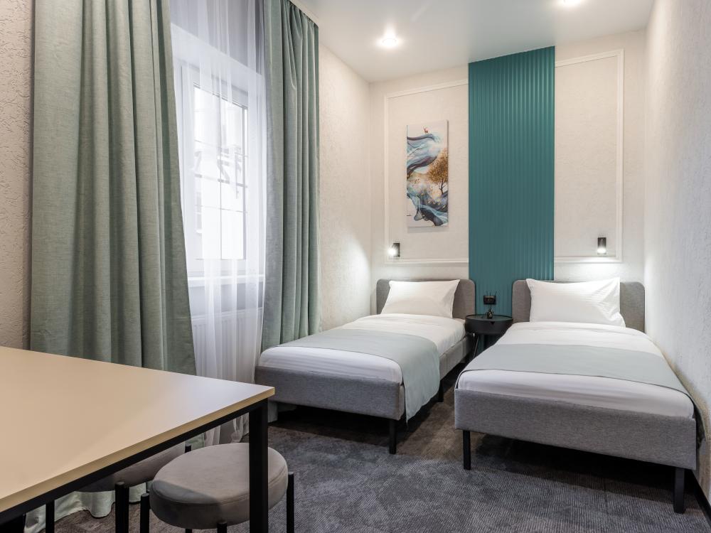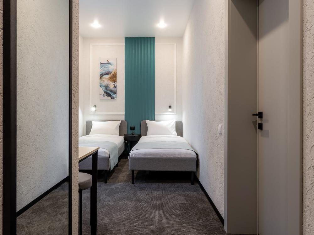 Комната стандарт с 2 односпальными кроватями. Благодаря шторам «Blackout», здесь хорошо отдыхать после дороги, высыпаться без лишнего шума и начинать день без спешки. Каждая комната оснащена: душем, косметическими принадлежностями, телевизором, бесплатным wi fi, кондиционером, сейфом, холодильником и чайным набором.