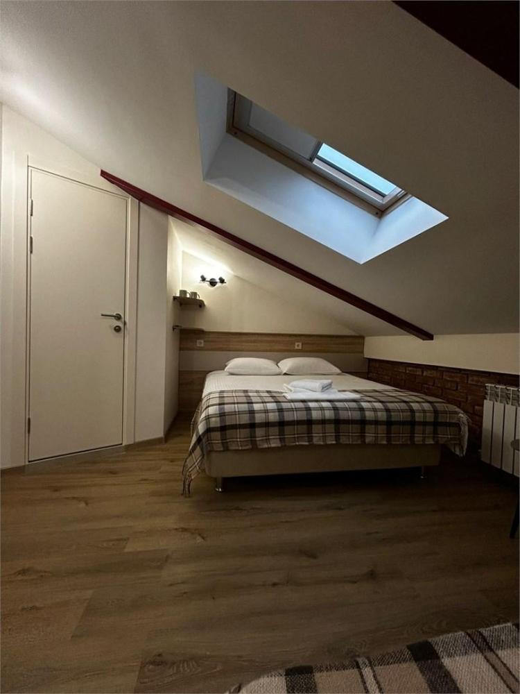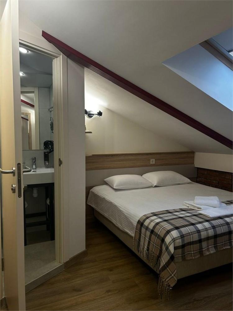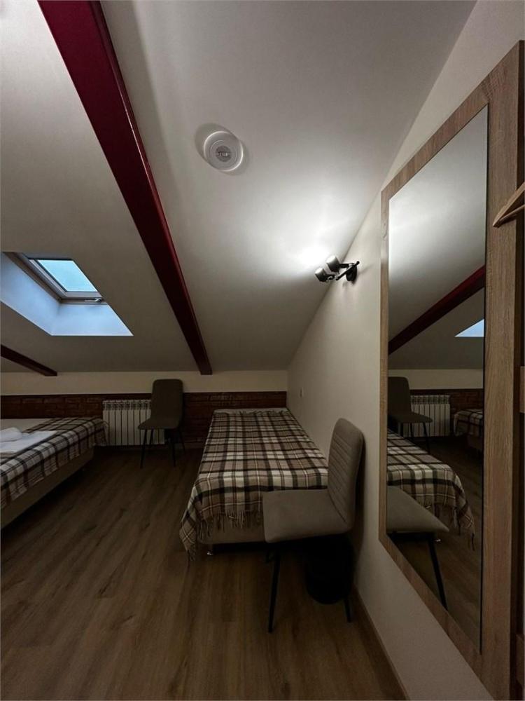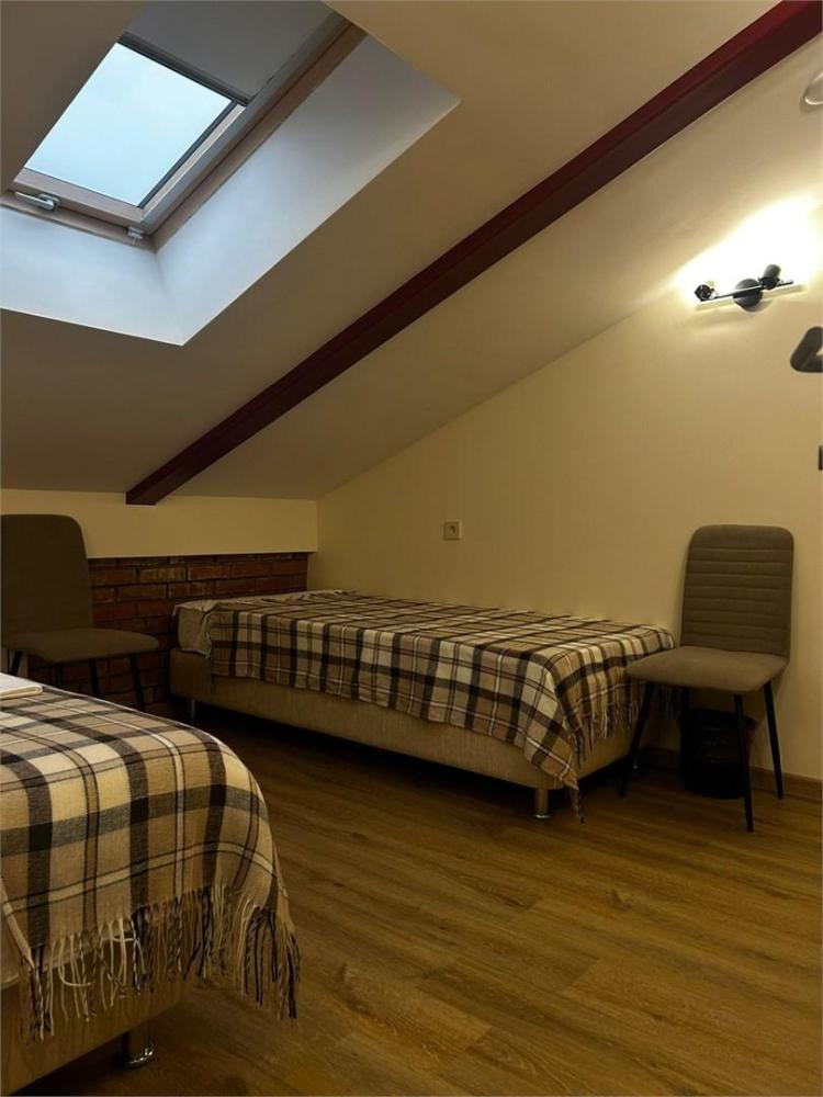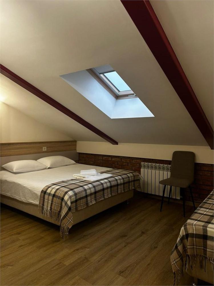 Номер на 3-м этаже с мансардным окном. Окно оснащено светонепроницаемыми шторами. В номере кровать 160*190 см и кровать 90*200 см. Площадь номера 17 кв.м.