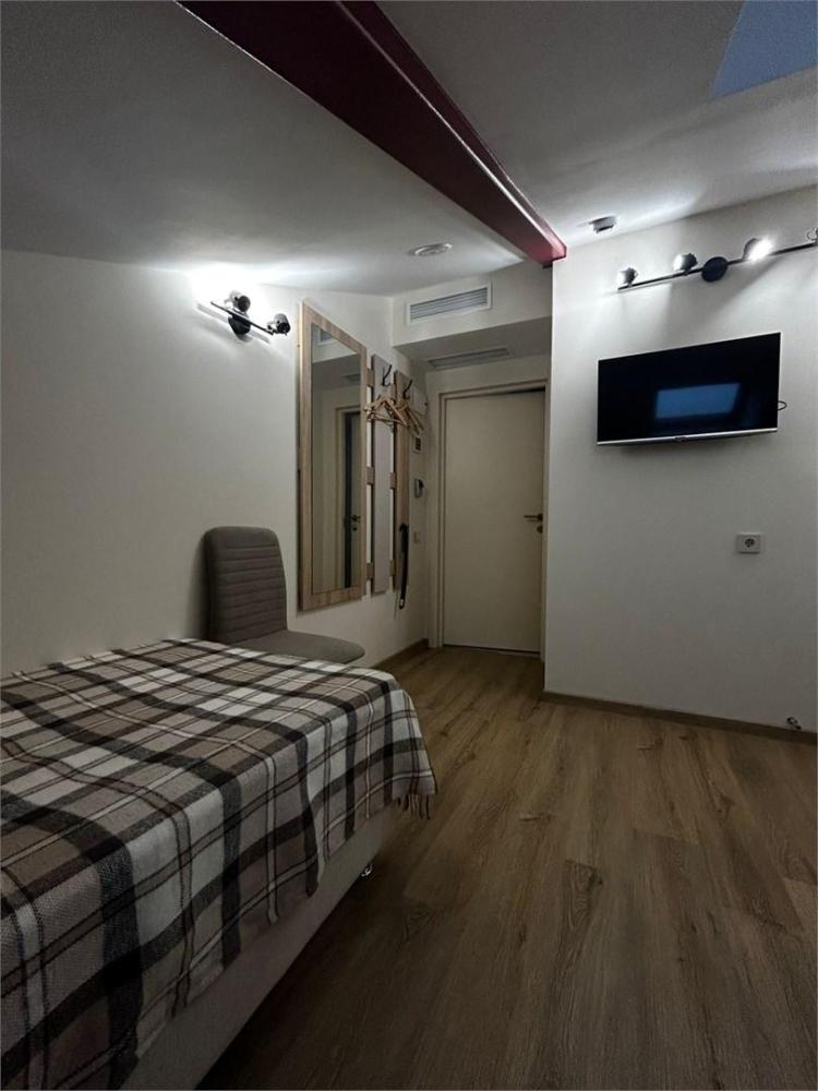 Номер площадью 22 м2. В номере кровать 160*190 см и раскладной диван. Номер оснащен общей системой кондиционирования и вентилирования, кроватями c ортопедическими матрасами, шторами blackout. В номере есть телевизор с плоским экраном, сан.узел, шкаф для одежды, зеркало, тумбочки, стол, стулья, полки, мини холодильник, набор посуды, чайник.