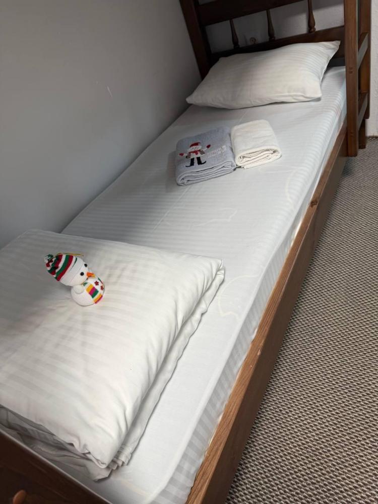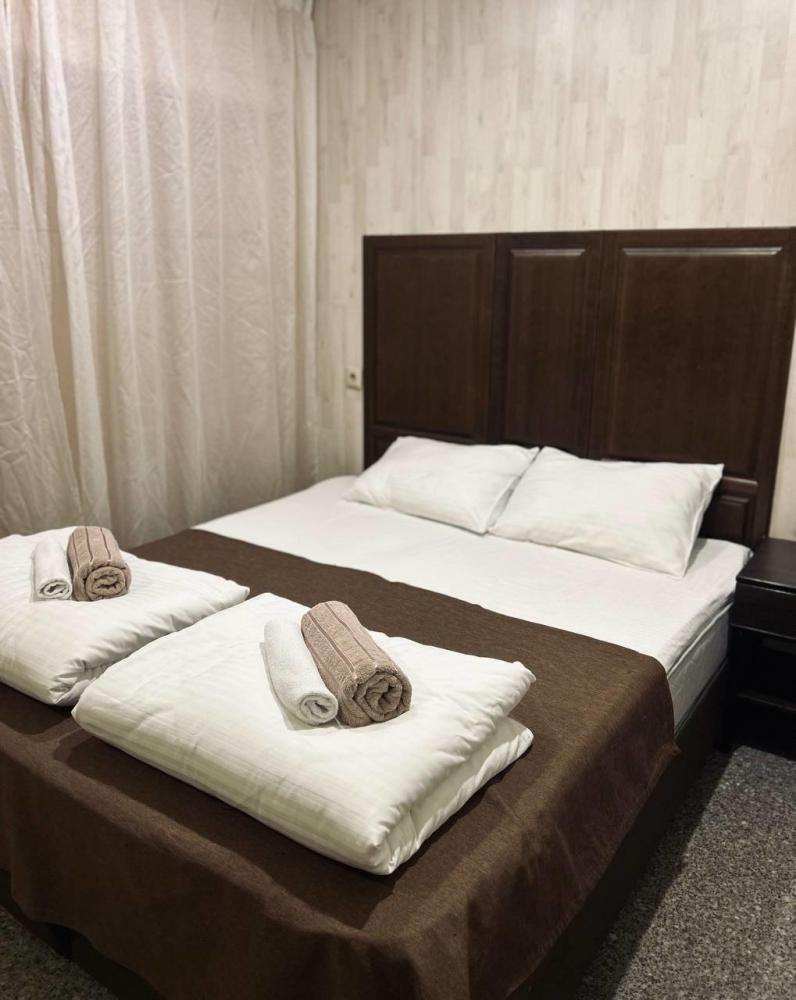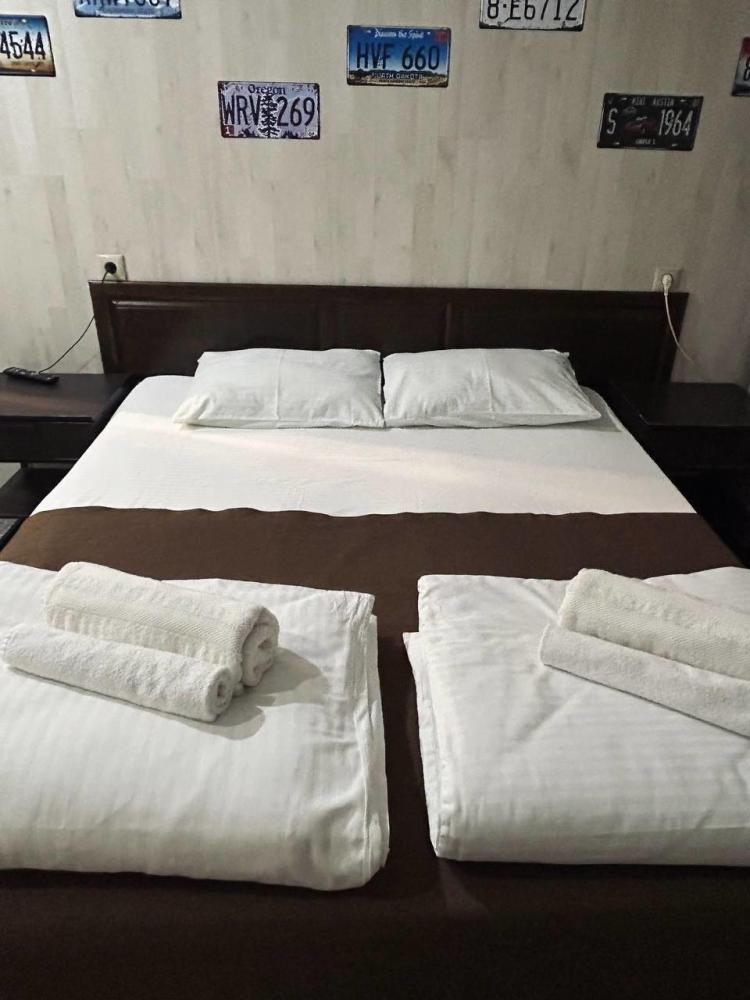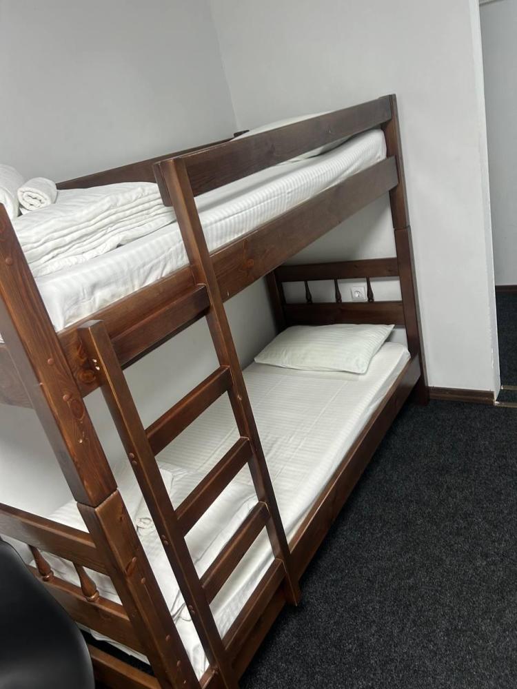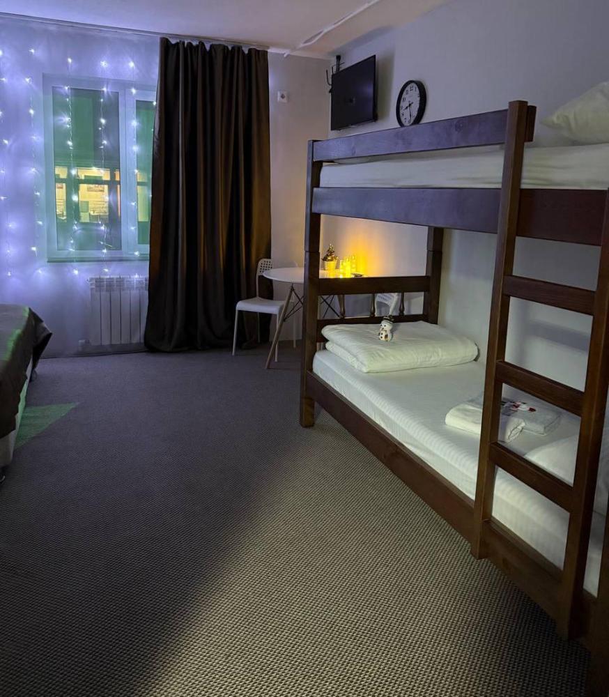 Номер люкс общей площадью 26 кв.м. для размещения до 4-х гостей. Для комфортного проживания гостей номер оснащен всем необходимым: двухспальная кровать, двухъярусная кровать, прикроватные тумбочки, телевизор, кондиционер, зеркало, чайник, холодильник, микроволновая печь, посуда, ванная комната с душем, фен, набор полотенец.