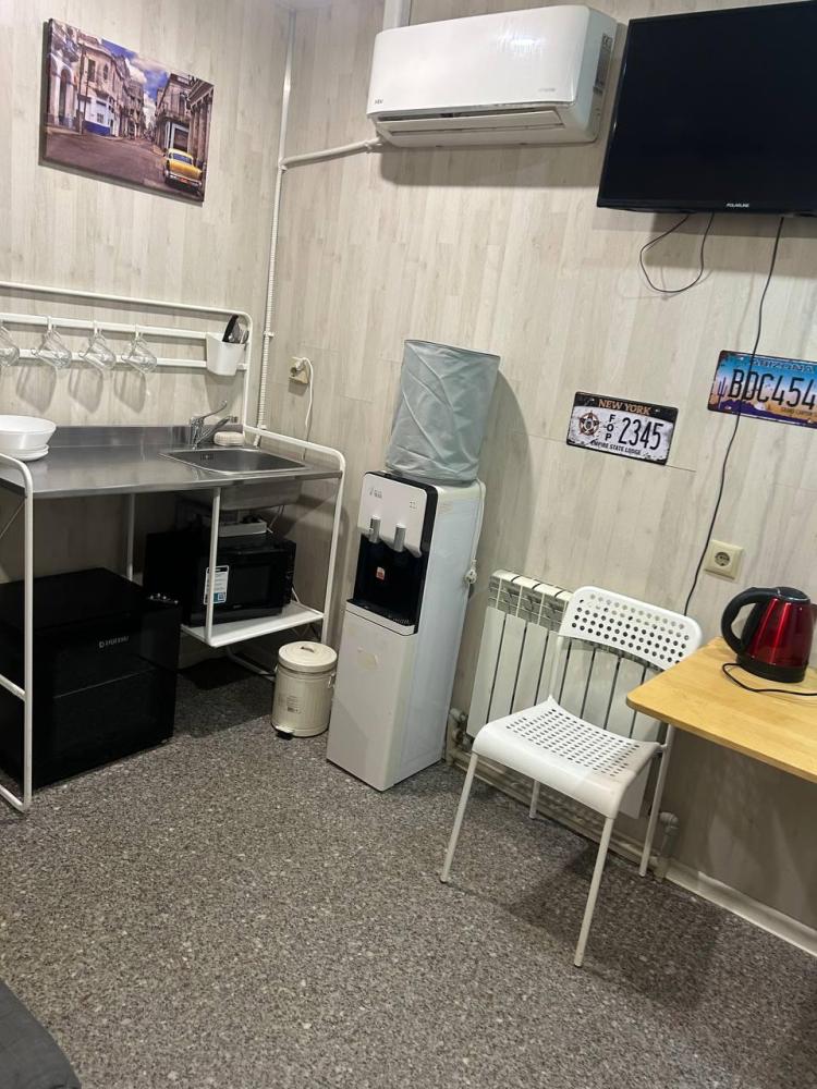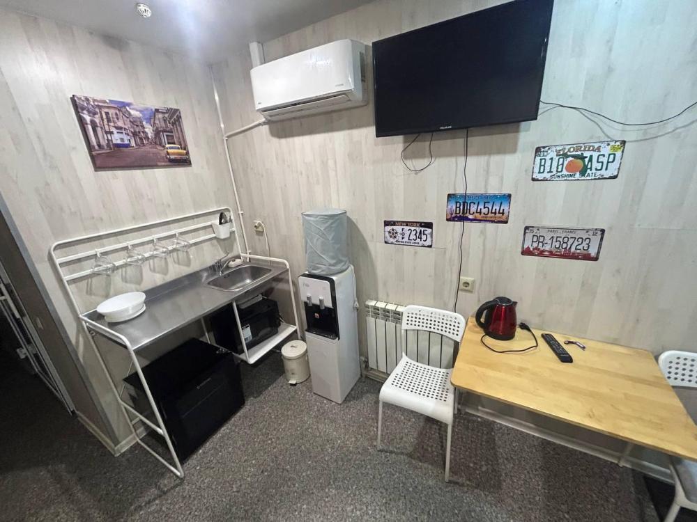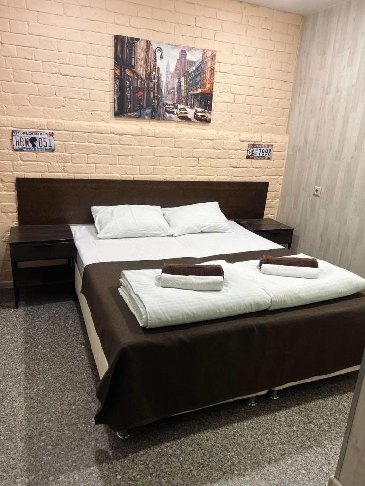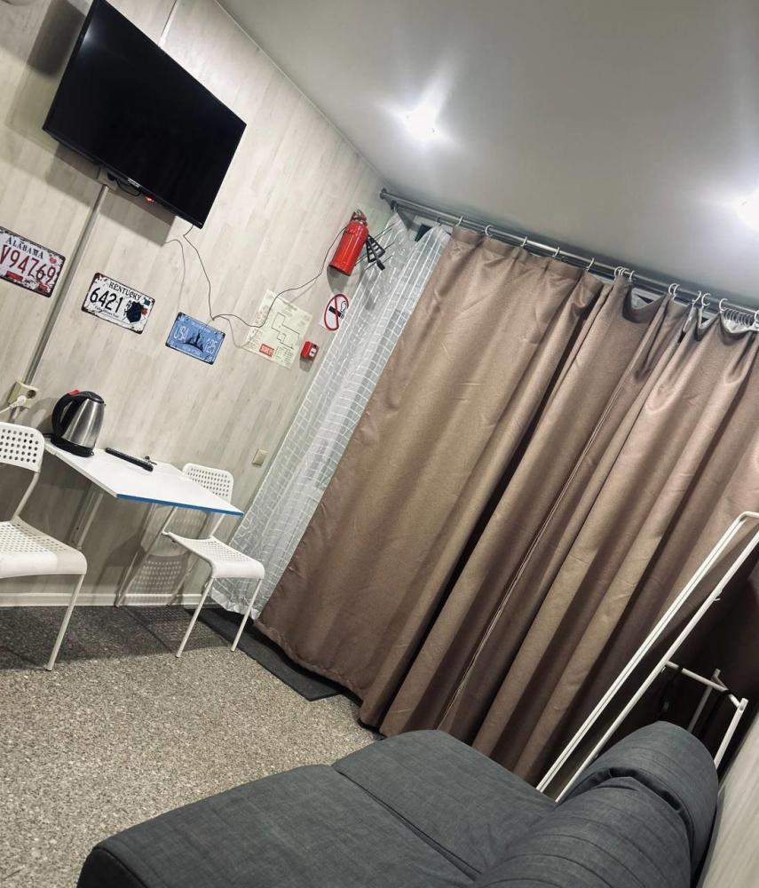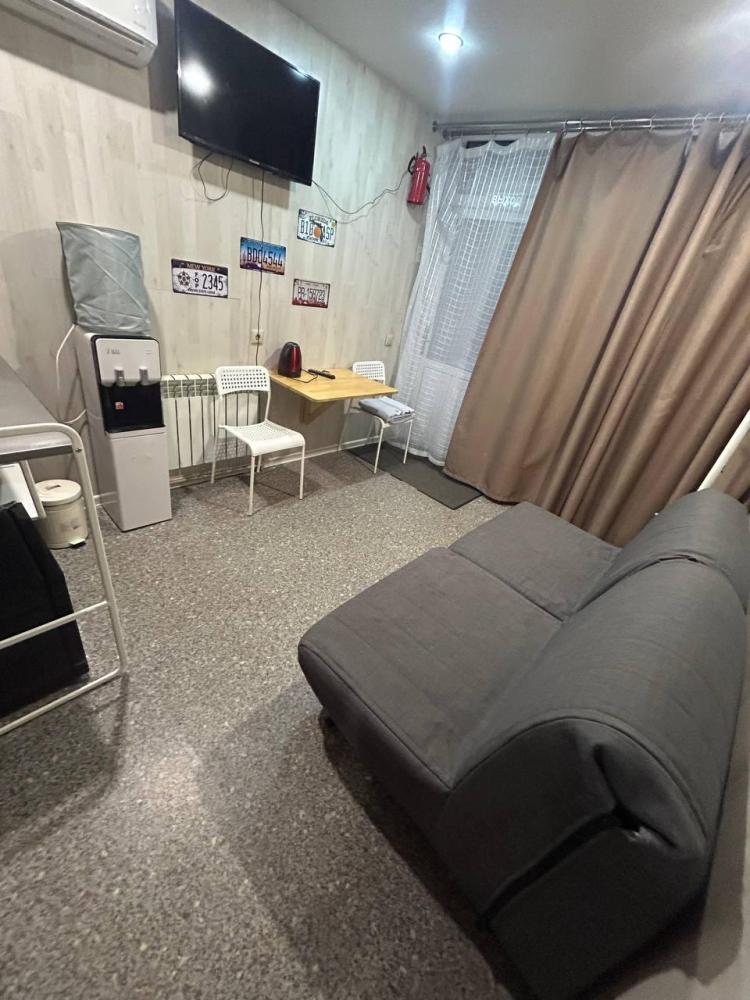 Номер студия общей площадью 24 кв.м. для размещения до 6-ти гостей (с учетом дополнительных мест). Для комфортного проживания гостей номер оснащен всем необходимым: двухспальная кровать, двухъярусная кровать, прикроватные тумбочки, телевизор, кондиционер, зеркало, чайник, холодильник, микроволновая печь, посуда, ванная комната с душем, фен, набор полотенец.