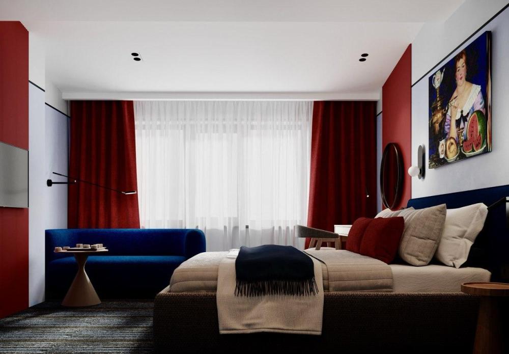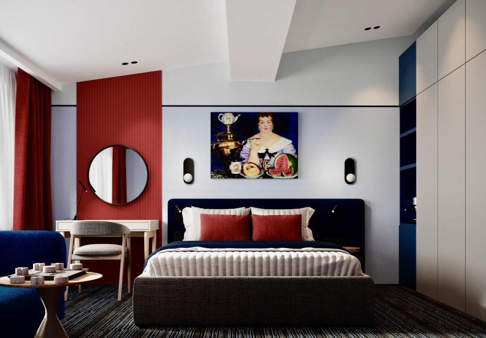 Номер создан для гостей, которые ценят современный дизайн и комфорт. Интерьер оформлен в выразительной цветовой палитре с акцентами тёплого красного и глубокого синего, что создаёт атмосферу уюта и лёгкой элегантности. В центре комнаты — удобная двуспальная кровать с мягким изголовьем и качественным текстилем. Рабочая зона с зеркалом и стильным освещением подойдёт как для деловых поездок, так и для отдыха. Номер оснащён всей необходимой техникой и мебелью, а продуманное зонирование делает пространство функциональным и комфортным. Это отличное решение для тех, кто ищет современный номер с характером и комфортом в самом сердце города.