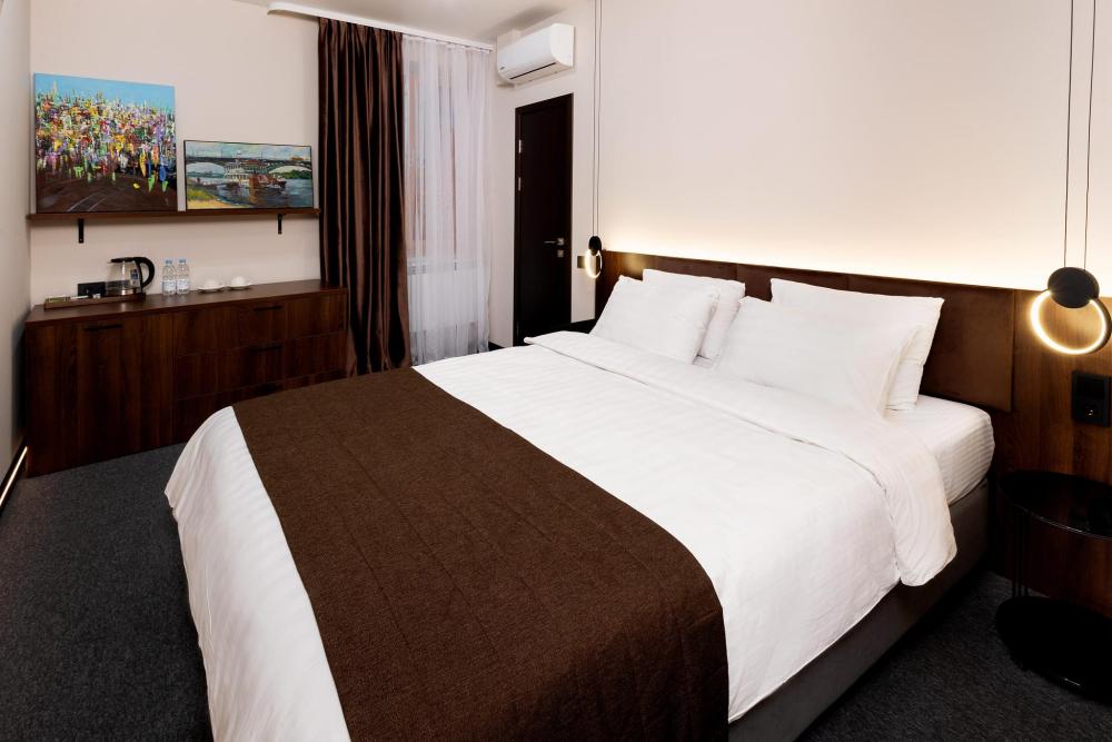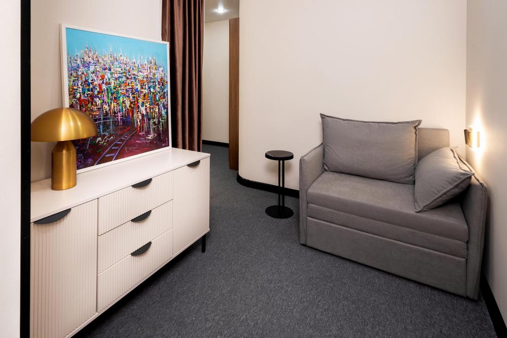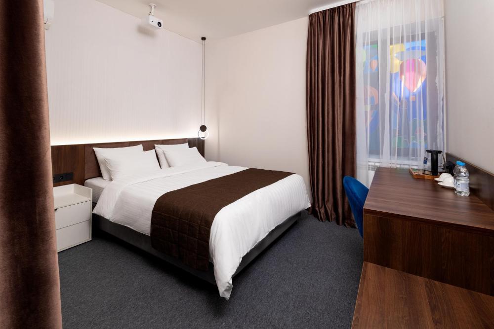 Просторный номер площадью 22 кв.м. Окна обращены в тихий спальный район города. Номера оснащены всем необходимым для комфортного отдыха и плодотворной работы. Двухместный номер с одной большой кроватью для размещения 1, 2 или 3 гостей.. Возможно дополнительное место.