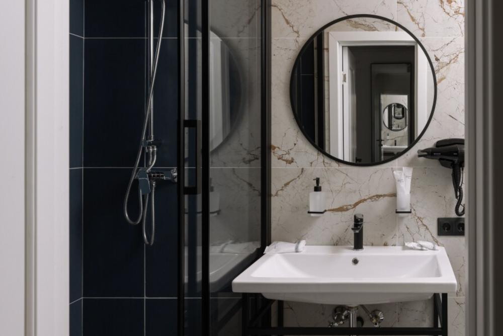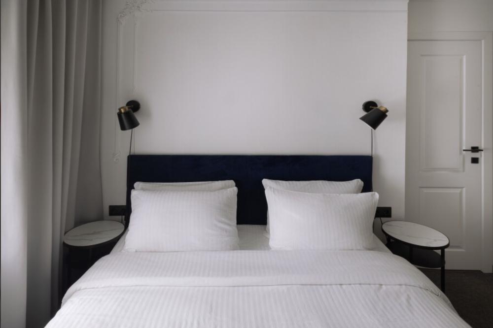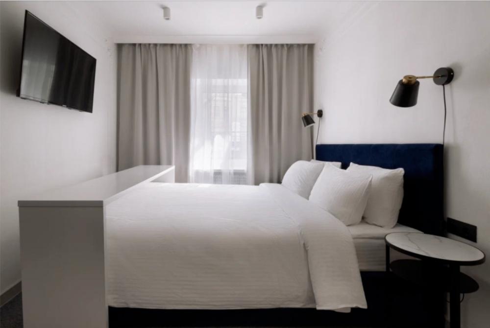 Уютный двухместный номер площадью с двуспальной кроватью (180 см на 200см), а также с кондиционером, электрическим чайником и телевизором, капсульной кофемашиной и камином. Номер расположен на мансарде. Из окон открывается вид на центральную улицу Большая Покровская.