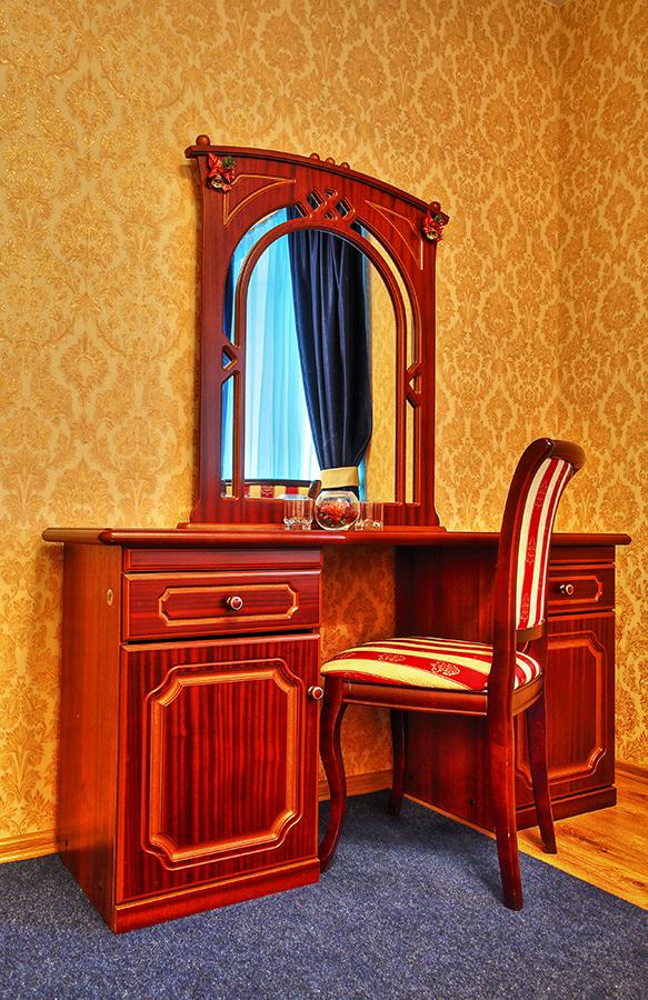 В ванной комнате: Душевая кабина, раковина, зеркало, набор полотенец (банное, для лица, для ног), гигиенические средства, косметические средства, косметические средства за дополнительную плату, тапочки. Удобства в номере: Кровать размером 160х200 см, индивидуальная система кондиционирования, собственная система отопления Buderus, высокие потолки, холодильник, гардеробный шкаф с зеркалами во весь рост, ковровое покрытие, прикроватная тумба, телевизор, телефон (для связи с администратором), фен, термометр, информационная карта.