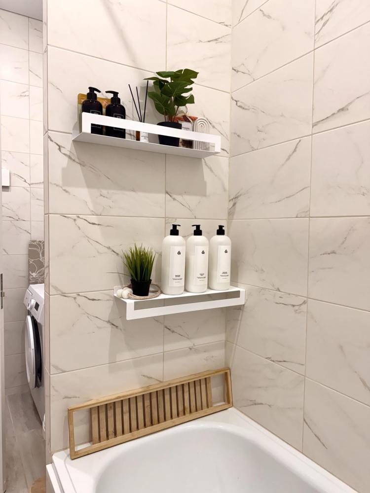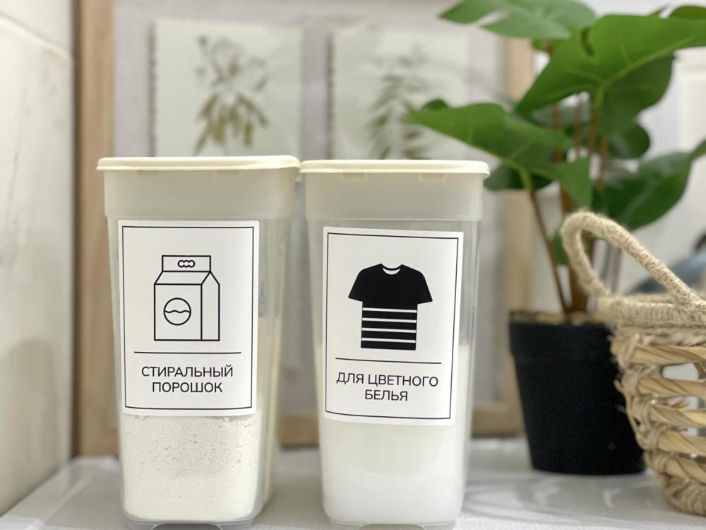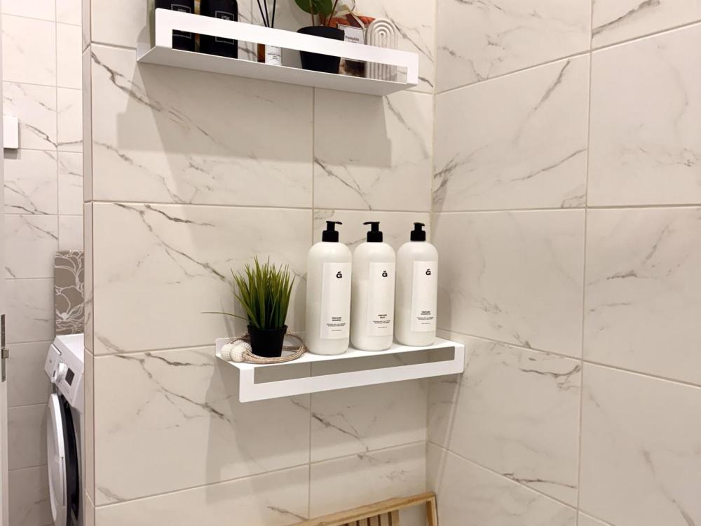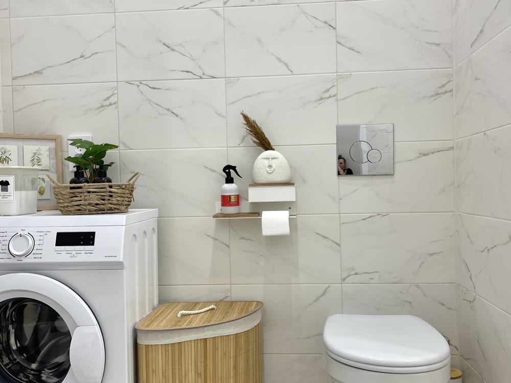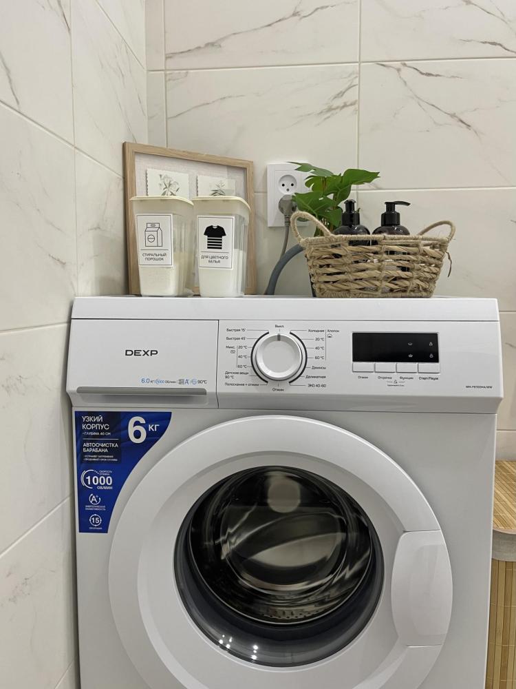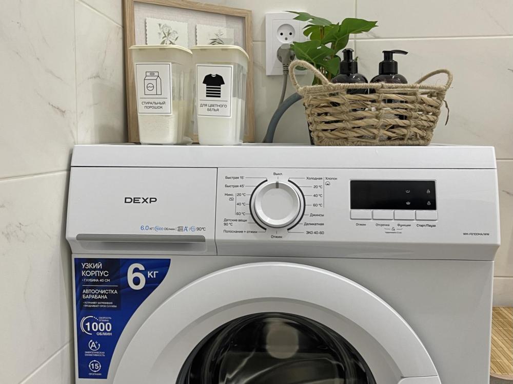 Стиральная машинка, средства для стирки, корзина для белья, сушилка на стене.