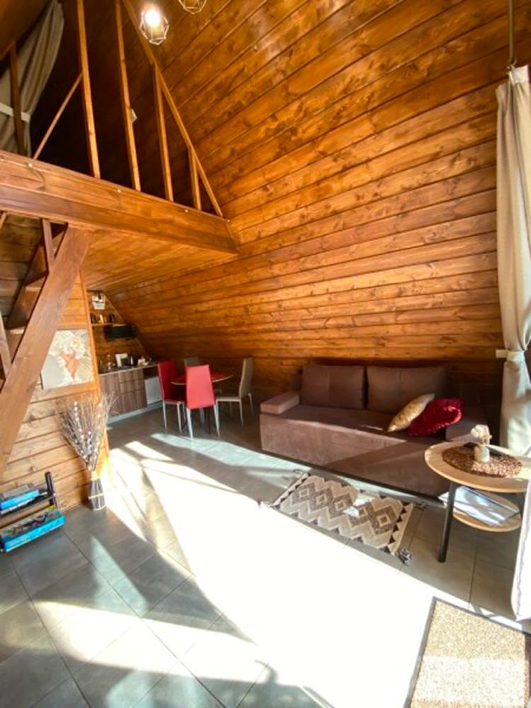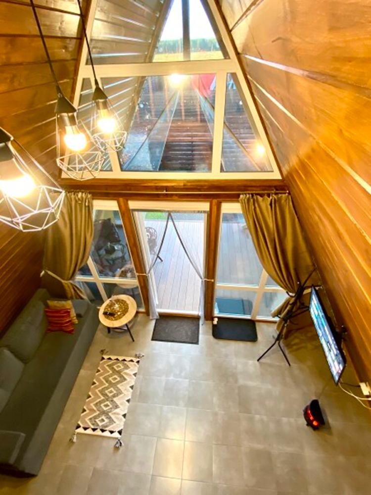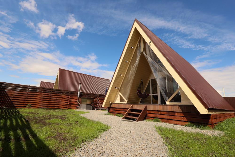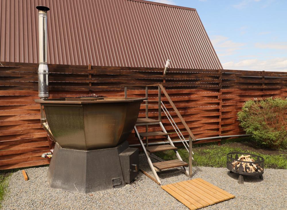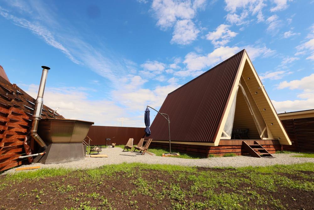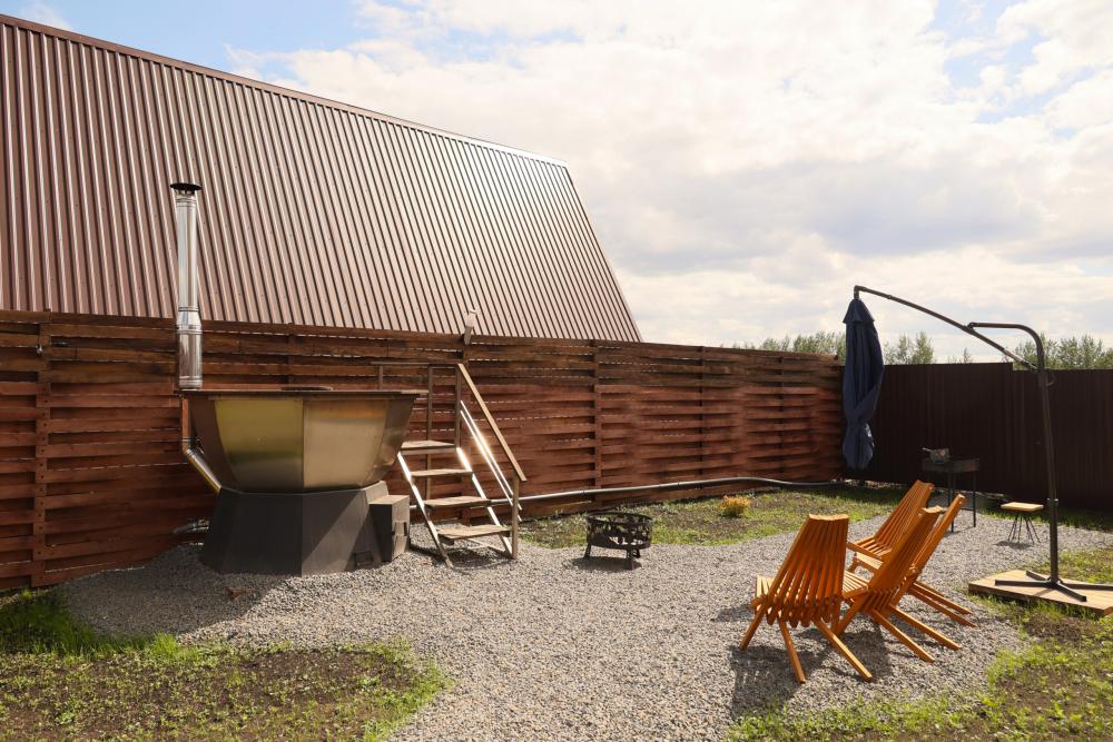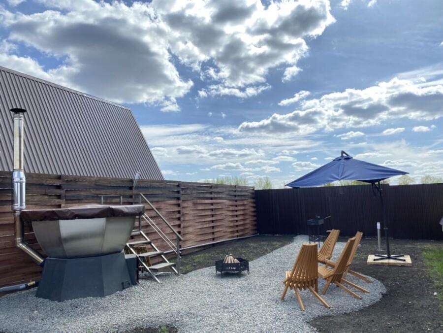Домик A-FRAME с сибирским чaном. На территории домика установлен сибирский банный чан — идеальный способ расслабиться и восстановить силы после прогулок на свежем воздухе. В домике есть все необходимое : двуспальная кровать с ортопедическим матрасом (180×200), раскладной двуспальный диван (140×200),по запросу предоставляется детская кроватка-манеж (бесплатно); кухня полностью оборудована: индукционная плита, холодильник, микроволновка, чайник, посуда, масло, специи, чай, кофе, каши, мюсли; ванная комната: душевая, туалет, фен, халаты, тапочки, полотенца и индивидуальные средства гигиены. Приватный участок с костровой и мангальной зоной. Уютная закрытая терраса с мебелью из ротанга. Место для отдыха у костра и обеденная зона на свежем воздухе В стоимость аренды баня, чан и SPA не входят